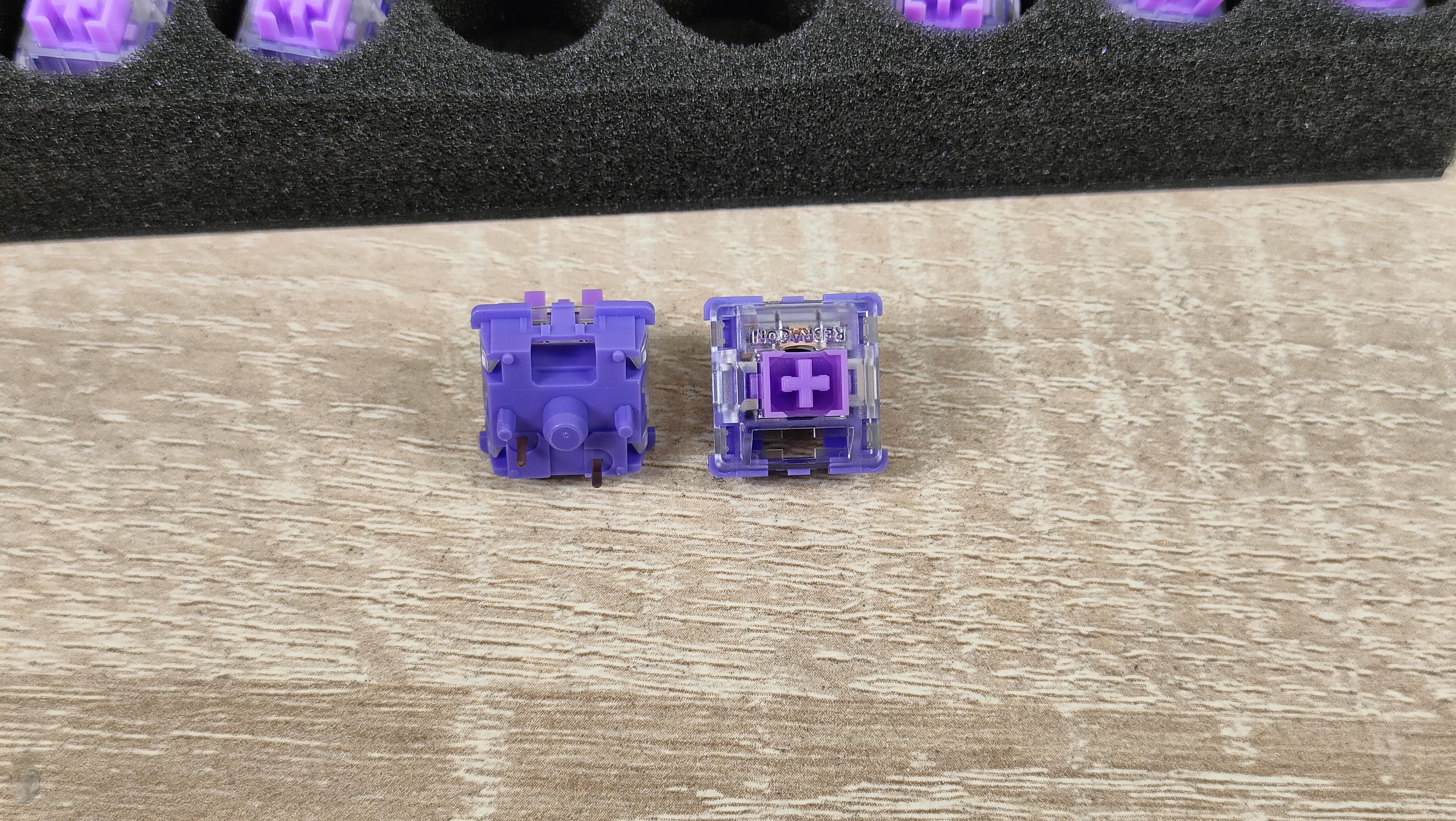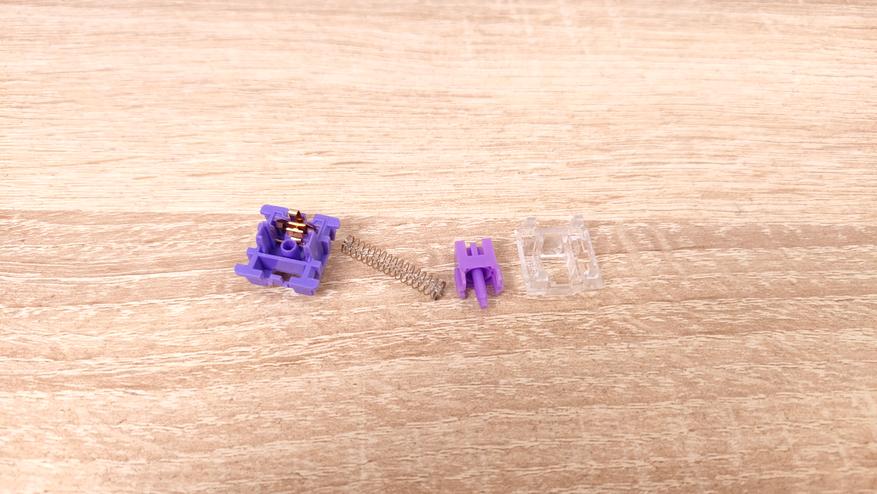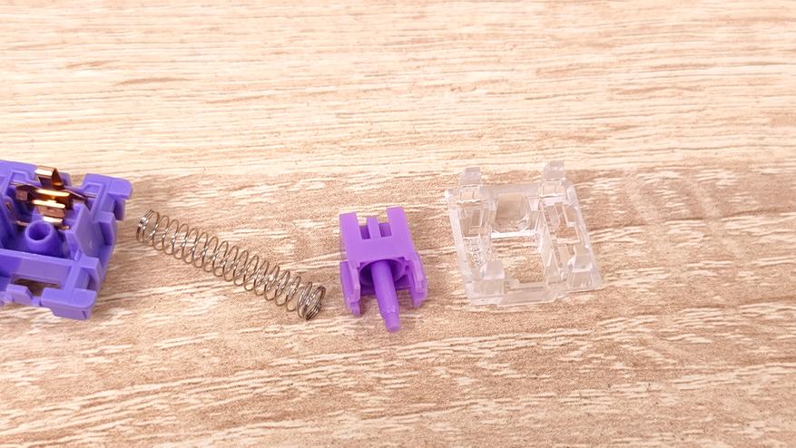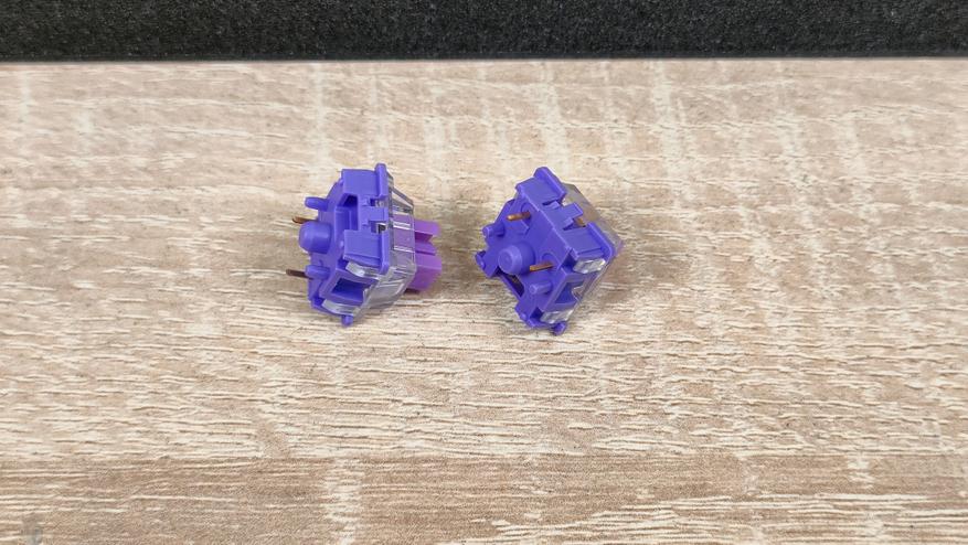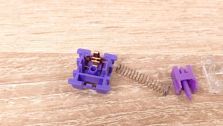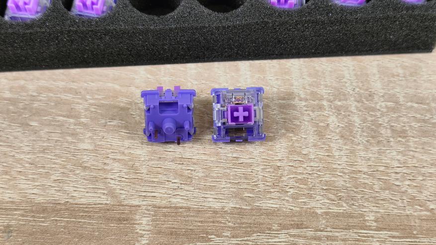 В клавиатуре установлены переключатели Redragon Purple: механический тактильный тип, 55 грамм на срабатывание, есть отчетливый порог срабатывания, ход срабатывания указан как 1.1 мм, хотя по ощущениям более менее стандартные 2 мм. Горячую замену поддерживают, с завода смазаны, причём смазано неплохо. Под пластиной позиционирования видны слои шумоизоляции в сочетании с северным светодиодом.