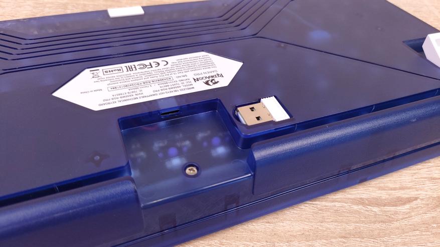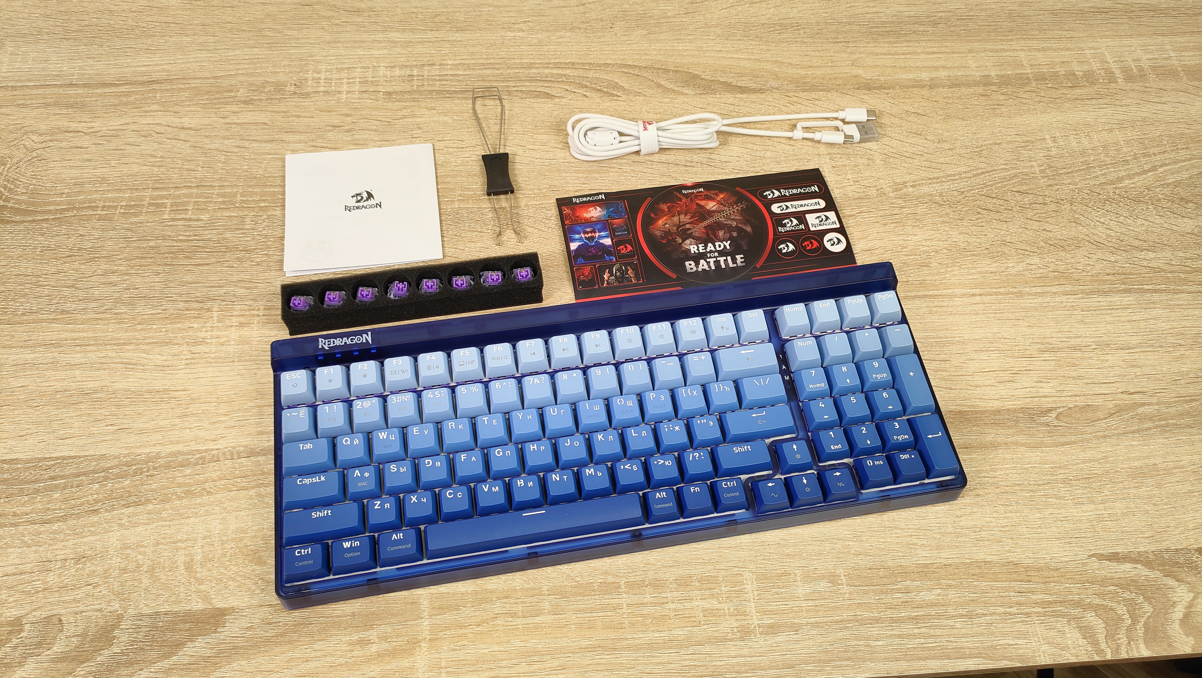 На лицевой стороне достаточно информации для базового представления, т.к. там есть крупное цветное изображение клавиатуры, а также несколько важных особенностей: количество клавиш, поддержка беспроводного режима, горячая замена переключателей, подсветка, фиолетовый тип переключателя. На обороте перечисление особенностей продолжается, а также перечислены некоторые базовые характеристики, которые, как правило, особого интереса не представляют. В комплект поставки входит: клавиатура, кабель для подключения и зарядки, фирменные наклейки, руководство пользователя, комплект из восьми запасных переключателей. Последние находятся в отдельной коробке, в поролоновом ложементе, подобную деталь я видел и в других клавиатурах данного производителя.