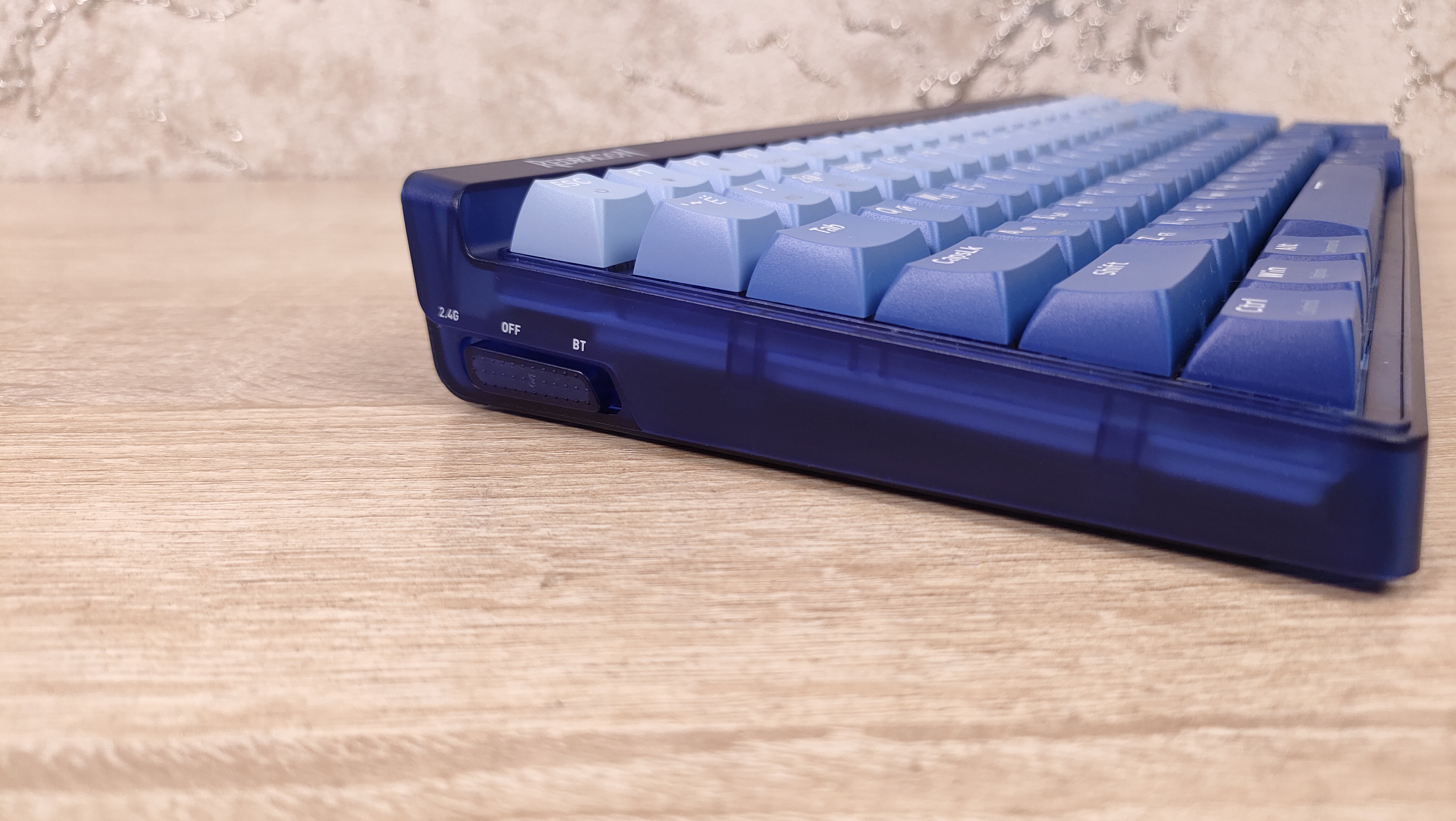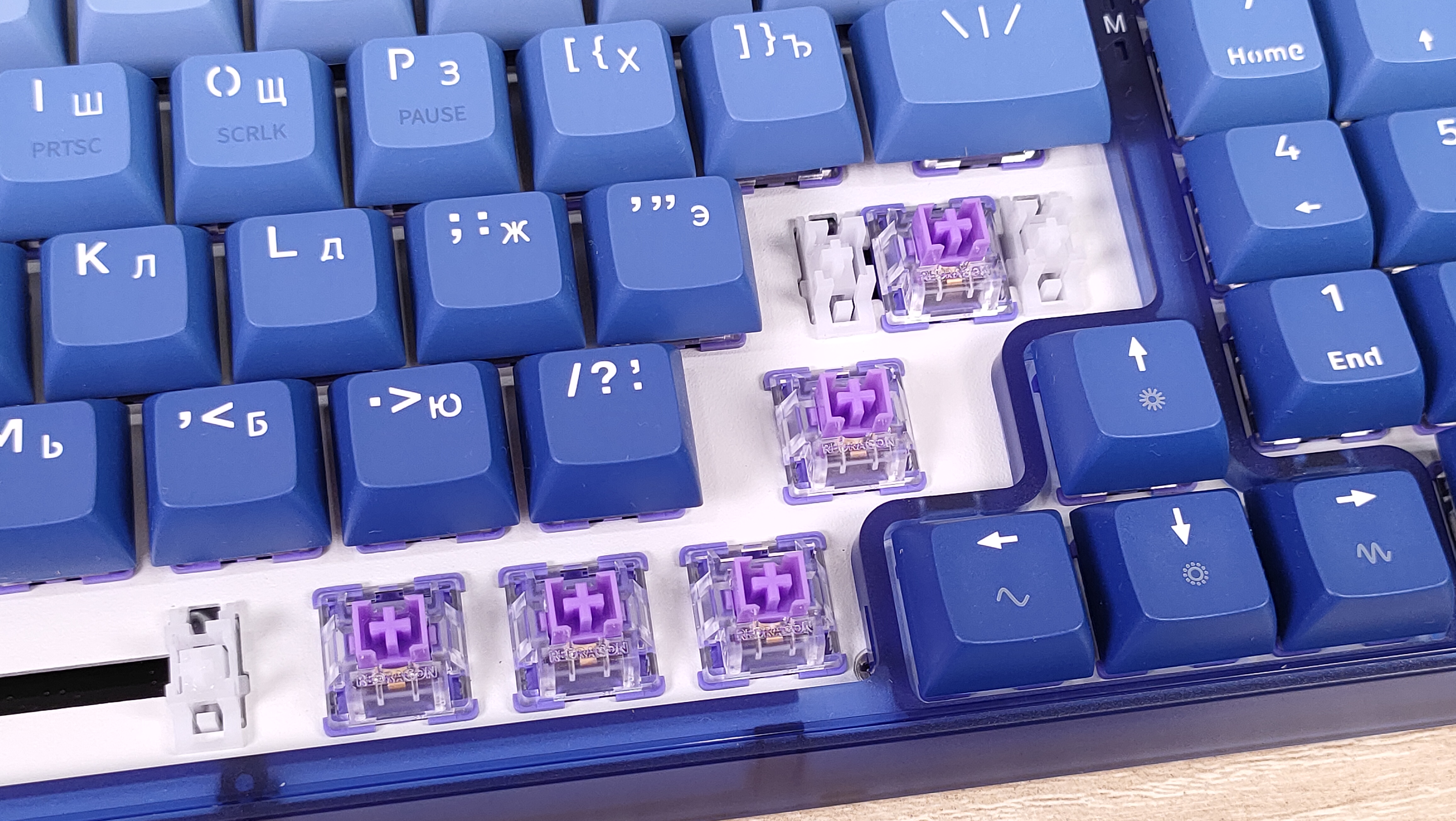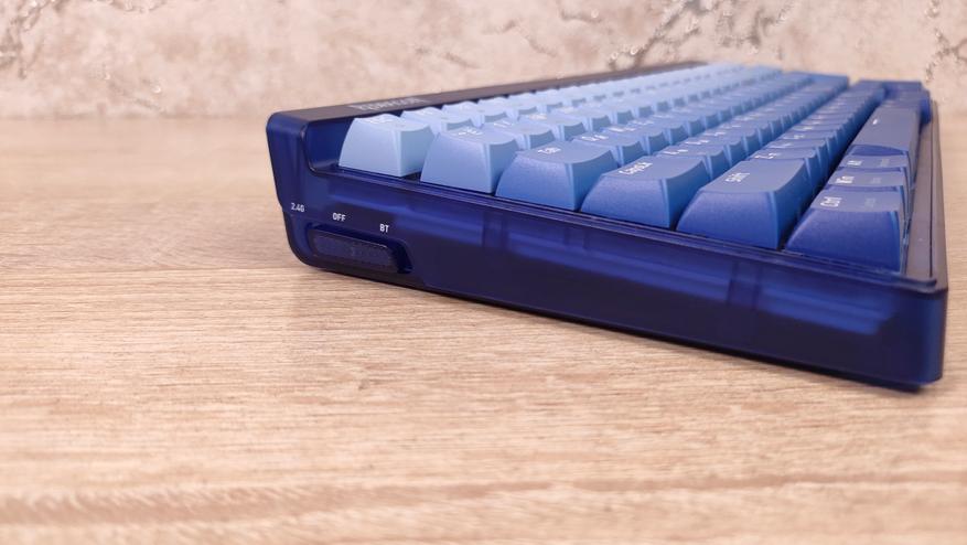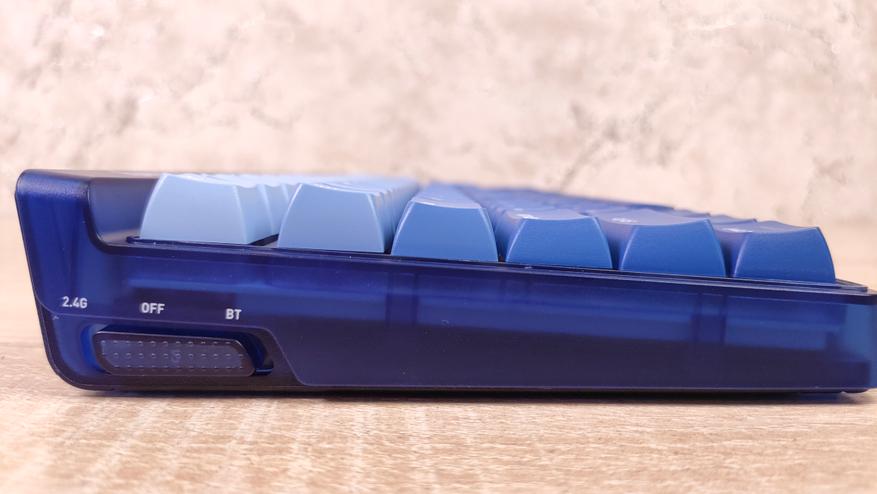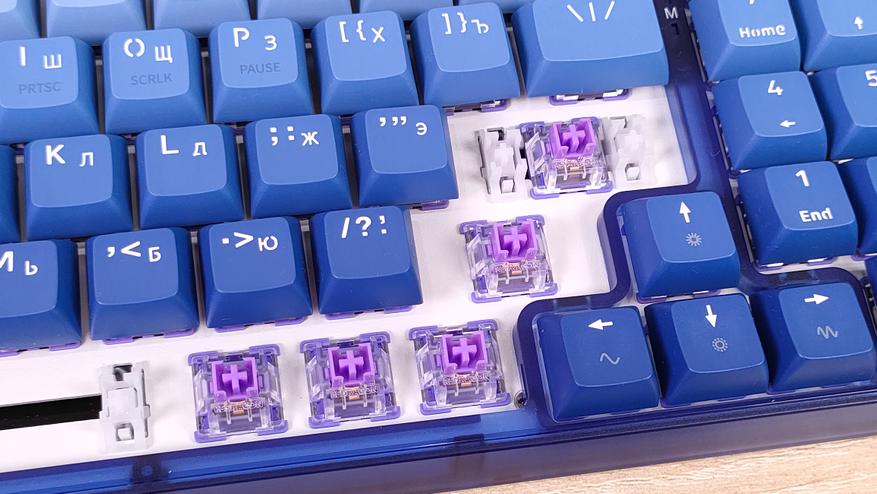 Первое нажатие на клавиши сразу дают понять, что клавиатура — не погремушка и не звенелка. Очень часто тактильные и кликающие переключатели шуршат, звенят, постоянно слышен скрежет, который зовется «песком», здесь всего этого нет. Нажатие мягкие, абсолютно не громкие, тактильная отдача чувствуется и она не вязкая. Если бы они были ещё немножко потяжелее, например 70, а то и 80 г, то ощущение при печати, были бы где-то близки к хорошим мембранкам, по который очень часто тоскуют те, кто много печатает и хочет именно хороший тактильный отклик. Здесь нет какого-то благородного звука «Thocky» или «Poppy», за которым гонятся некоторые пользователи, но здесь абсолютно нормальная работа ухоженной клавиатуры. Пробел, как ему и положено, а точнее стабилизатору, может иногда подстукивать с правой стороны, если пользователя это сильно раздражает, можно модифицировать его при помощи кусочка пластыря, руководств по этому делу в интернете вагон. Кроме того, более глухой звук может дать и так называемый «Tape Mod», когда плату оклеивают малярная лентой/скотчем в 1/2/3 слоя, но в данном случае, может быть не совсем актуально, т.к. корпус клавиатуры полупрозрачный и в случае, если пользователь захочет взглянуть или показать кому-то это, будут видно. Каких-либо проблем с клавиатурой я не выявил, работает абсолютно нормально, тактильная отдача есть и в ней есть определённый шарм, акустические характеристики клавиатуры, если можно так выразиться, тоже на нормальном уровне, можно сказать даже на хорошем, так как эта клавиатура относительно недорого стоит, тем более, здесь почти полный формат и есть поддержка беспроводных режимов работы.