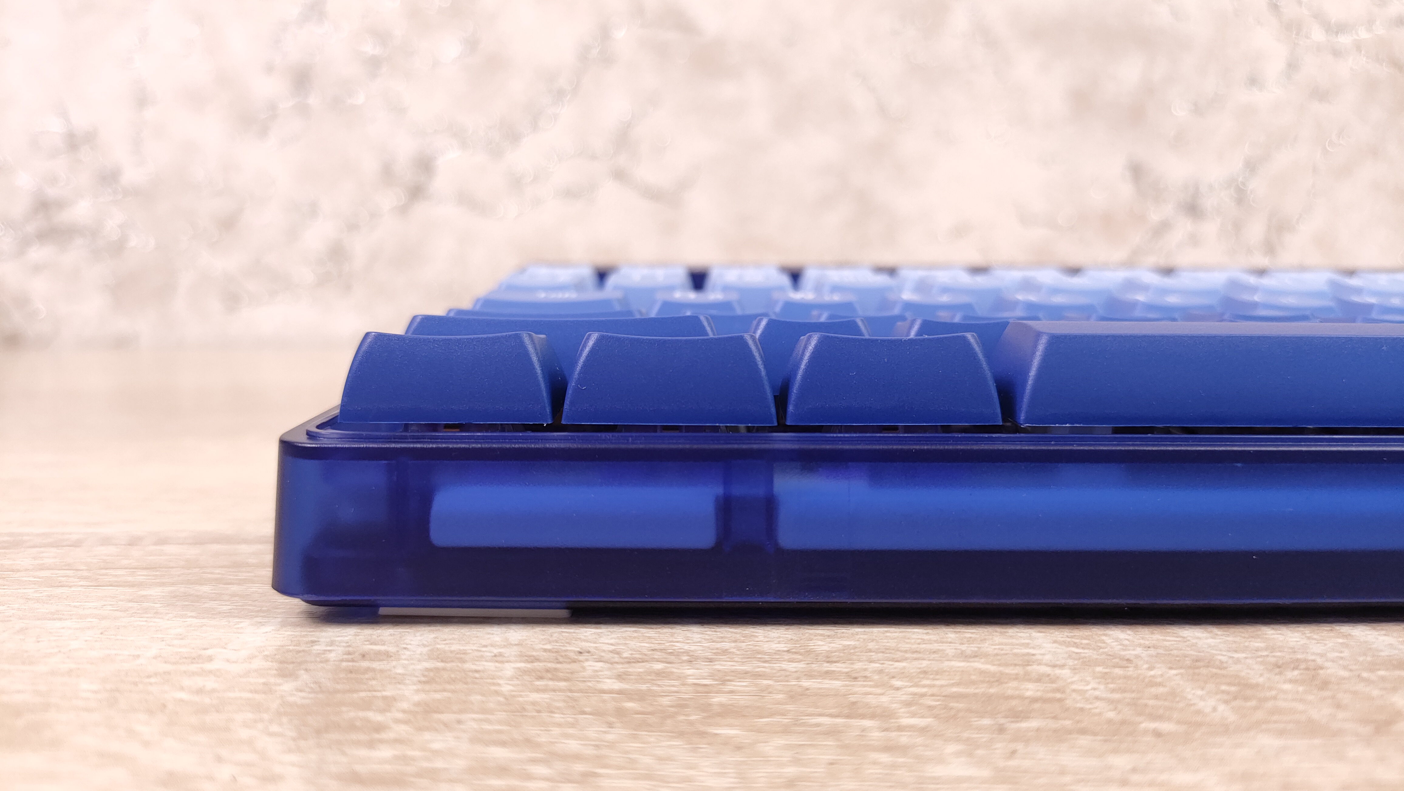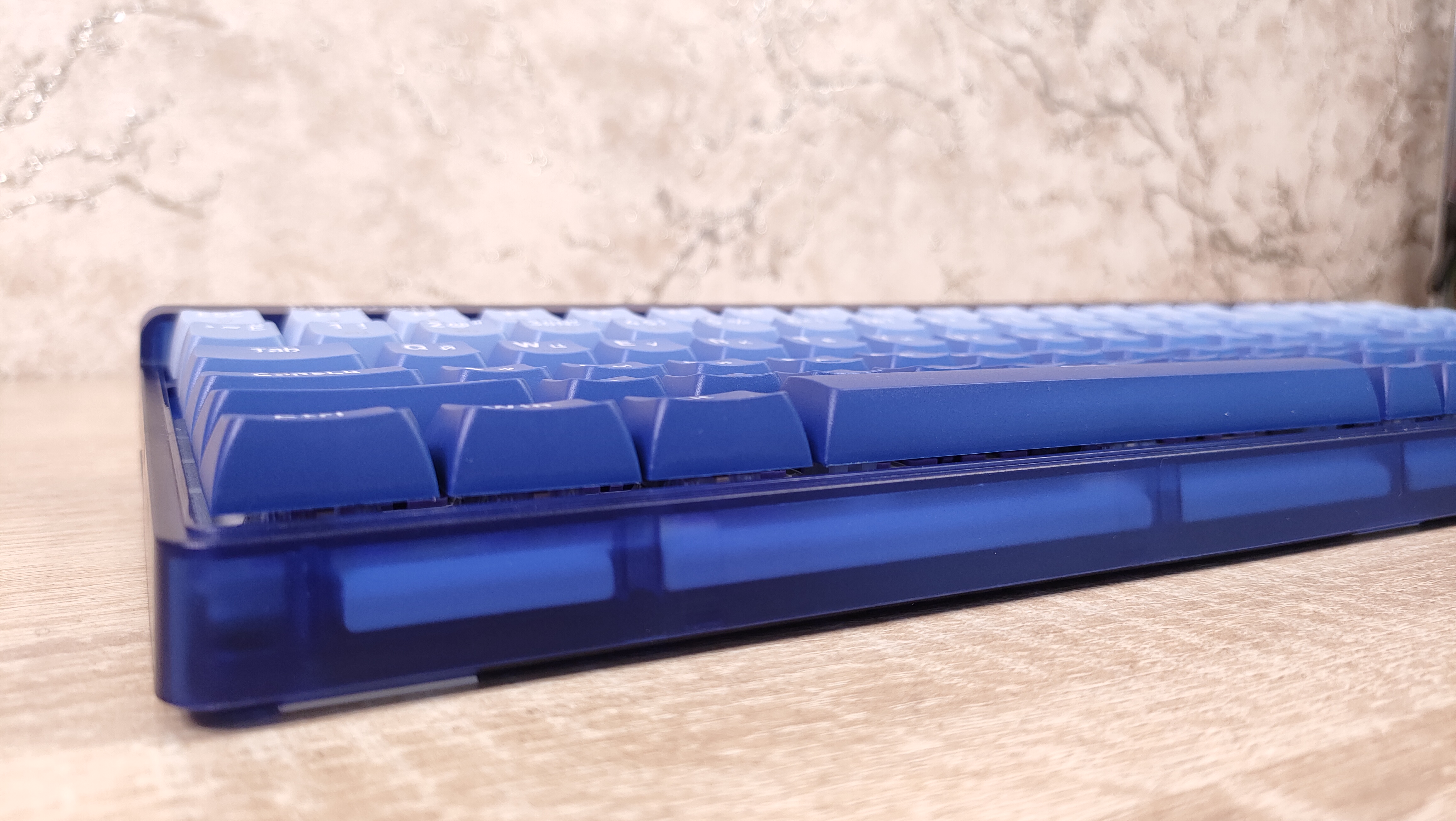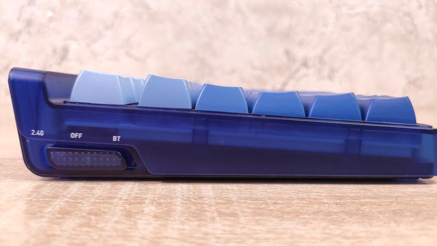 Первое нажатие на клавиши сразу дают понять, что клавиатура — не погремушка и не звенелка. Очень часто тактильные и кликающие переключатели шуршат, звенят, постоянно слышен скрежет, который зовется «песком», здесь всего этого нет. Нажатие мягкие, абсолютно не громкие, тактильная отдача чувствуется и она не вязкая. Если бы они были ещё немножко потяжелее, например 70, а то и 80 г, то ощущение при печати, были бы где-то близки к хорошим мембранкам, по который очень часто тоскуют те, кто много печатает и хочет именно хороший тактильный отклик. Здесь нет какого-то благородного звука «Thocky» или «Poppy», за которым гонятся некоторые пользователи, но здесь абсолютно нормальная работа ухоженной клавиатуры. Пробел, как ему и положено, а точнее стабилизатору, может иногда подстукивать с правой стороны, если пользователя это сильно раздражает, можно модифицировать его при помощи кусочка пластыря, руководств по этому делу в интернете вагон. Кроме того, более глухой звук может дать и так называемый «Tape Mod», когда плату оклеивают малярная лентой/скотчем в 1/2/3 слоя, но в данном случае, может быть не совсем актуально, т.к. корпус клавиатуры полупрозрачный и в случае, если пользователь захочет взглянуть или показать кому-то это, будут видно. Каких-либо проблем с клавиатурой я не выявил, работает абсолютно нормально, тактильная отдача есть и в ней есть определённый шарм, акустические характеристики клавиатуры, если можно так выразиться, тоже на нормальном уровне, можно сказать даже на хорошем, так как эта клавиатура относительно недорого стоит, тем более, здесь почти полный формат и есть поддержка беспроводных режимов работы.