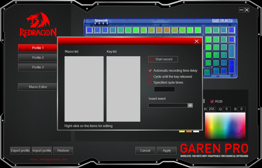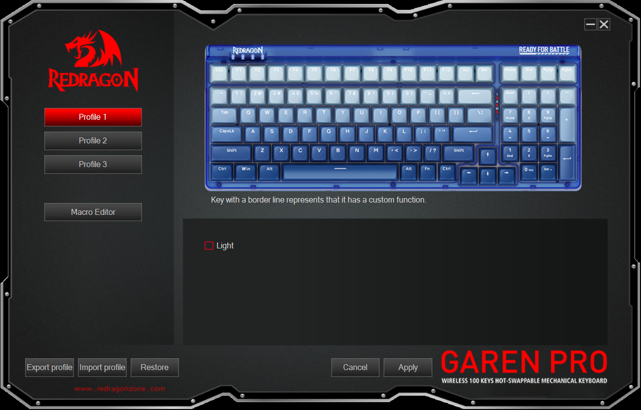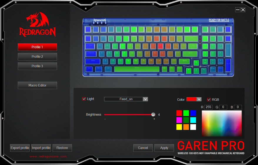 Программное обеспечение умеет делать то, что и должно: переназначать клавиши, записывать макросы, настраивать подсветку. По беспроводу ПО не видит клавиатуру, только в проводном режиме.