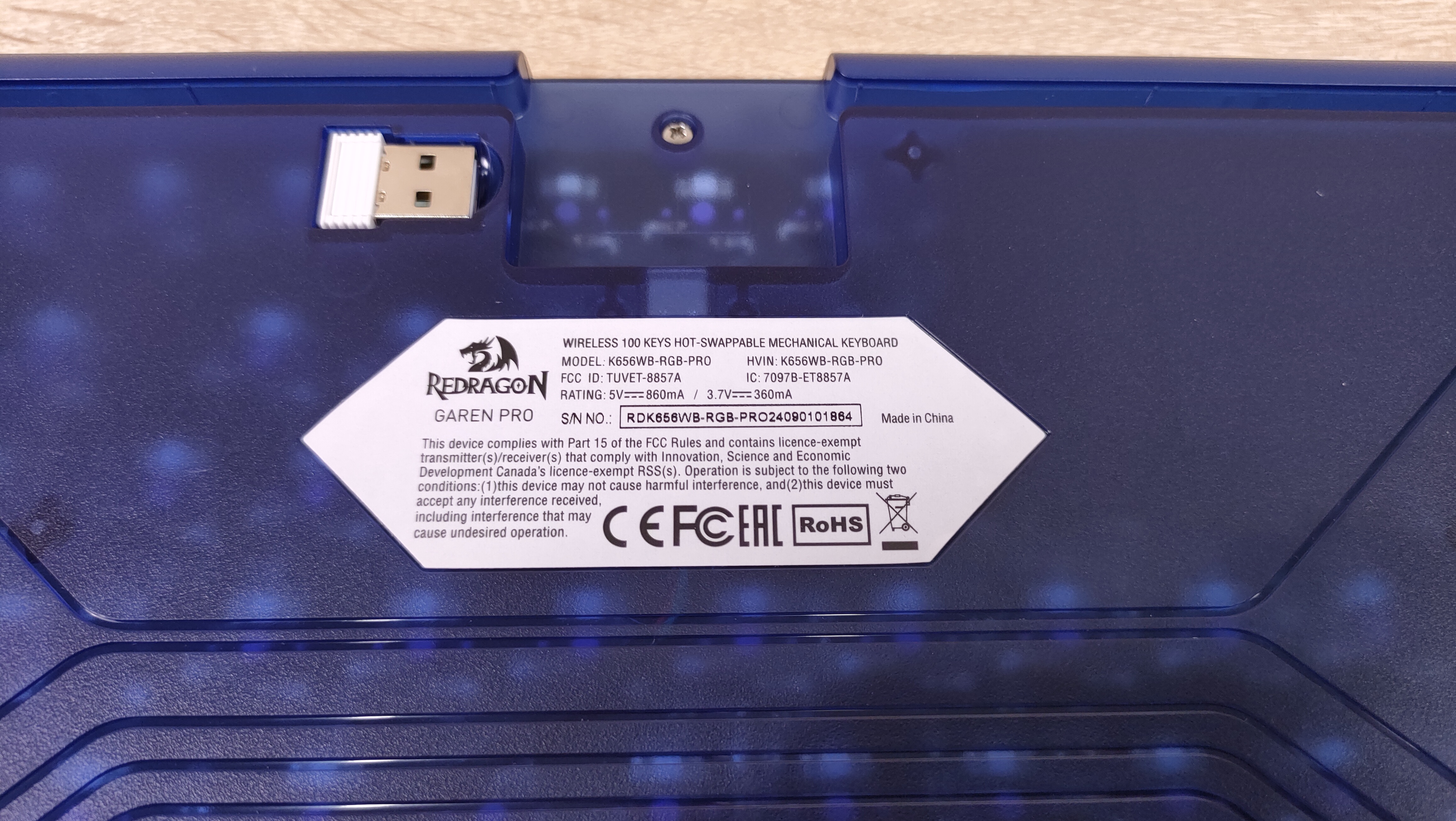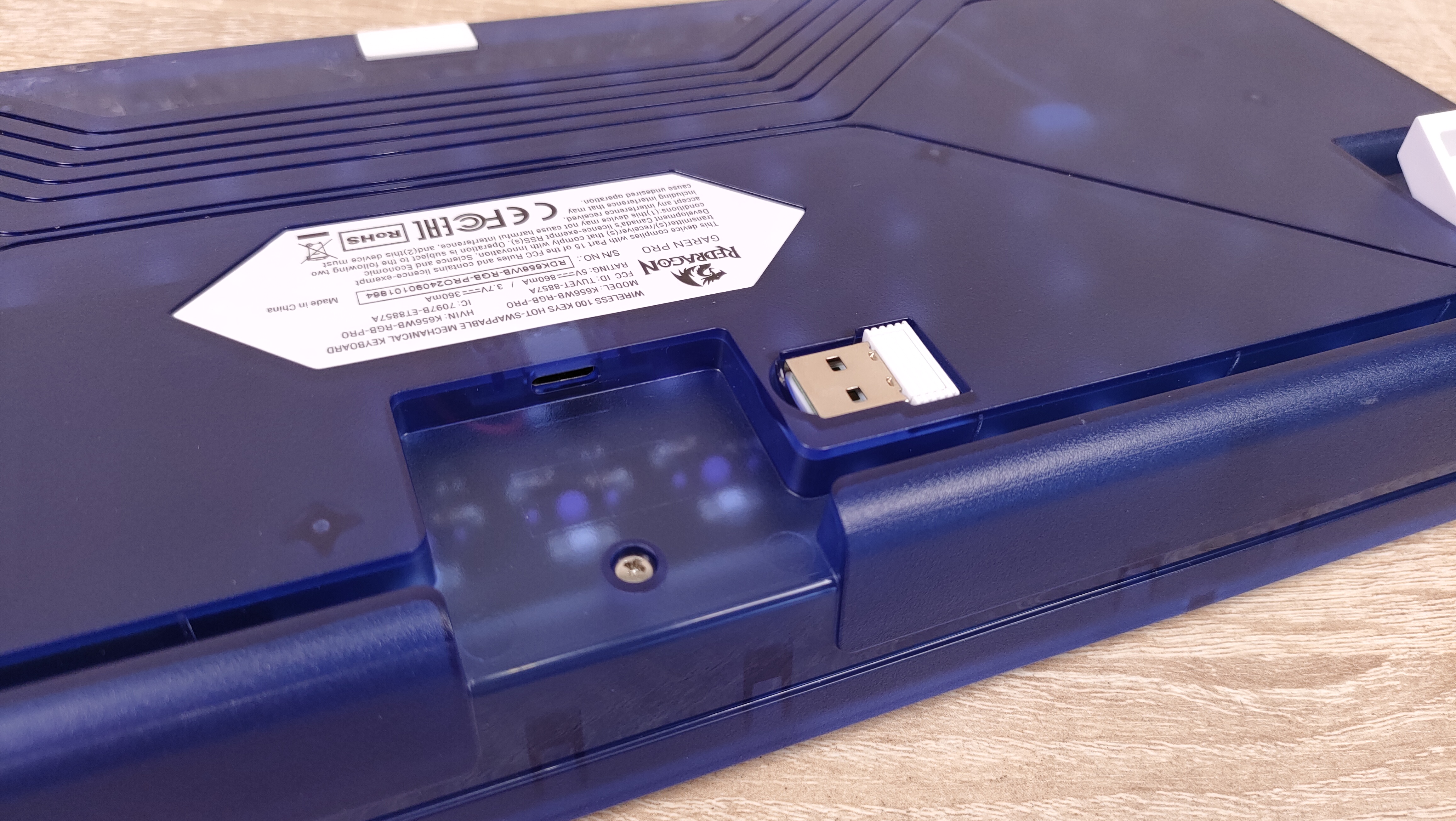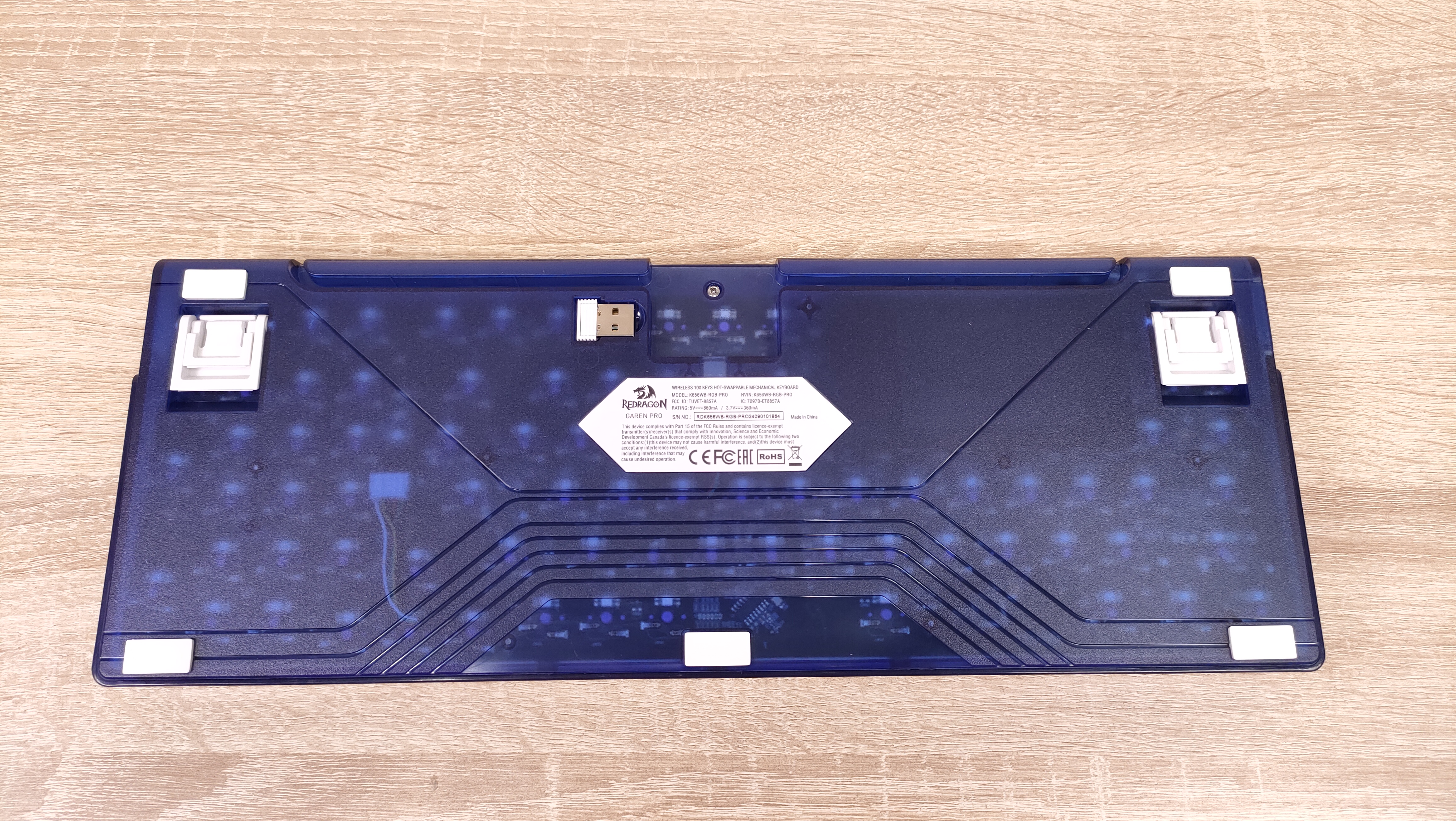 На дне типичная клавиатурная картина — силиконовые упоры в количестве 5 штук, информационная наклейка в центре, есть в углах две выдвижные ножки с двумя уровнями каждая, есть кабель-канал для задания направления, соответственно кабеля, возле него есть разъём для подключения и ниша с приёмо-передатчиком.