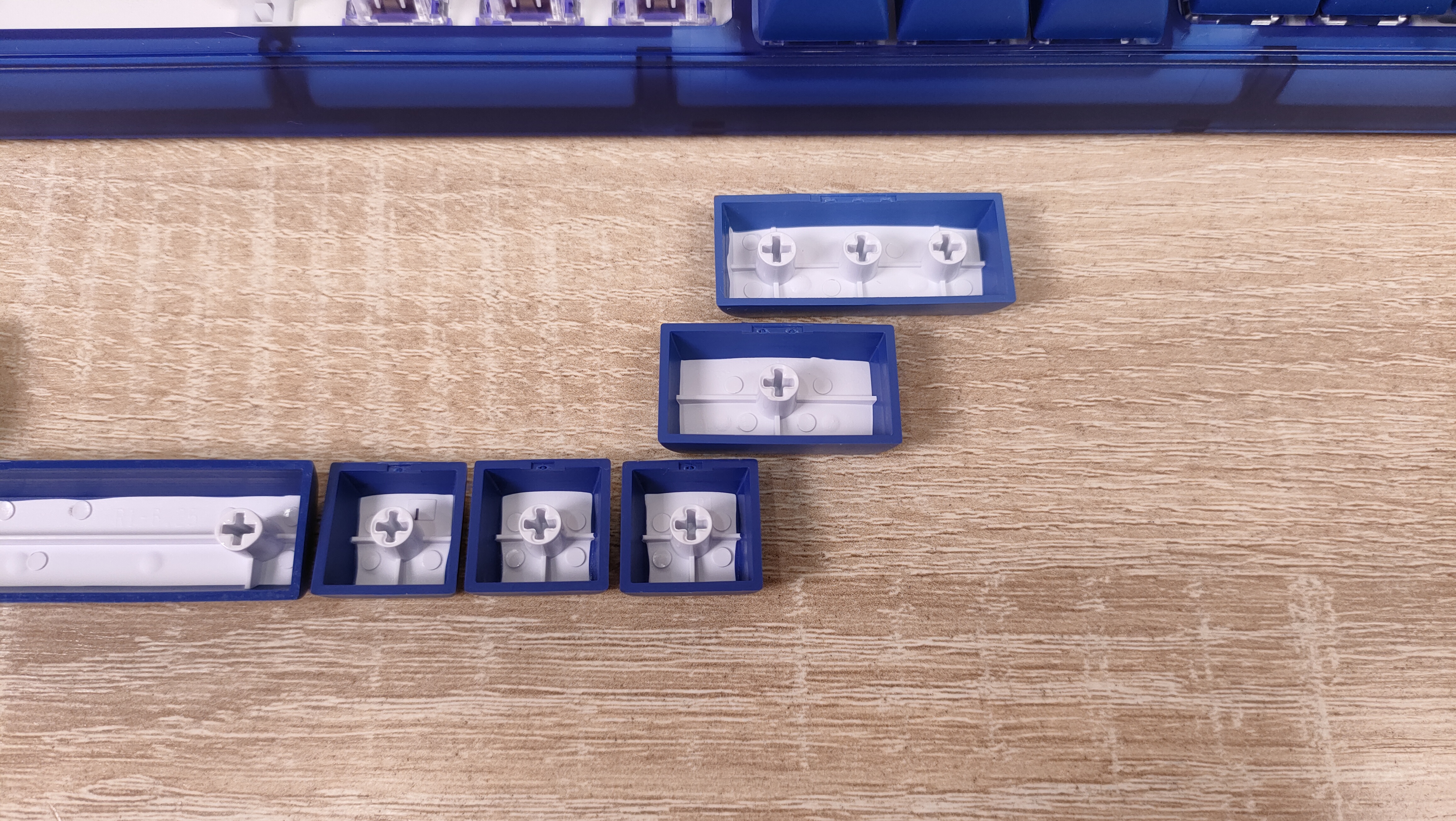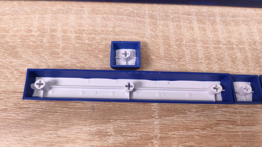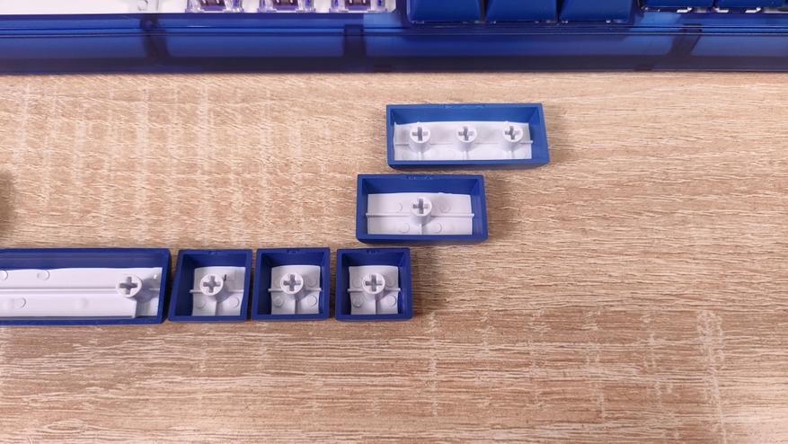 Колпачки изготовлены из PBT пластика методом двойного литья, а это означает, что символы на них подсвечиваться не будут, так как оба слоя здесь из PBT. Стабилизаторы установлены в пластину позиционирования, смазанные, но несмотря на это, данный тип периодически может подстукивать, особенно на пробеле. Если сильно раздражает кого-то, то это лечится небольшой модификацией. Клавиатура собрана на жёсткую, прокладок нету, соответственно, она не прогибается при надавливании и не будет гасить вибрацию и сопутствующие шумы при печати, но это не означает, что будет обязательно громко.