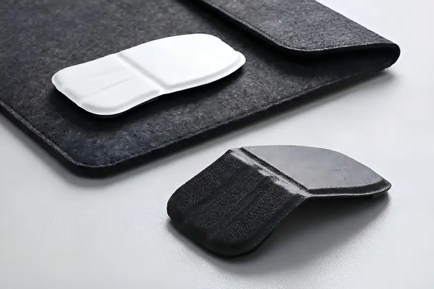 Корпус изготовлен из веганской кожи с тканевой текстурой. Материал устойчив к поту и очищается влажной салфеткой. Кнопки — механические, тихие. Устройство оснащено колесом прокрутки.