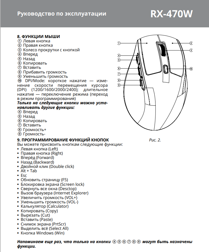Как программировать кнопки я подробно рассказывать не буду. Производитель об этом написал в руководстве пользователя. Если в двух словах, то нужно: нажать и удерживать в течение трёх секунд кнопку DPI-Mode. На дисплее отобразится режим программирования. Далее нужно нажать ту кнопку, которую хотите запрограммировать. На дисплее отобразится меню, в котором выберите нужную вам функцию. После выбора, нажмите ещё раз программируемую кнопку, тем самым вы выйдите из режима программирования и сохраните все действия. После выбора нужной вам функции, нажимаем ещё раз программируемую кнопку для сохранения настроек и выхода из меню