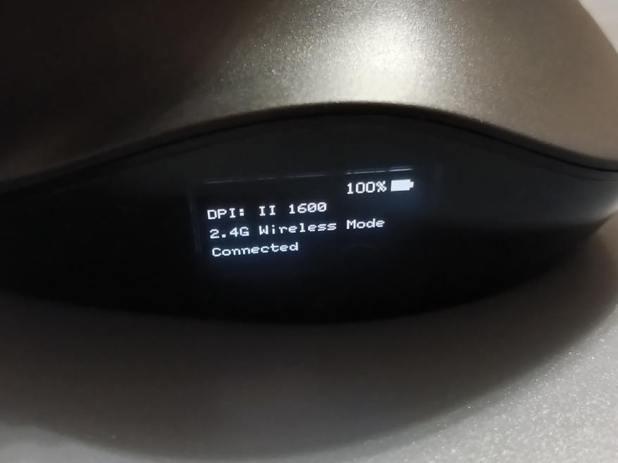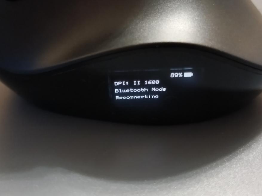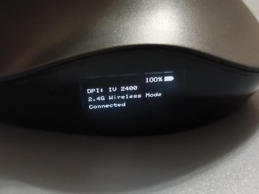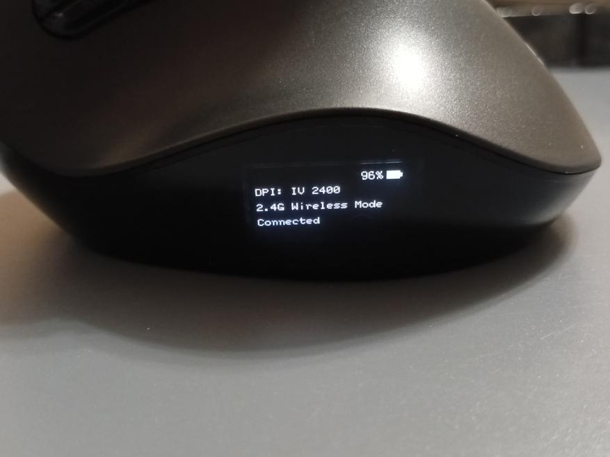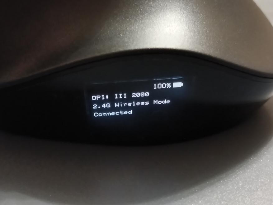 Одна из особенностей данной мышки заключается в том, что с левой стороны установлен OLED дисплей. На нем выводится информация о типе подключения, скорости работы и об оставшемся заряде аккумулятора. Также он служит для программирования кнопок.
