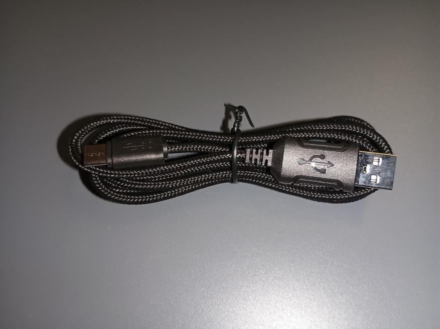 Для зарядки мышки предусмотрен современный type-c разъём. В комплекте есть кабель в нейлоновой оплетке, которая защищает провод от повреждения и скручивания. Внутри мышки установлен аккумулятор с ёмкостью 500 мАч. Его ёмкости хватает на достаточно длительное время работы.
