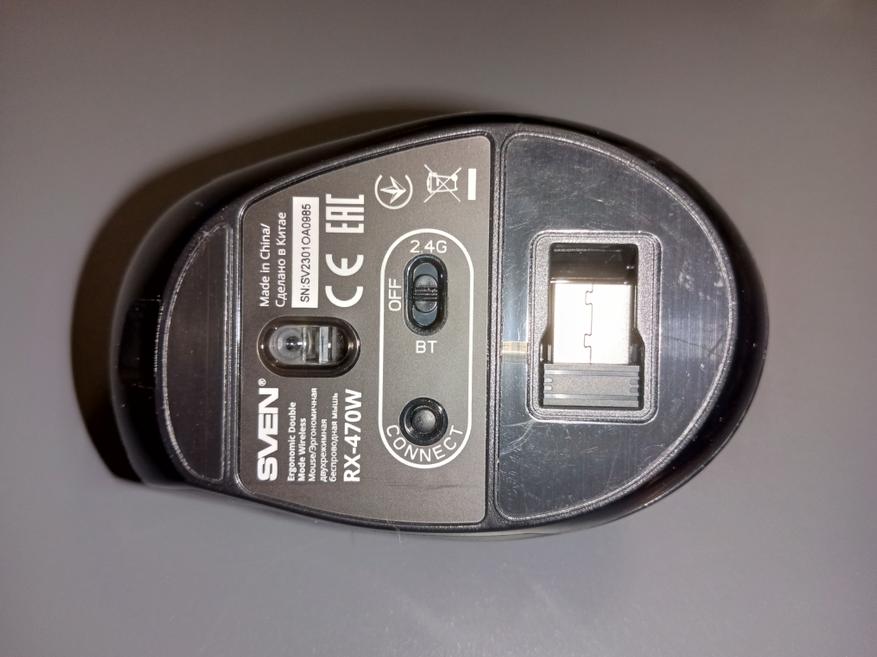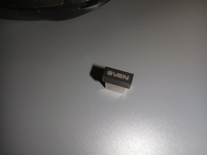 В нижней части корпуса находится комплектный адаптер для подключения, который удерживается с помощью магнита. На адаптере присутствует фирменный логотип компании SVEN. Кнопки переключения режимов работы: Bluetooth или USB-адаптер 2.4 ГГц находятся также в нижней части.