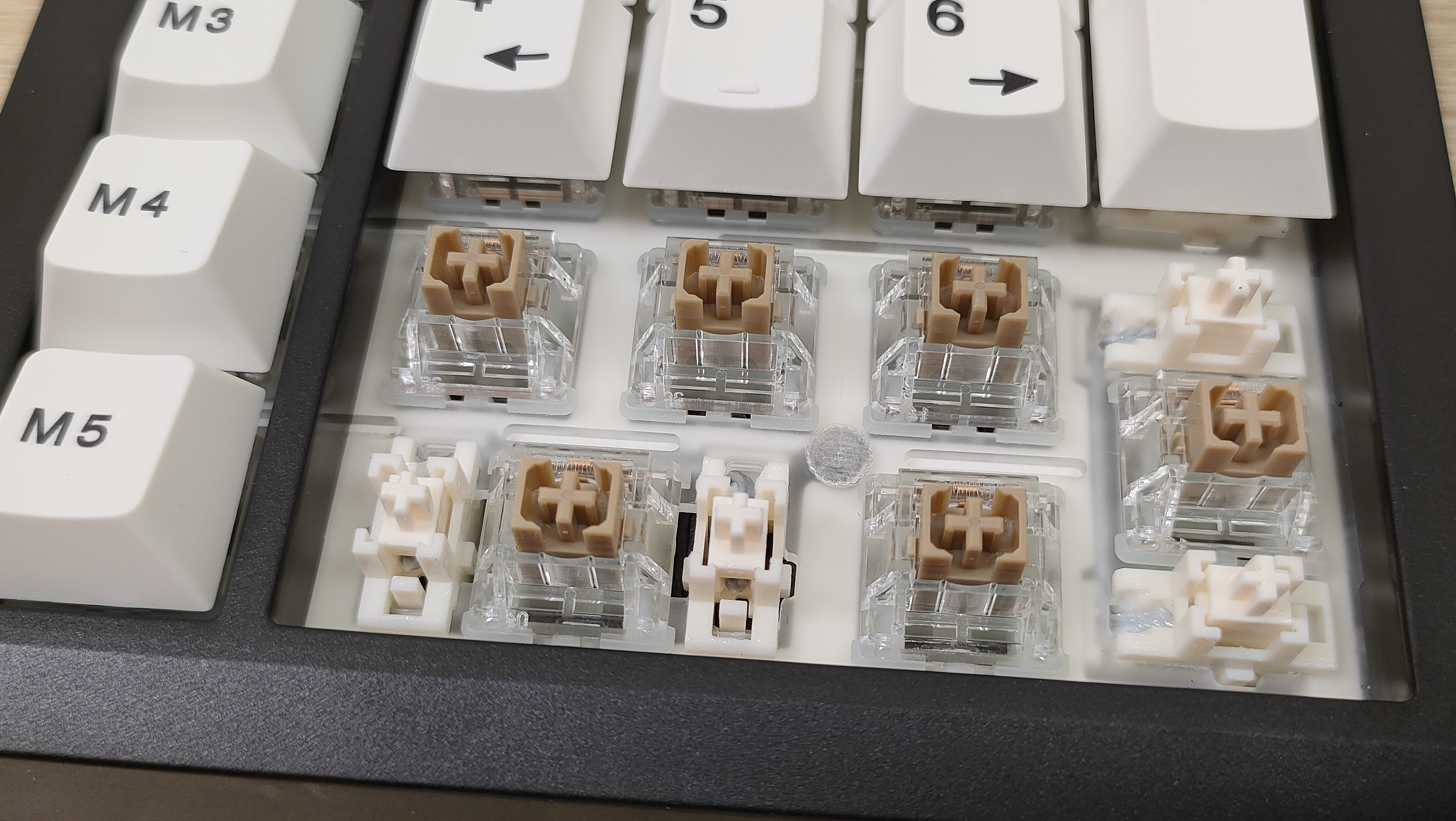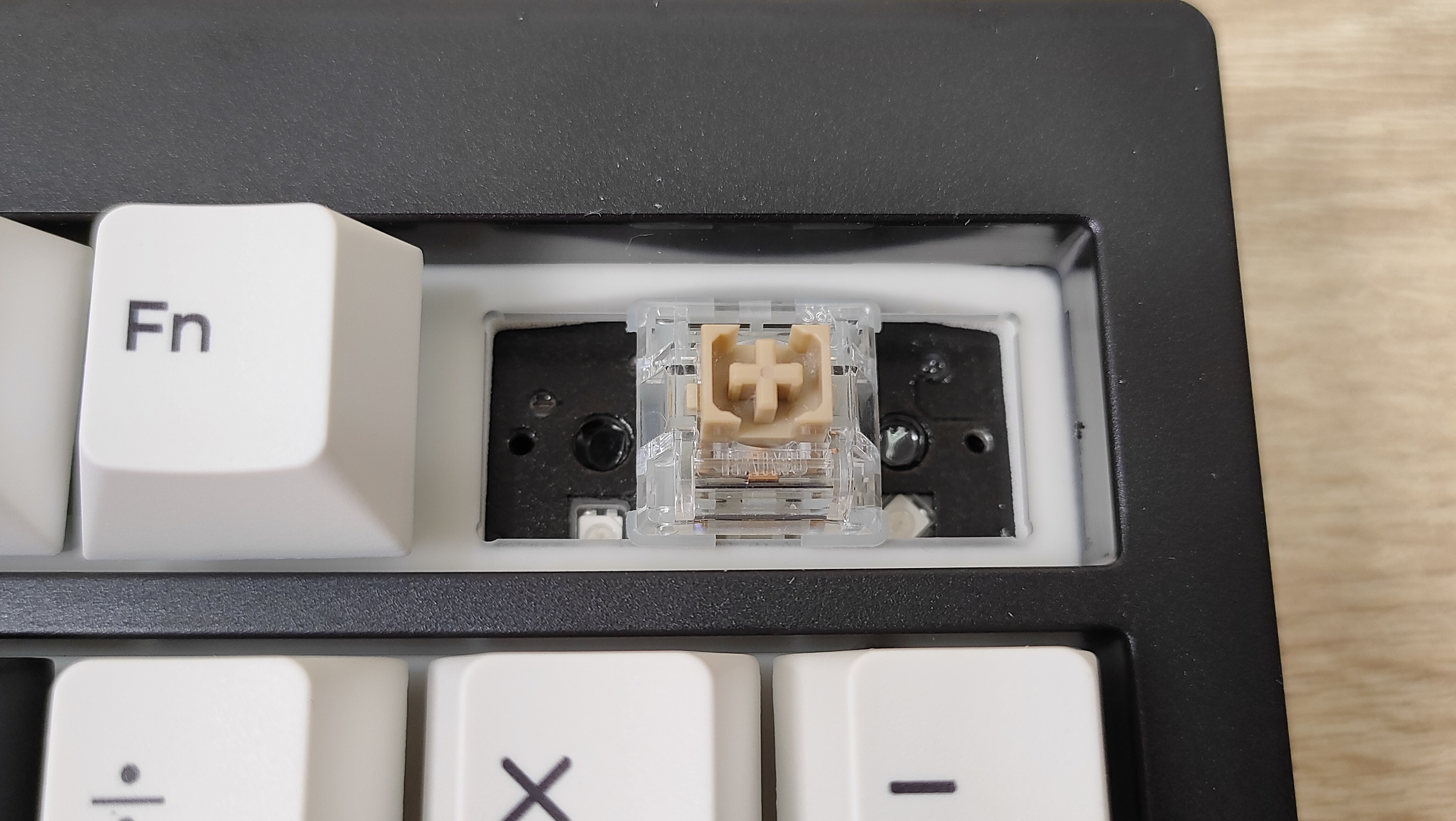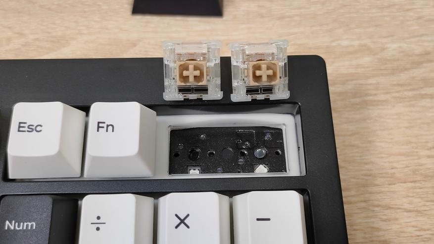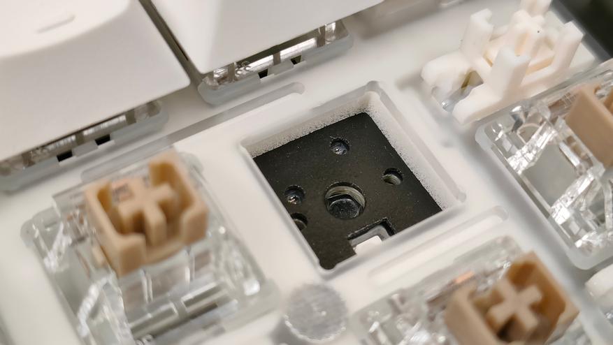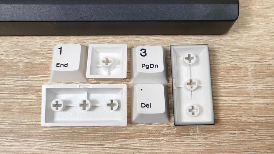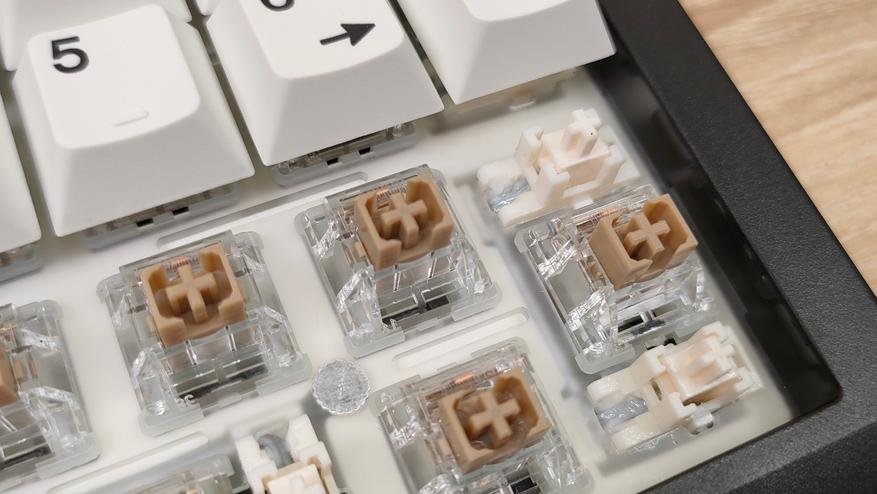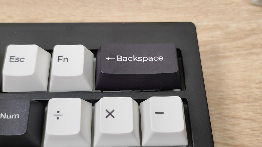 Колпачки выполнены методом двойного литья из PBT пластика, соответственно, свет пропускать они не будут. Толщина стенки золотой стандарт — 1,5 мм. Под широкими, или удлинёнными клавишами есть стабилизаторы, они установлены в пластину позиционирования и обильно смазаны, что видно невооруженным глазом. Колпачок Backspace можно установить вместо короткой клавиши справа наверху, тем самым вернуть привычный размер. Для этого необходимо извлечь два переключателя и установить один из них посередине, там есть посадочное место, но для этого необходимо будет переключатель перевернуть вверх ногами, а ещё широкий Backspace будет без стабилизатора. Переключатели здесь Haimu Sea Apricot: механический линейный тип, 2,0+-0,5 мм до срабатывания; 3,6+-0,3 мм до упора, 42+-5 г до срабатывания; смазаны с завода, поддерживается горячая замена.