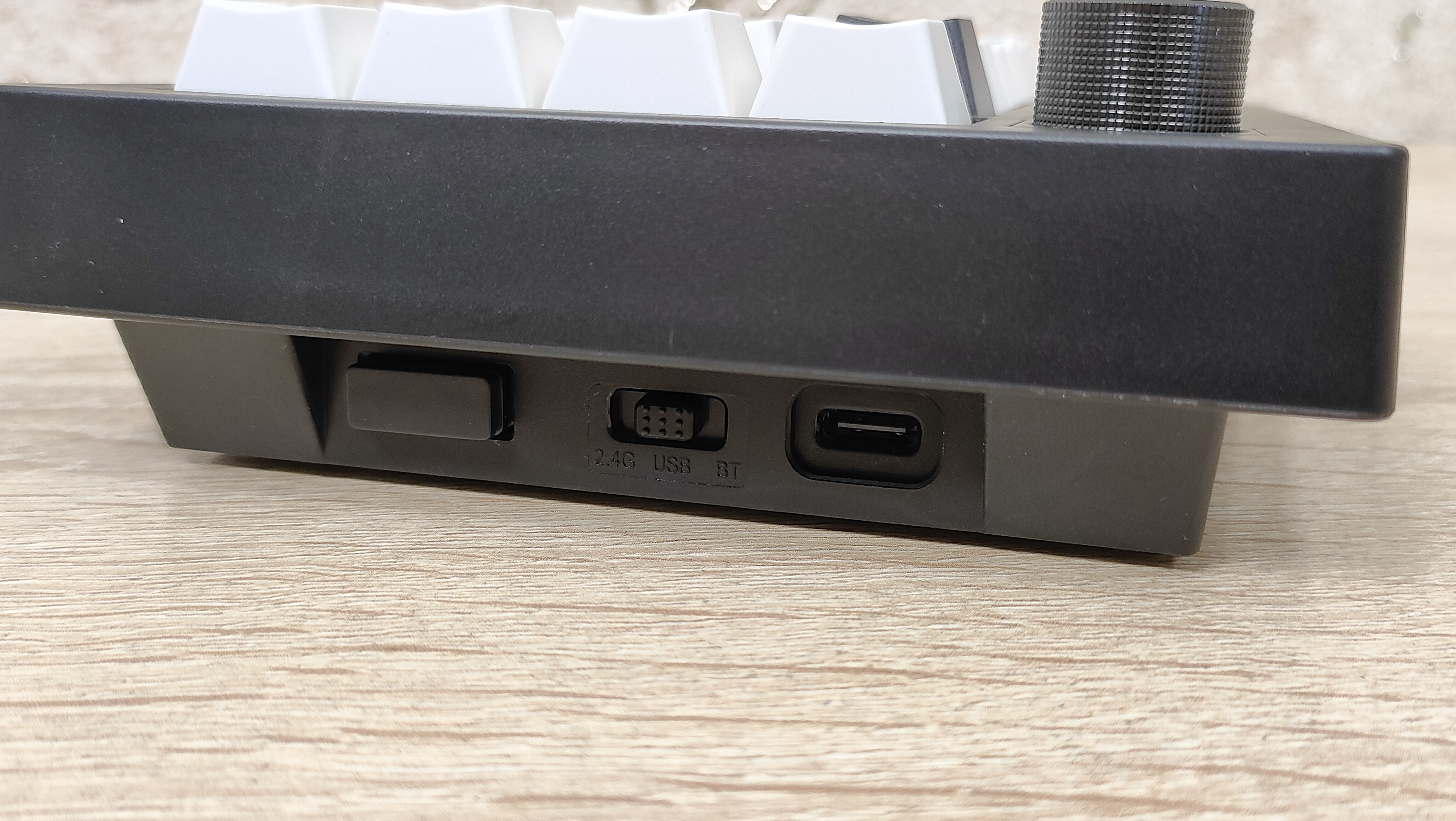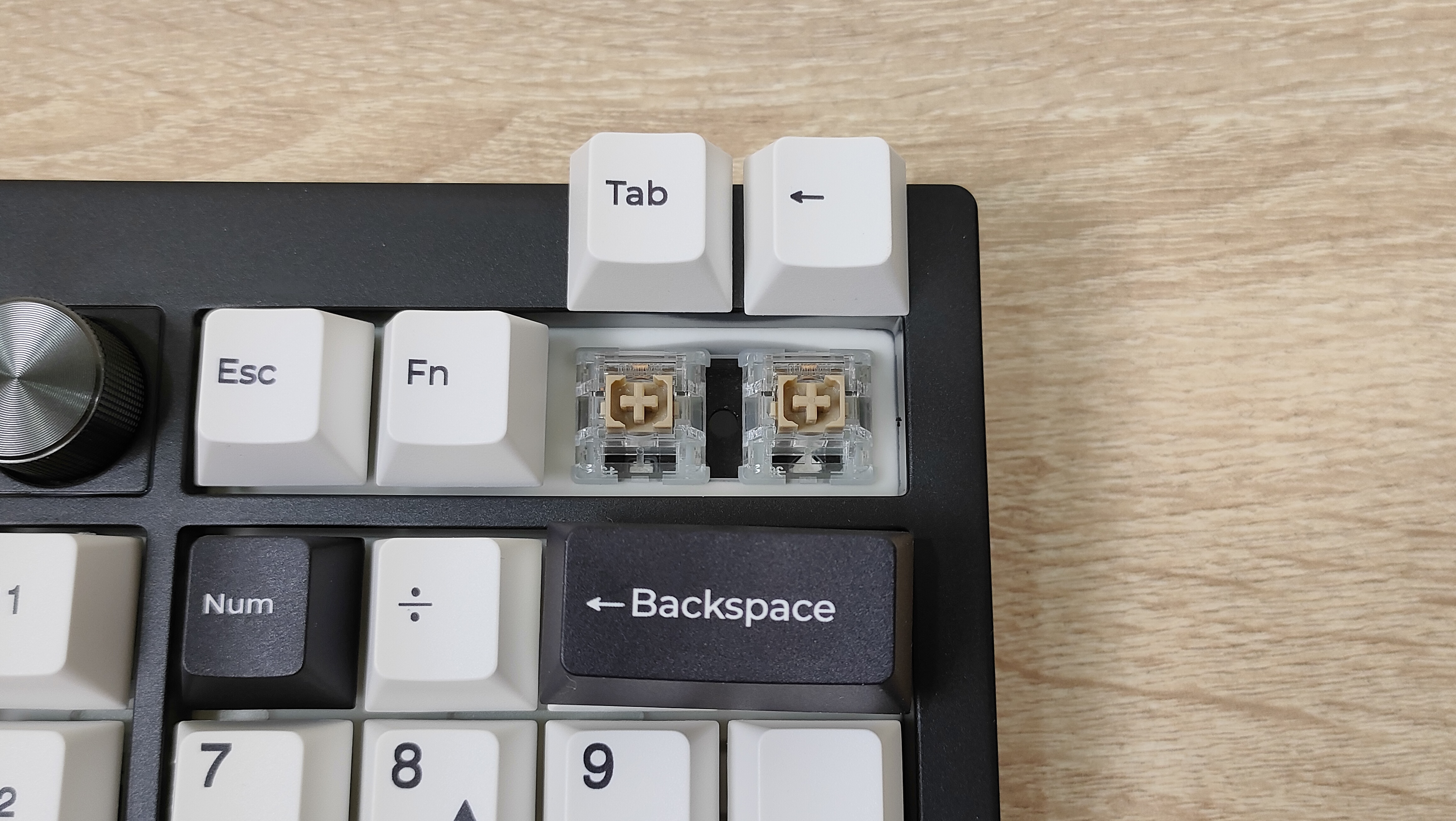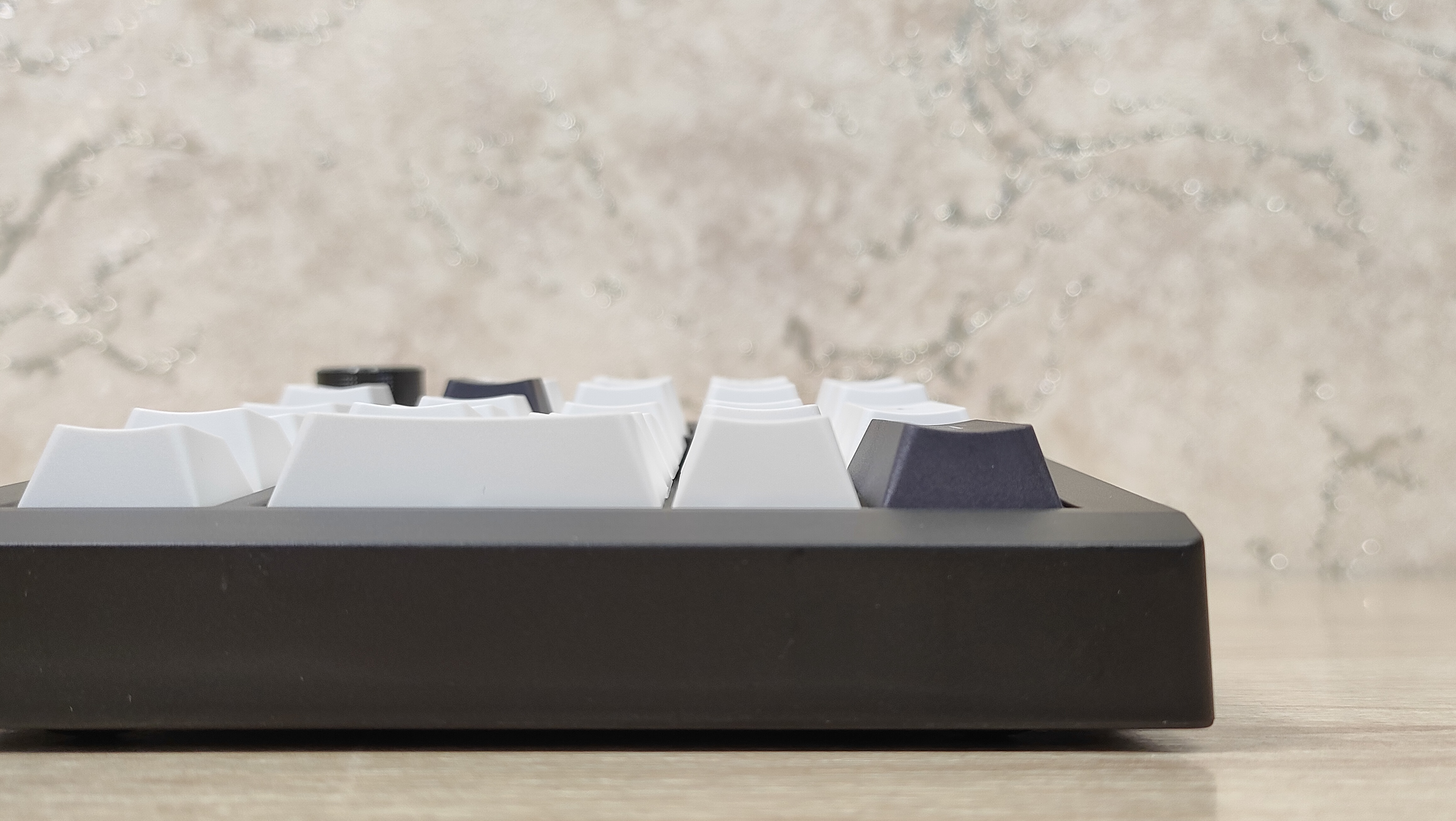 Колпачки выполнены методом двойного литья из PBT пластика, соответственно, свет пропускать они не будут. Толщина стенки золотой стандарт — 1,5 мм. Под широкими, или удлинёнными клавишами есть стабилизаторы, они установлены в пластину позиционирования и обильно смазаны, что видно невооруженным глазом. Колпачок Backspace можно установить вместо короткой клавиши справа наверху, тем самым вернуть привычный размер. Для этого необходимо извлечь два переключателя и установить один из них посередине, там есть посадочное место, но для этого необходимо будет переключатель перевернуть вверх ногами, а ещё широкий Backspace будет без стабилизатора. Переключатели здесь Haimu Sea Apricot: механический линейный тип, 2,0+-0,5 мм до срабатывания; 3,6+-0,3 мм до упора, 42+-5 г до срабатывания; смазаны с завода, поддерживается горячая замена.