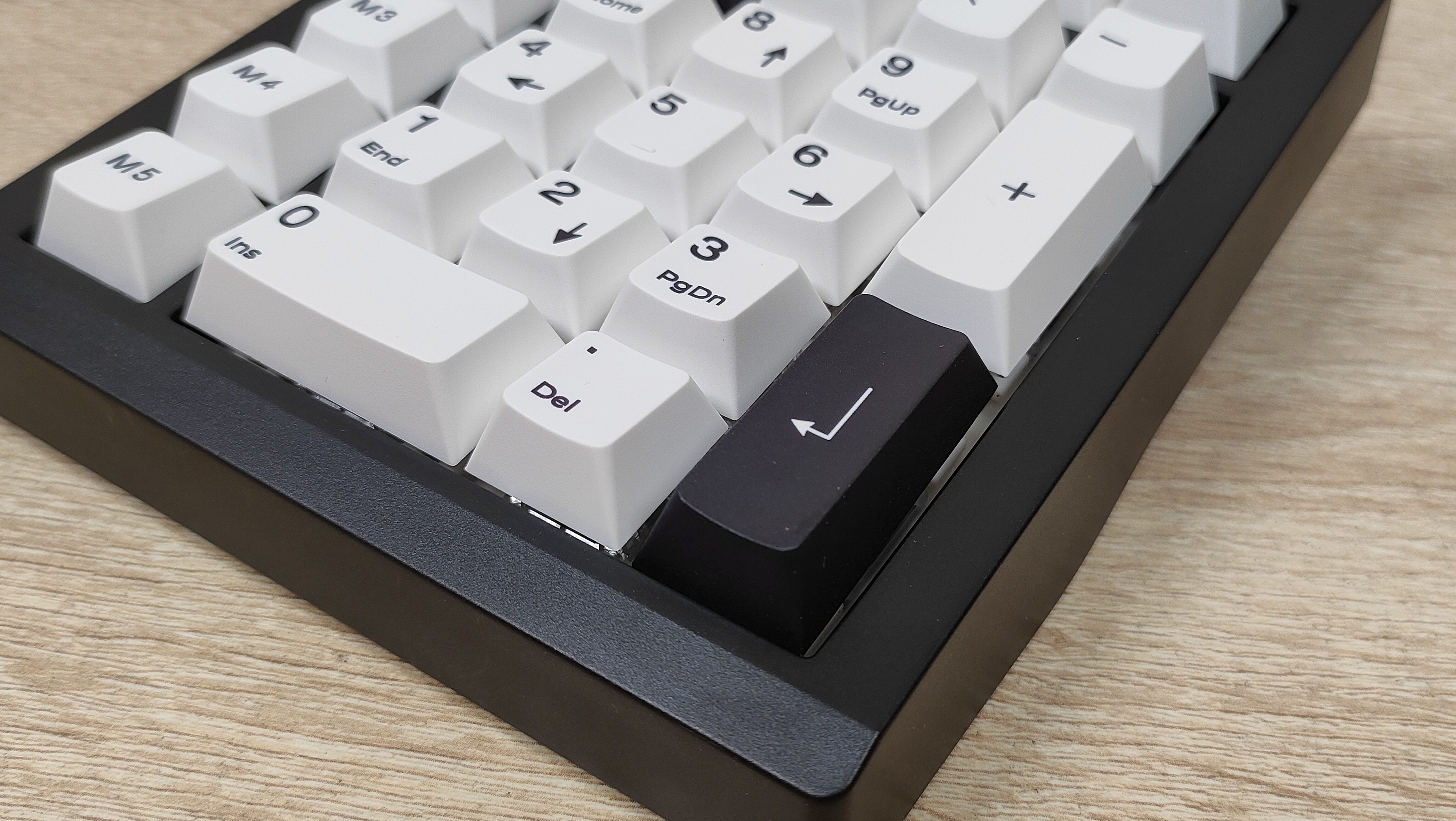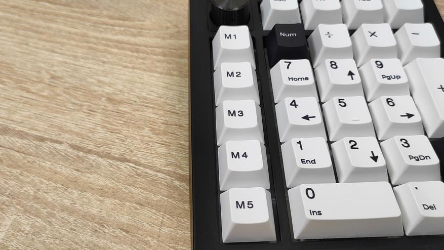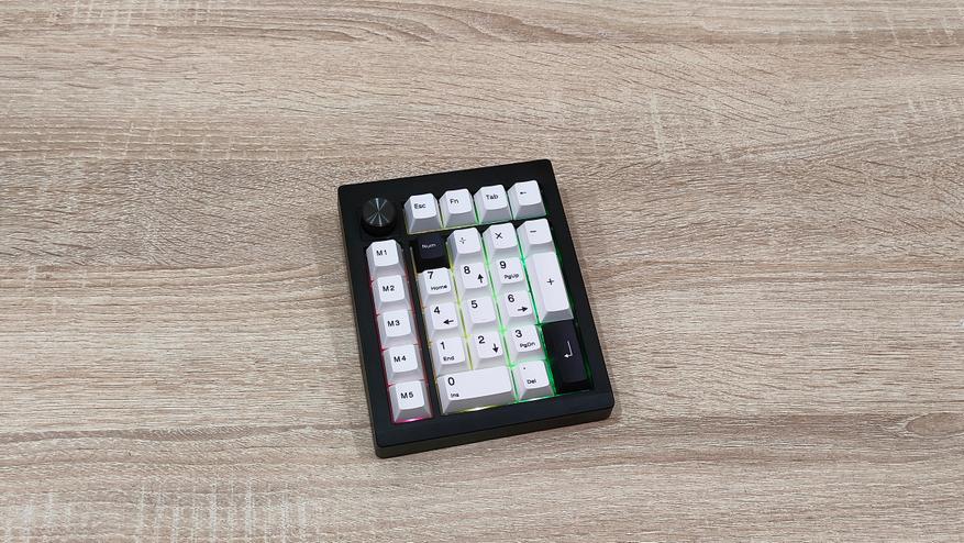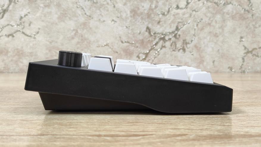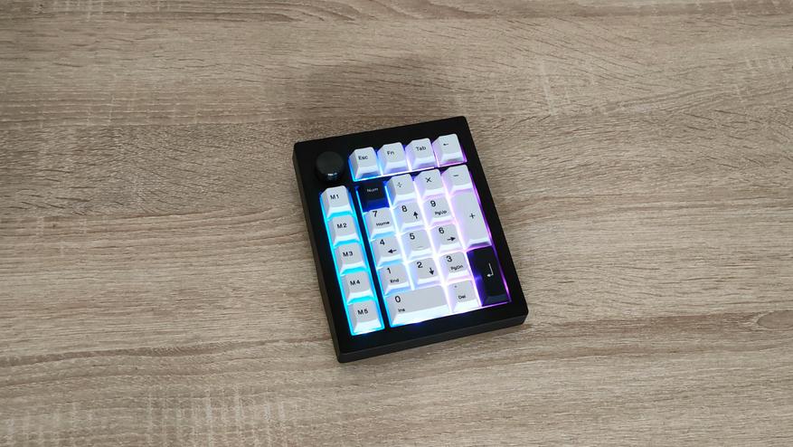 Клавиатурка, естественно, очень компактная, цифровой блок другим и не должен быть. Корпус пластиковый, соответственно клавиатура лёгкая. Расцветка классическая, подойдёт под большинство рабочих мест, кроме того, есть великое множество клавиатур с подобной. Передо мной расширенный цифровой блок с классической компоновкой, над основными клавишами есть несколько дополнительных, слева от него есть пять программируемых клавиш, на которых уже зашиты несколько макросов, а также есть энкодер слева наверху. Такое расположение уже намекает на то, что этот цифровой блок отлично расположится слева от клавиатуры, чтобы многие вещи можно было делать не отрывая руки от мыши. Формат примерно 20%, профиль колпачков Cherry или OEM- подобный.