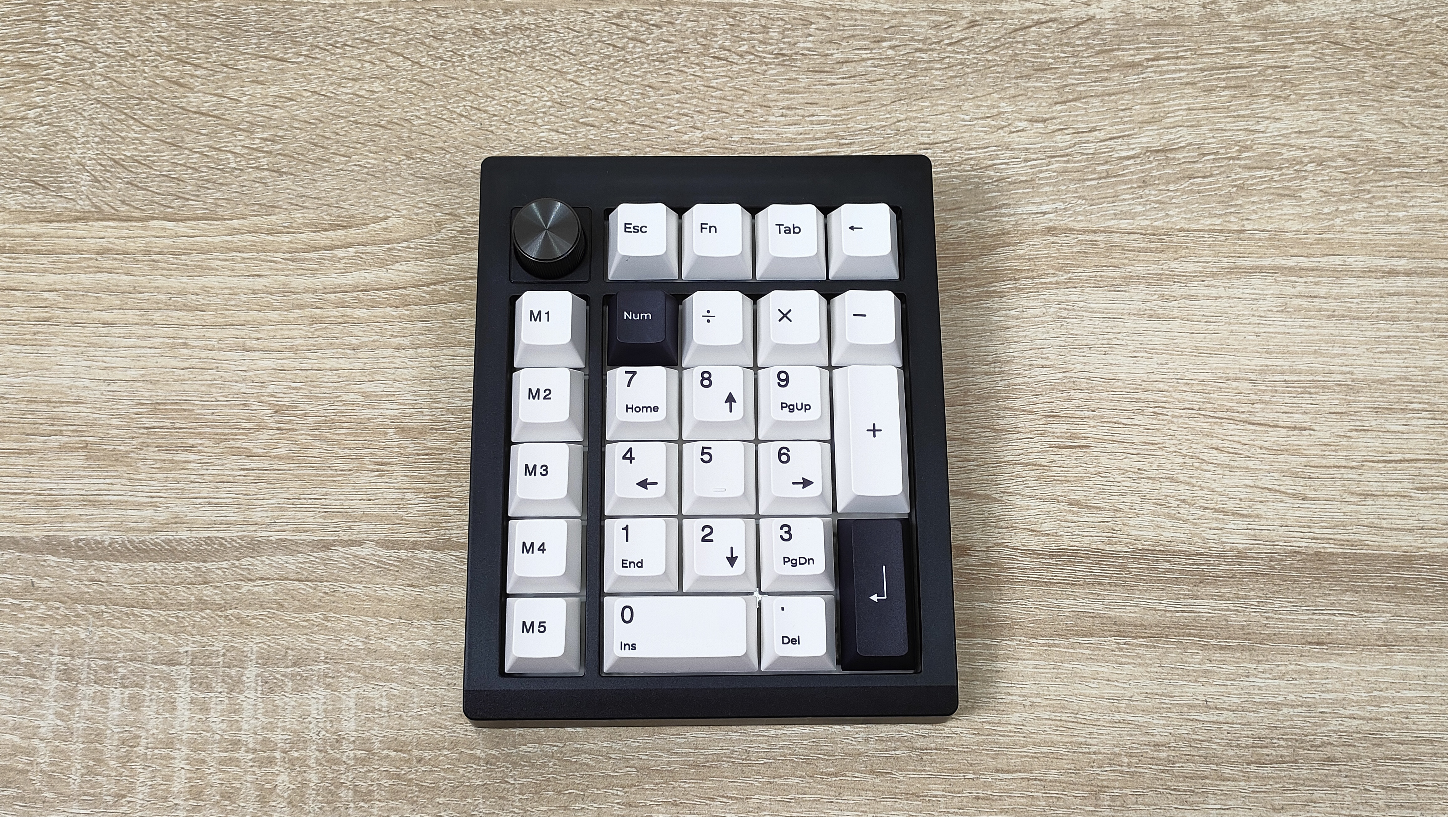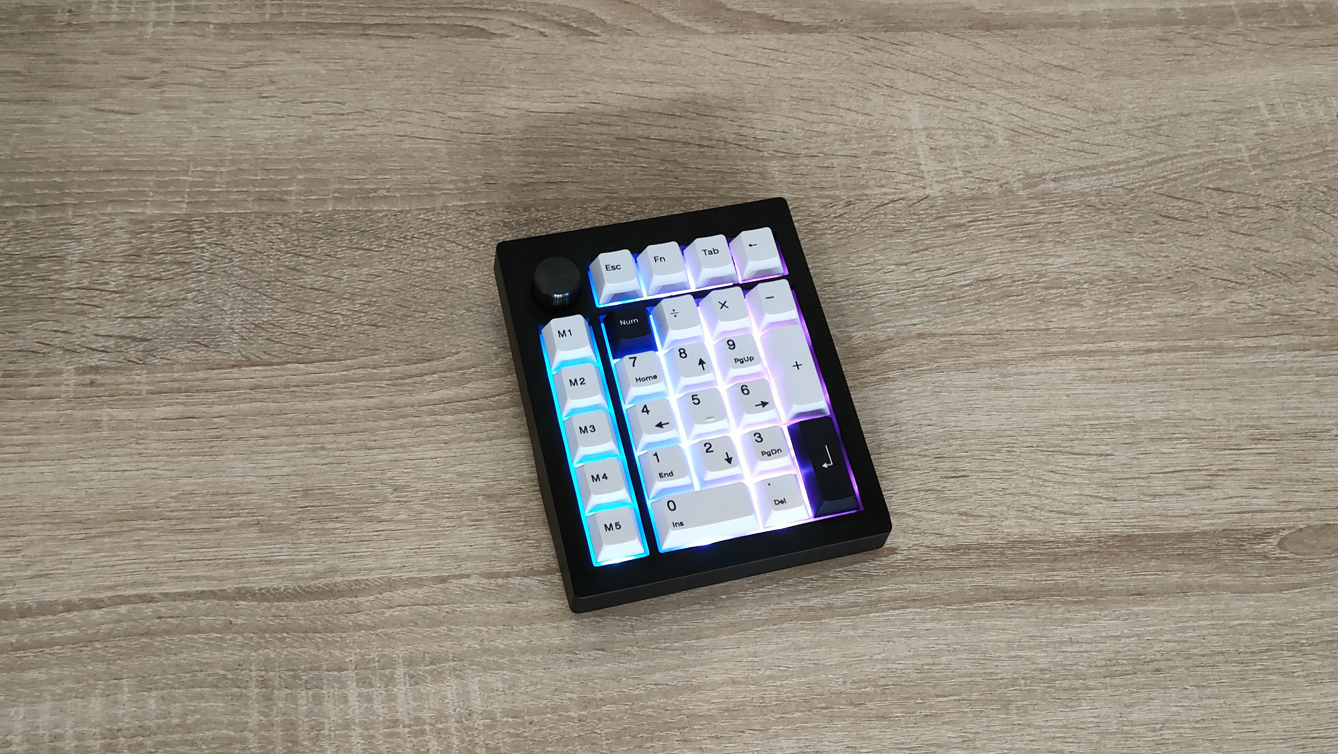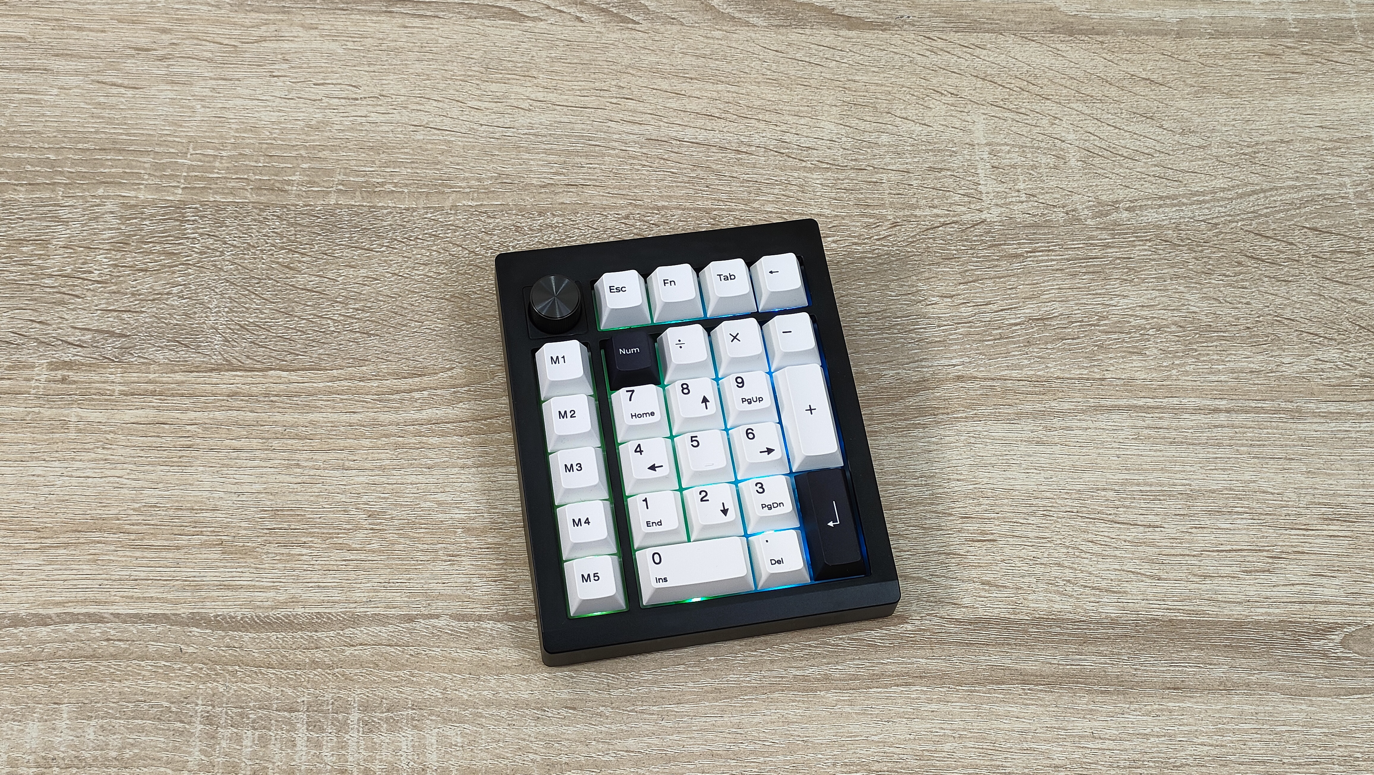 Клавиатурка, естественно, очень компактная, цифровой блок другим и не должен быть. Корпус пластиковый, соответственно клавиатура лёгкая. Расцветка классическая, подойдёт под большинство рабочих мест, кроме того, есть великое множество клавиатур с подобной. Передо мной расширенный цифровой блок с классической компоновкой, над основными клавишами есть несколько дополнительных, слева от него есть пять программируемых клавиш, на которых уже зашиты несколько макросов, а также есть энкодер слева наверху. Такое расположение уже намекает на то, что этот цифровой блок отлично расположится слева от клавиатуры, чтобы многие вещи можно было делать не отрывая руки от мыши. Формат примерно 20%, профиль колпачков Cherry или OEM- подобный.