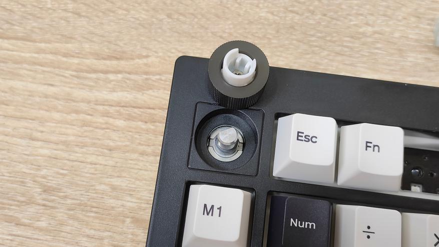 Разбирается клавиатура без каких-либо проблем, достаточно выкрутить четыре самореза по углам, и преодолеть усилие защёлок по бокам, а ещё, предварительно снять колпачок энкодера.