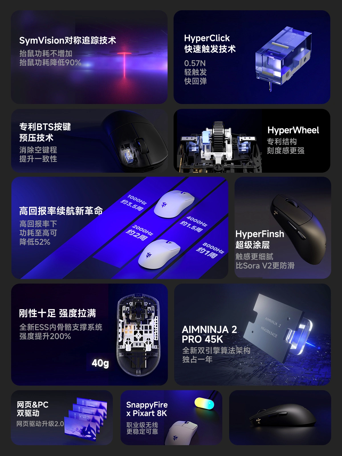 Sora V3 поддерживает частоту опроса 8 кГц как при проводном подключении через USB, так и в беспроводном режиме на частоте 2,4 ГГц. Частота сканирования сенсора достигает 22 000 кадров в секунду. В комплект поставки входит компактный приёмник PixArt с защитой от помех. Автономность мыши составляет около трёх с половиной недель при частоте опроса 1 кГц и около недели при максимальной частоте 8 кГц.