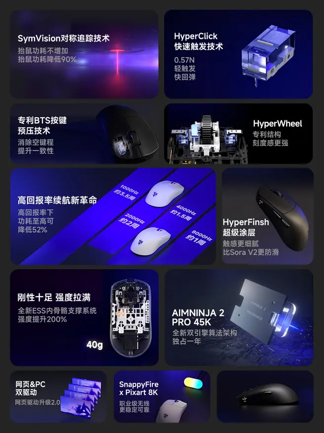 Корпус мыши разработан специально для хвата «коготь» и весит 40 граммов. Внутри установлена система поддержки ESS, обеспечивающая жесткость конструкции. Устройство оснащено микропереключателями HyperSwitch производства ESS с усилием срабатывания 0,57 ньютона, колесом прокрутки HyperScroll и противоскользящим покрытием HyperFinsh.