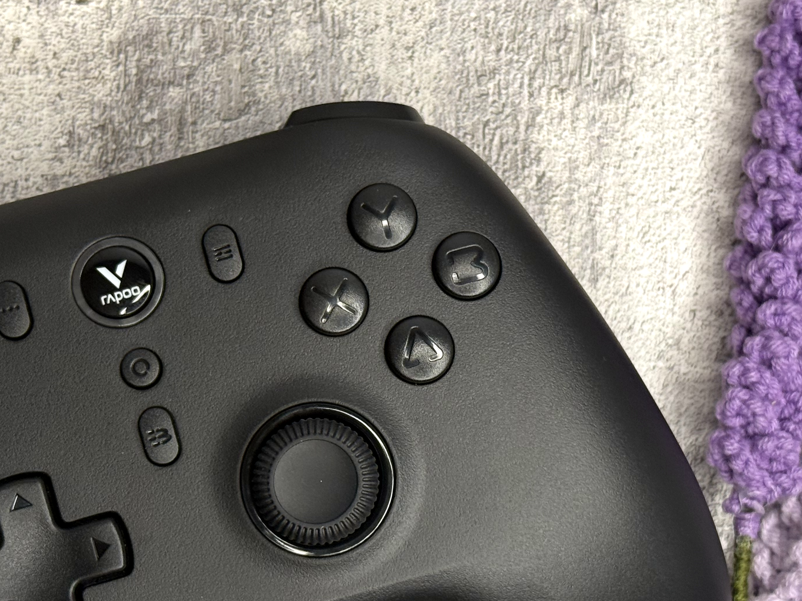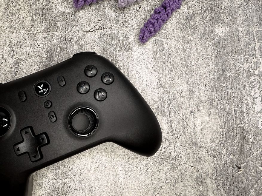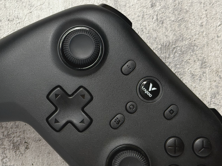 Правее и чуть выше располагается кнопка Home с эмблемой фирмы RAPOO, окантовка вокруг нее — это подсветка. По бокам от кнопки Home расположились дополнительные кнопки: Select Button и Start Buttom. Чуть ниже: Capture (можно перевести устройство в режим мышки) и Turbo (соответственно настройка турбо-режима, а так же настройка вибрации).