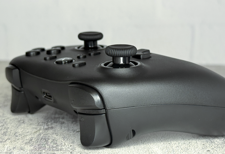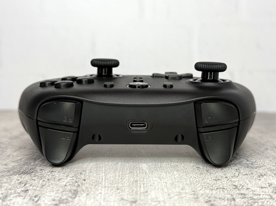 На задней панели находятся кнопки RB, LB, RT, LT и разъём Type-C для проводного подключения и зарядки. Заряда должно хватить до 15 ч работы. Обозначения что на триггерах, что на бамперах заметны, не сильно бросаются в глаза.