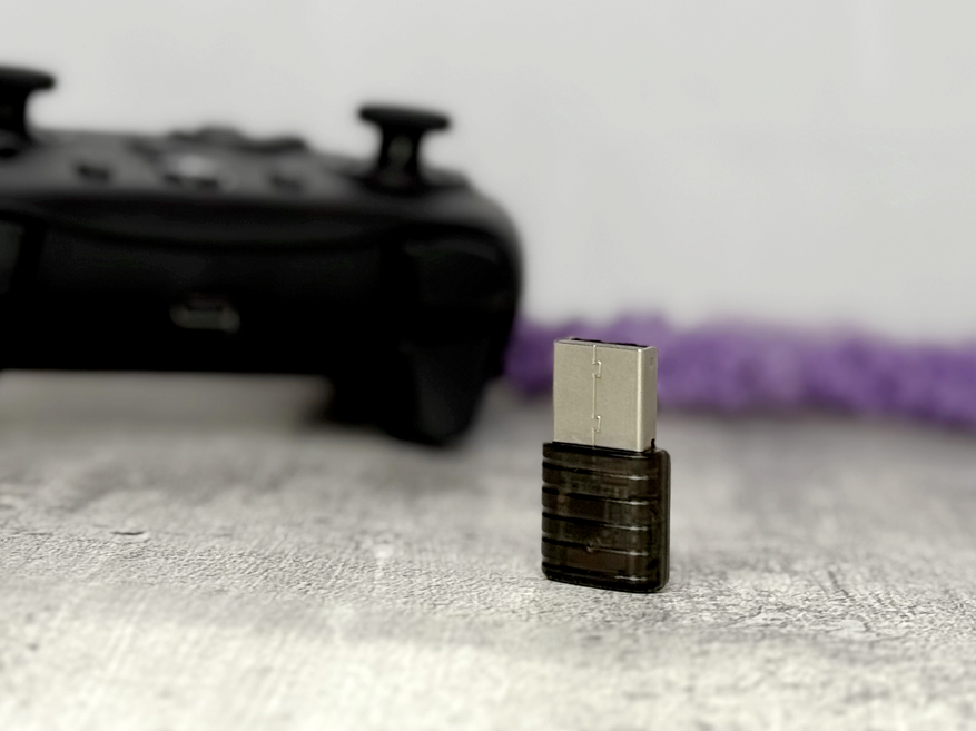 USB-ресивер довольно компактный, выполнен из глянцевого, слегка прозрачного пластика. Надписей нет, лишь легкая ребристость с одной стороны.
