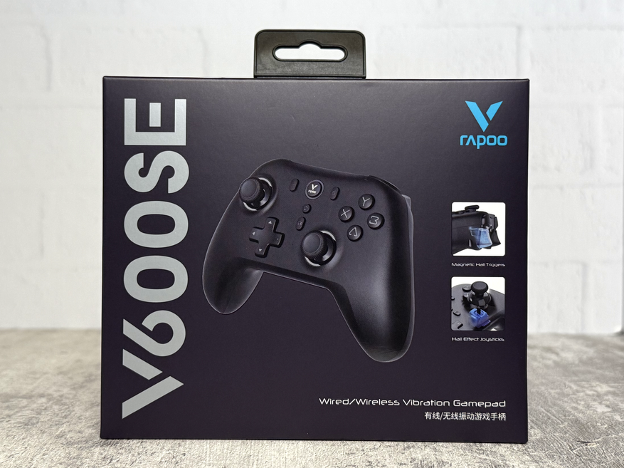 Геймпад поставляется в коробке из темно-синего картона, на первый взгляд достаточно тонкого. В целом упаковка небольшая и смотрится органично. Напечатаны как изображение самого геймпада с названием модели слева от картинки, так и основные отличительные особенности.