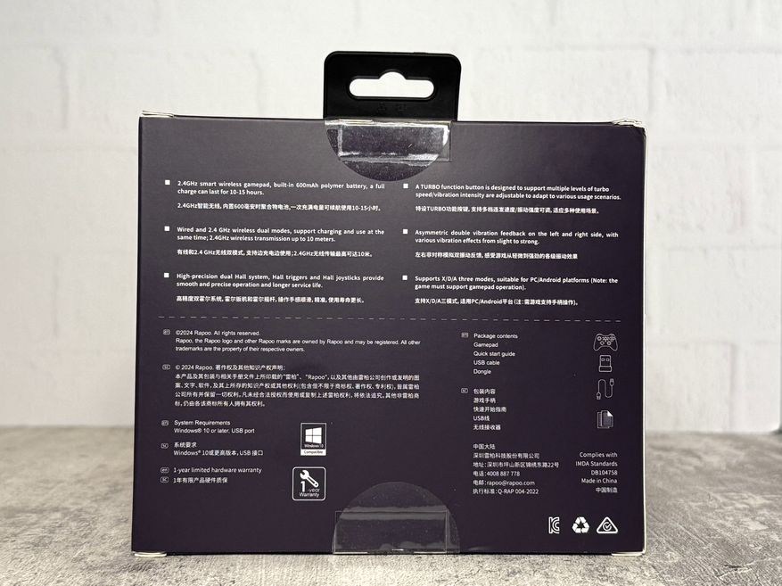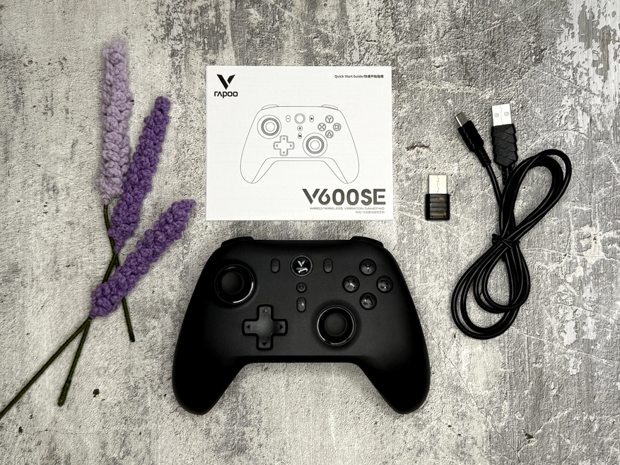 Внутри коробки находится пластиковая подложка, на которой расположились сам геймпад в защитном пакетике и чуть ниже — USB-ресивер. Именно благодаря данной подложке упаковку можно назвать действительно крепкой.