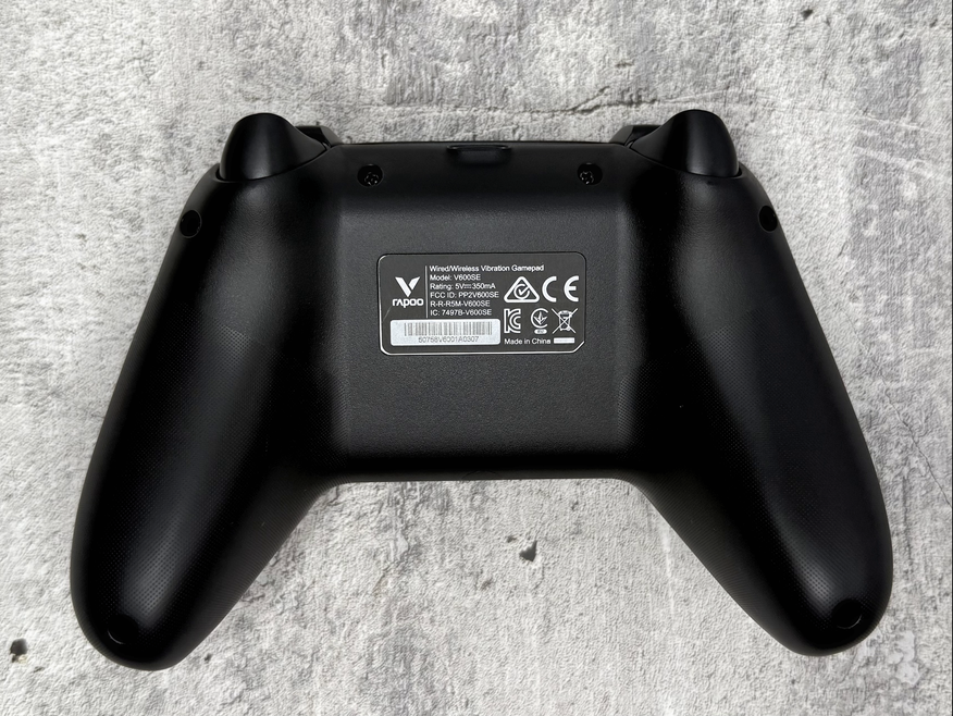Геймпад Rapoo V600SE имеет классический дизайн: корпус эргономичной и симметричной формы, изготовлен из черного прочного пластика, шероховатого на ощупь. Плюс такого матового покрытия: не скользит в руках и не оставляет на себе следы. Каких-либо декоративных вставок нет. Все выполнено лаконично и очень похоже на геймпад от Xbox, только в монохромно-черном стиле.