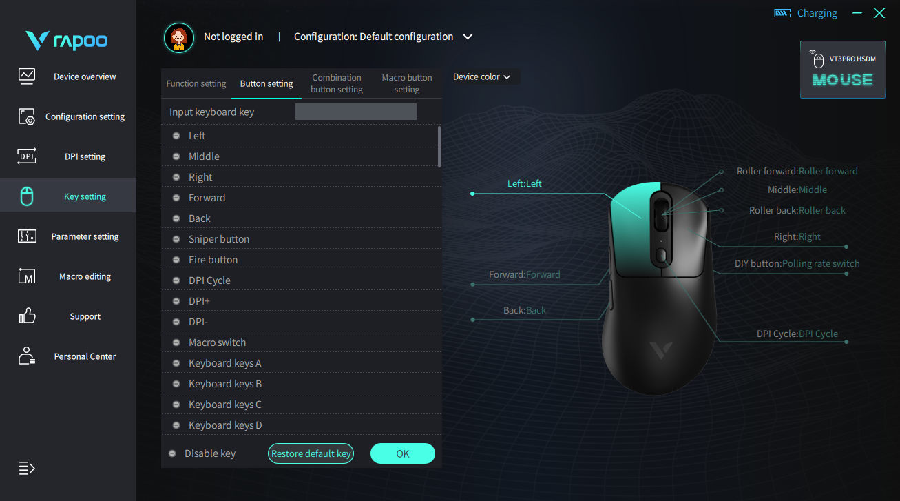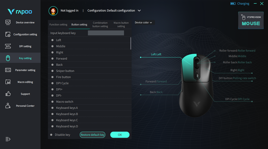 Вкладка Key settings позволяет перепрограммировать любую кнопку на мышке под любые задачи. От добавления макросов до мультимедиа. Благодаря такому решению каждый пользователь сможет настроить кнопки под свои программы и игры.