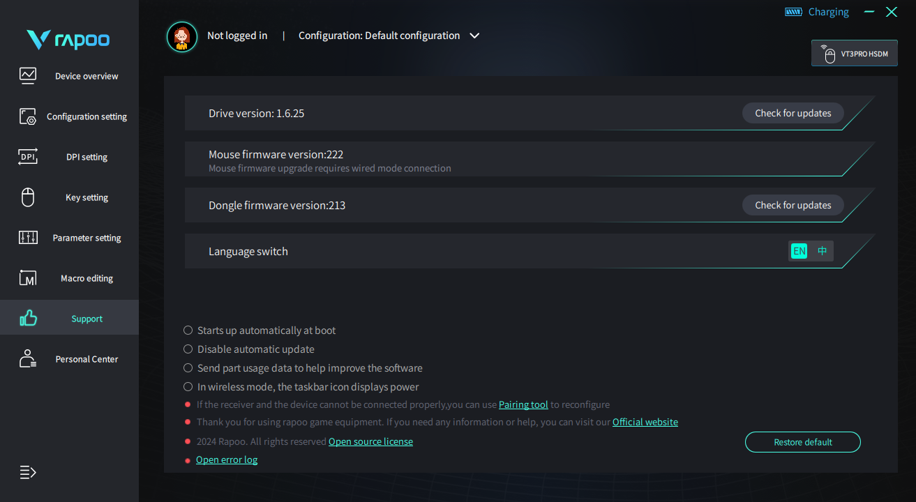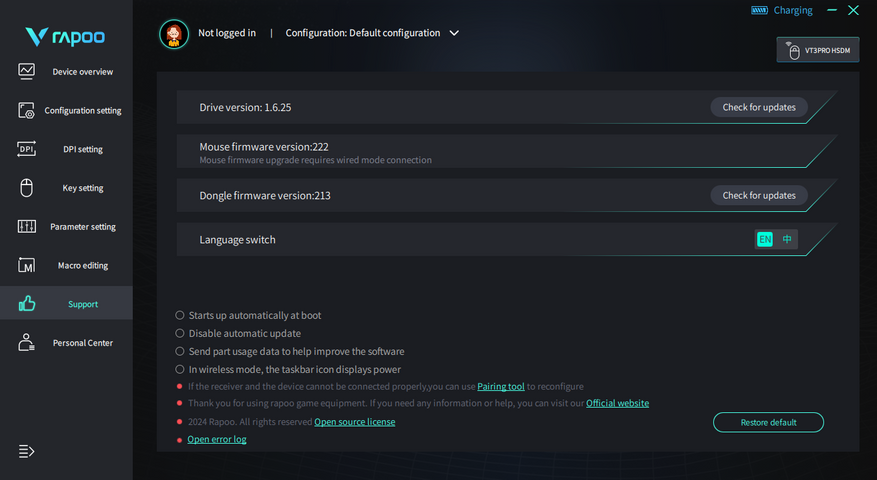 Софт также позволяет обновлять программное обеспечение самой мышки, так и донгла для беспроводного подключения. Здесь происходит смена языка, доступен английский и китайский.