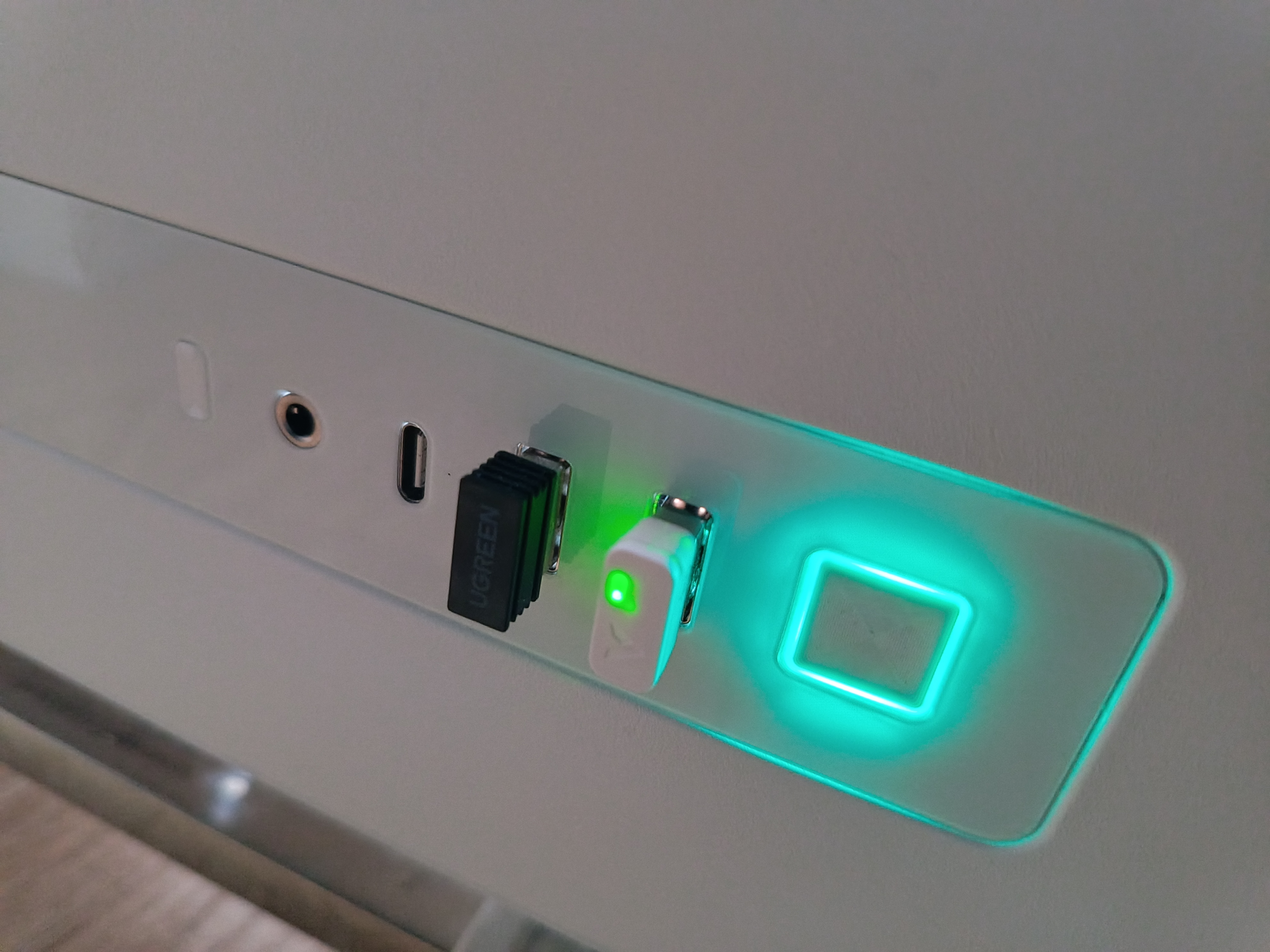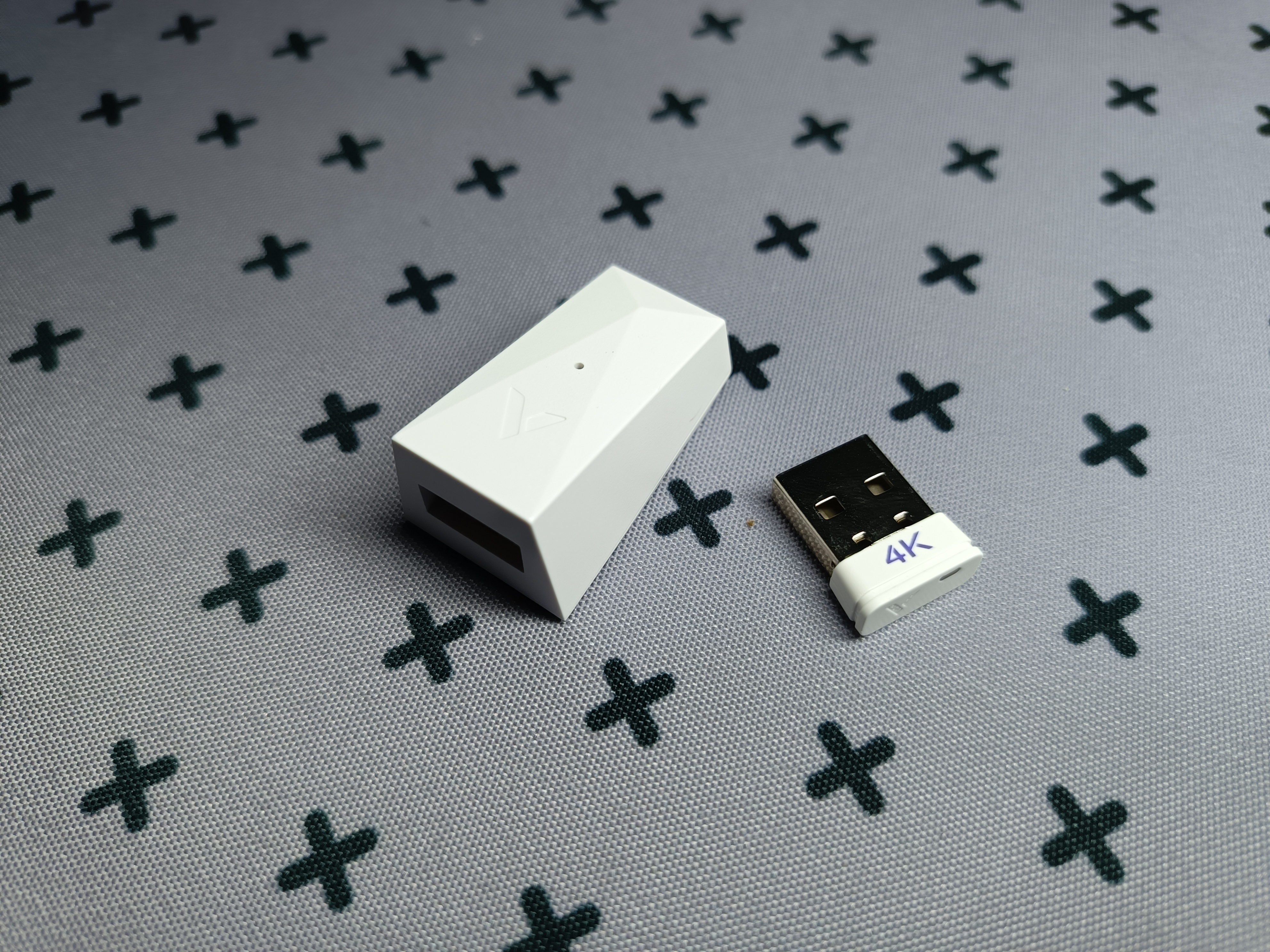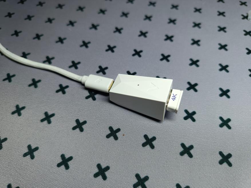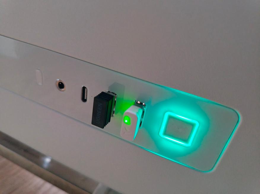 Белый донгл для беспроводного подключения с фирменным логотипом и неярким зеленым светодиодом. Он выделяется среди других устройств.