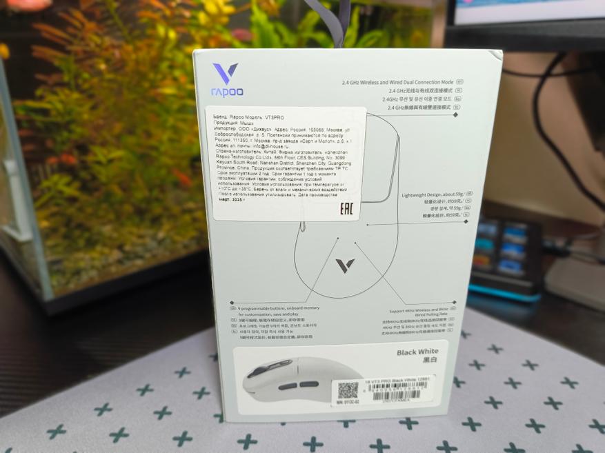 Мышка упакована в фирменную стильную упаковку, выполненную в переливающимся стиле хамелеон. Повсюду расписаны основные параметры и характеристики мышки. В целом типичная упаковка, но на ней присутствуют пломбы от несанкционированного доступа, а следовательно, если они будут нарушены, стоит задуматься, что на это была причина. Так что обратите на это внимание перед покупкой.