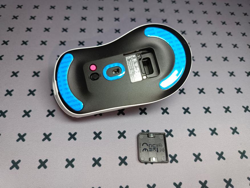 Снизу под магнитной крышкой расположился донгл для беспроводного подключения. Внешне это обычная крышка, но если докупить специальный модуль Rapoo P3 и установив вместо заводской крышки, вы получите беспроводную зарядку. Интересное решение, но, к сожалению, придется покупать отдельно, хотя стоит модуль недорого. Возьмите во внимание, что вы купите только сам блок для беспроводной зарядки, но вам также потребуется и сама беспроводная зарядка. Мышка потребляет небольшой ток, поэтому сгодится стандартная зарядка на 10 Вт.