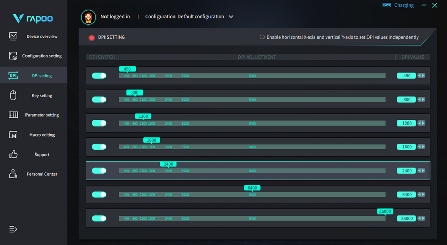 Во вкладке DPI setting настраивается скорость работы мышки. Можно выставить от 50 до 26000 DPI, и это всё благодаря топовому оптическому сенсору Pixart PAW3398. Всего семь ячеек, где можно выставить DPI в представленном диапазоне с шагом в 50 DPI. Если вам не надо столько режимов, то можно их выключить и оставить, к примеру, только один или два.