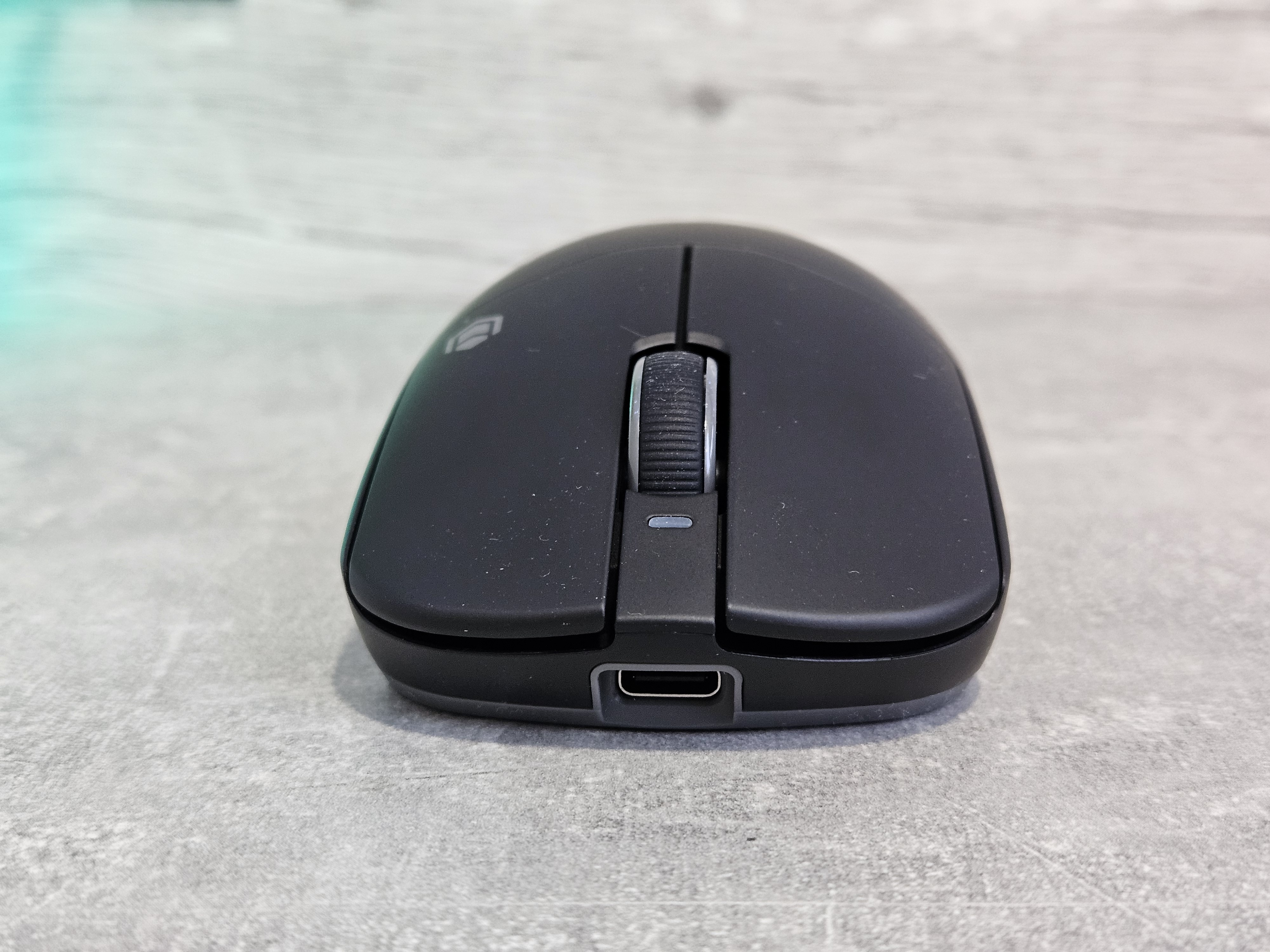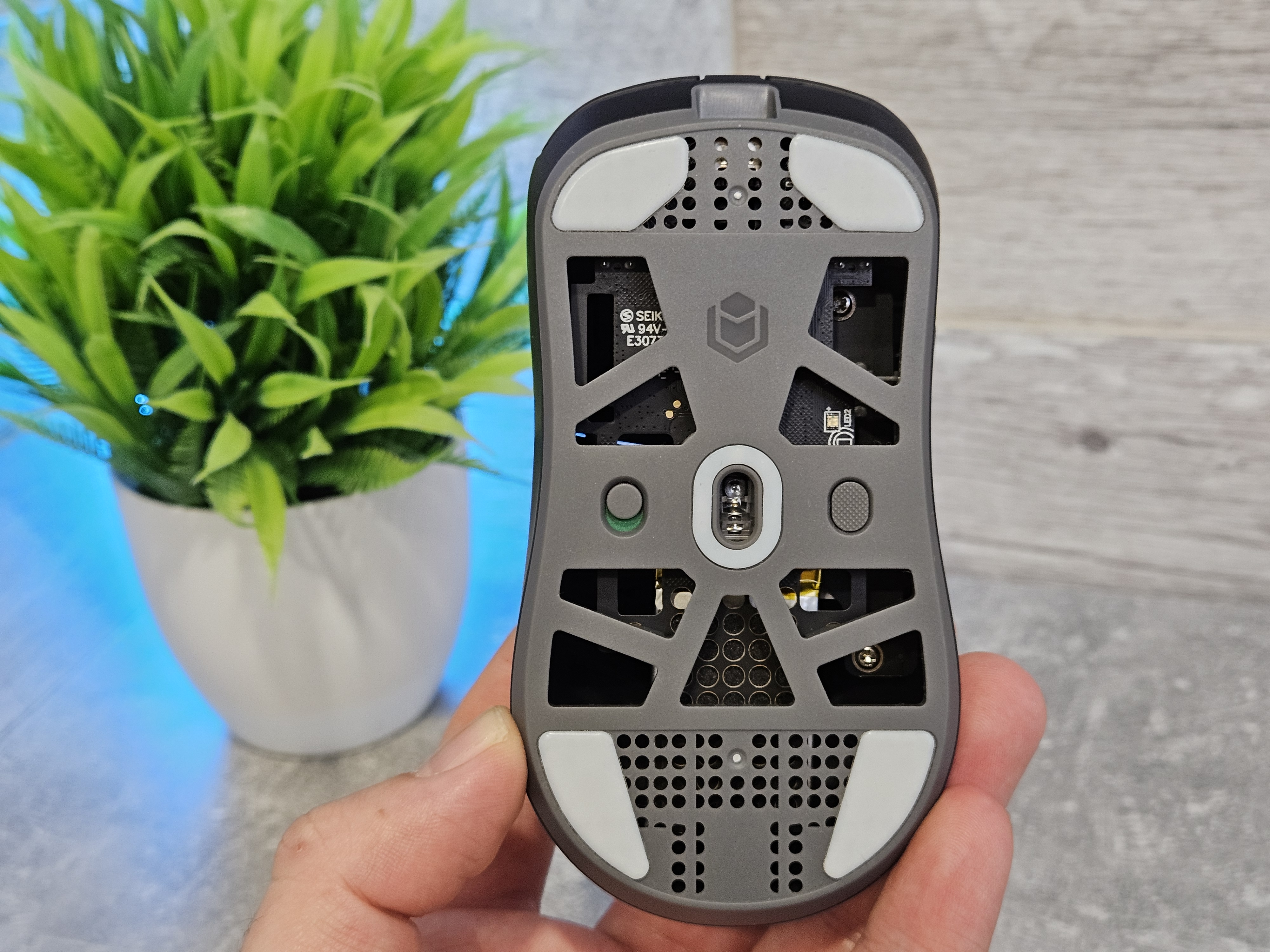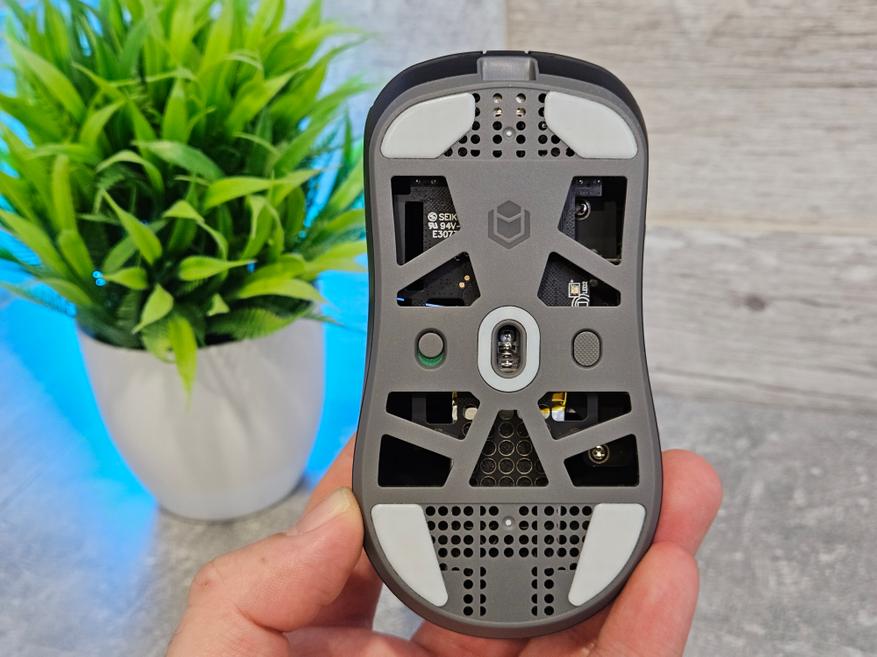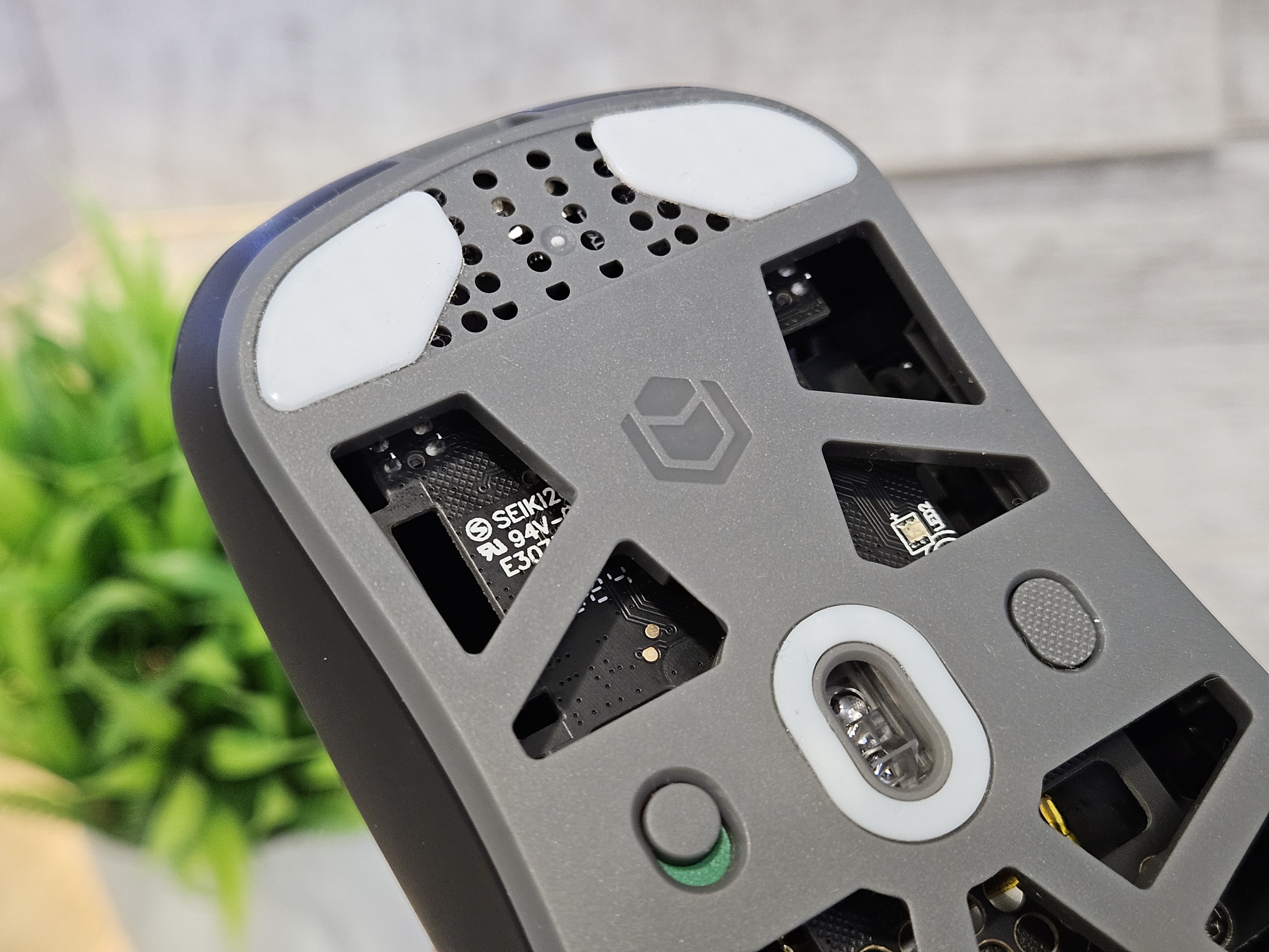 На переднем торце — порт зарядки usb type c. Переворачиваем мышку и изучаем нижнюю часть! Здесь в первую очередь бросается в глаза светло серый цвет пластика и огромные угловатые прорези на пластике, благодаря которым видна начинка девайса. По дефолту наклеены «скоростные» глайды белого цвета. Если скольжения будет слишком много — можно их заменить на входящие в комплект более «точные». Так же на подошве кнопка включения\выключения и кнопка изменения DPI.