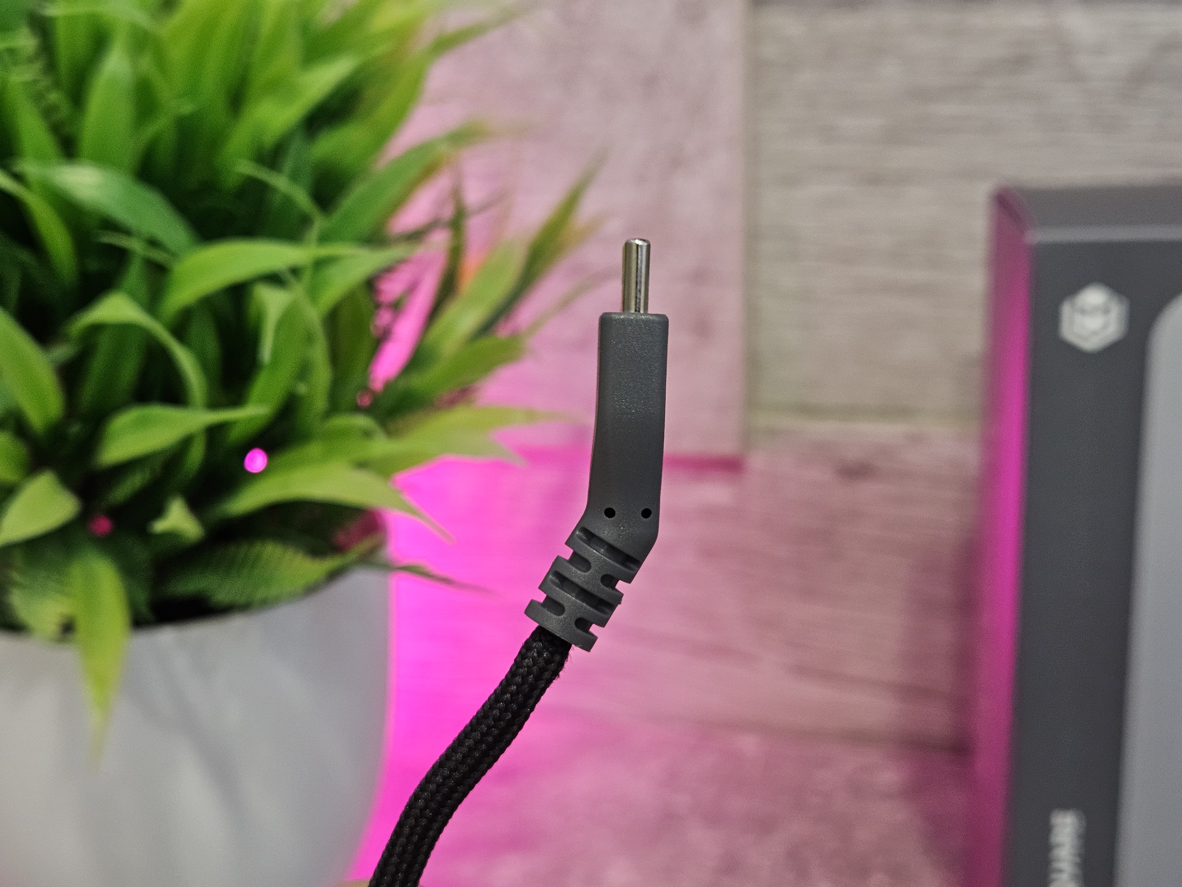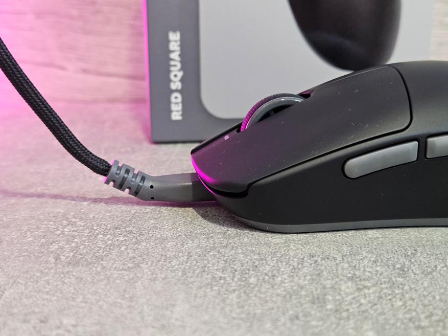 Как видите комплектация довольно «жирненькая» по текущим меркам. Особенно мне понравился паракордовый кабель зарядки. Разьем USB TYPE C на нем не прямой, а немного загнут наверх для удобства использования мышки во время зарядки. Плюс имеется очень удобная резиновая застежка.