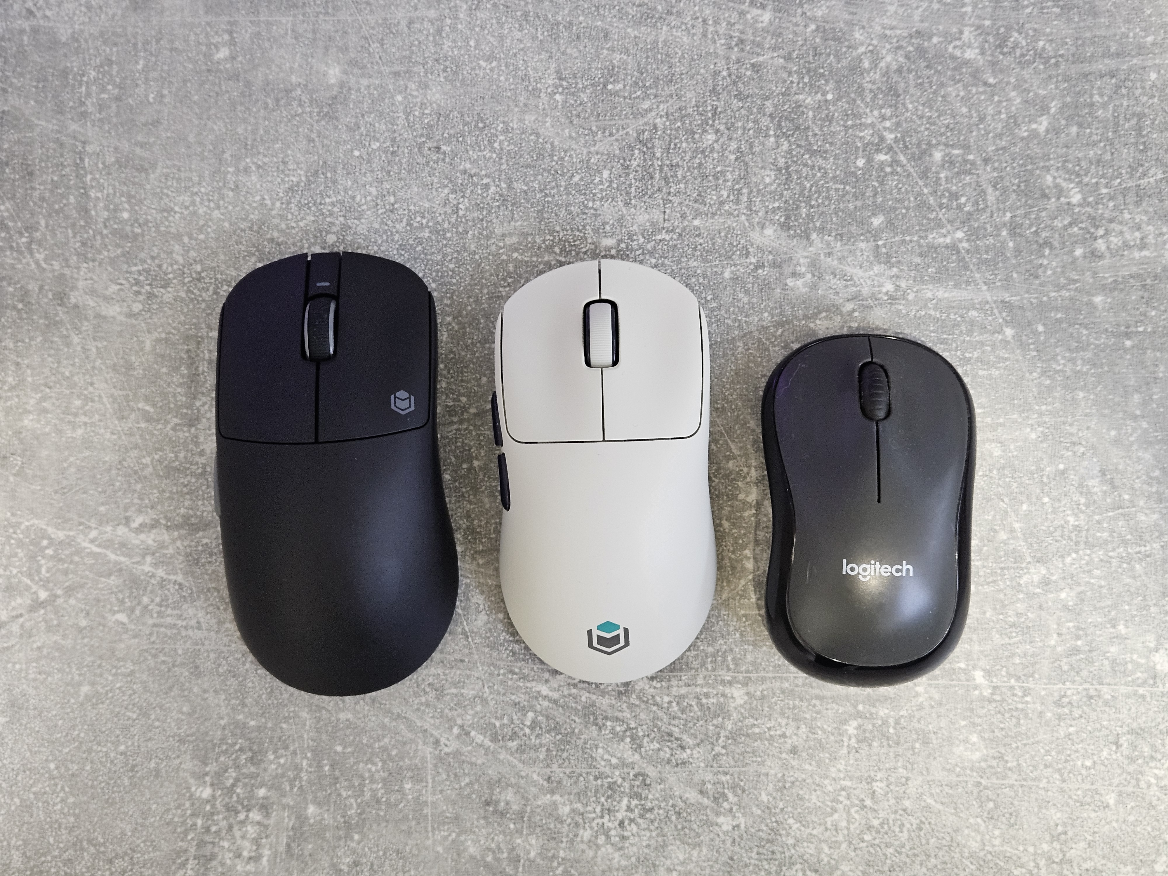 Всего в модельном ряду доступно 5 вариантов цвета — Dark, Ice Cream, Light, Mint, Amethyst. Я выбрал себе классический черный цвет, то есть IO Aurora Dark. Набор кнопок на борту привычный. Левая и правая клавиши + центральный скролл, на который так же можно нажимать. Около скролла небольшой диод — индикатор зарядки. Так же есть две дополнительные кнопки на левом боку. Корпус полностью симметричный и подойдет как для правши, так и для левши, хотя в этом случае придётся пожертвовать двумя кнопками на боку. Размер 124,6 x 64,9 x 38,7 получился немного крупнее моделей Nova / Nova Pro / Nova SE. Для сравнения ниже будет фото IO Aurora vs IO Nova SE vs Logitech M220.
