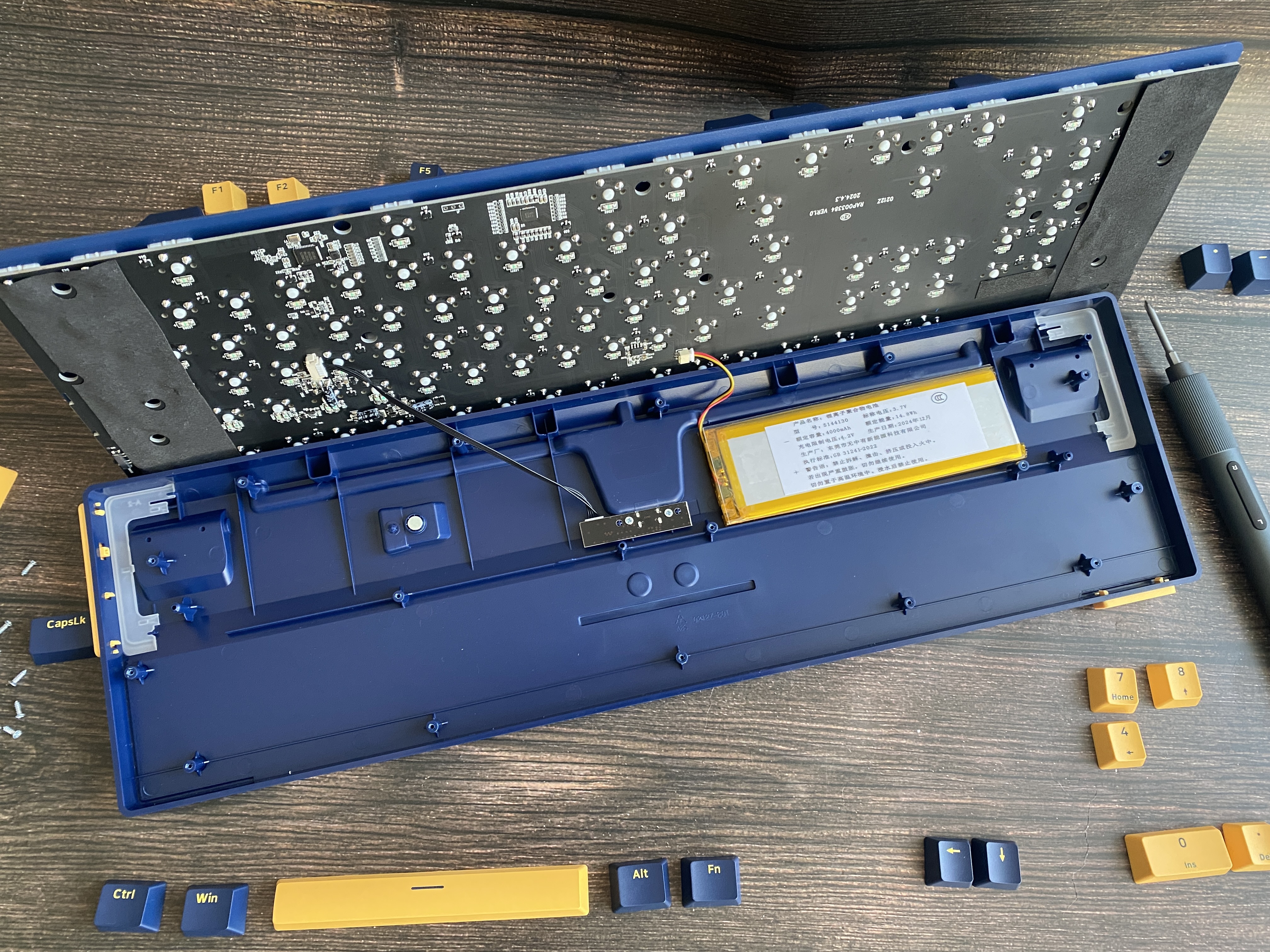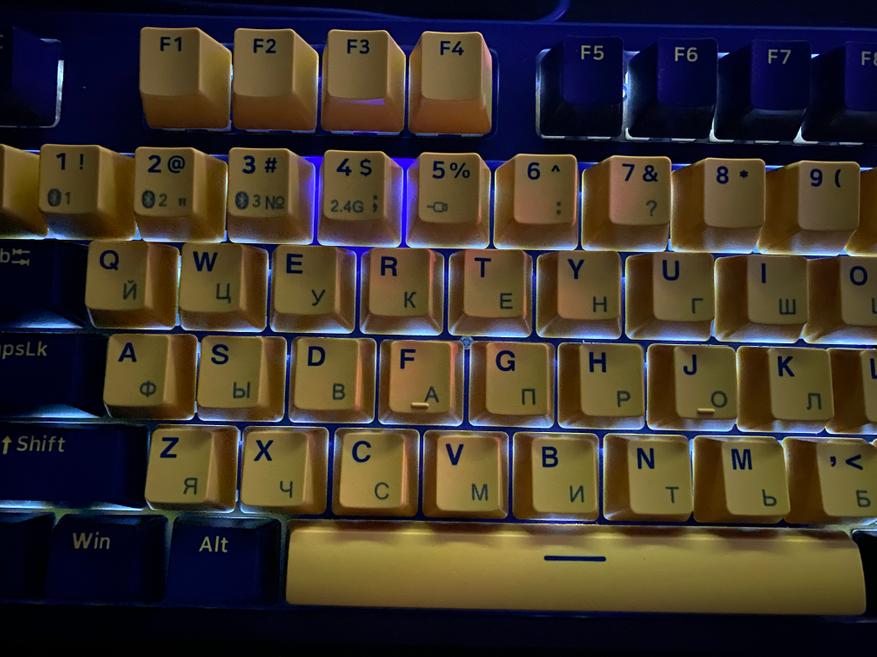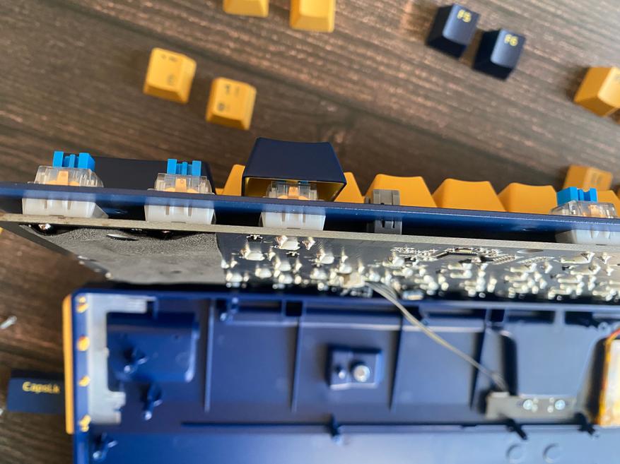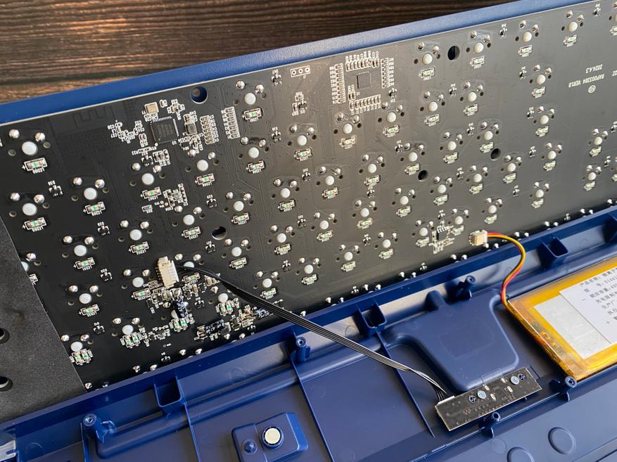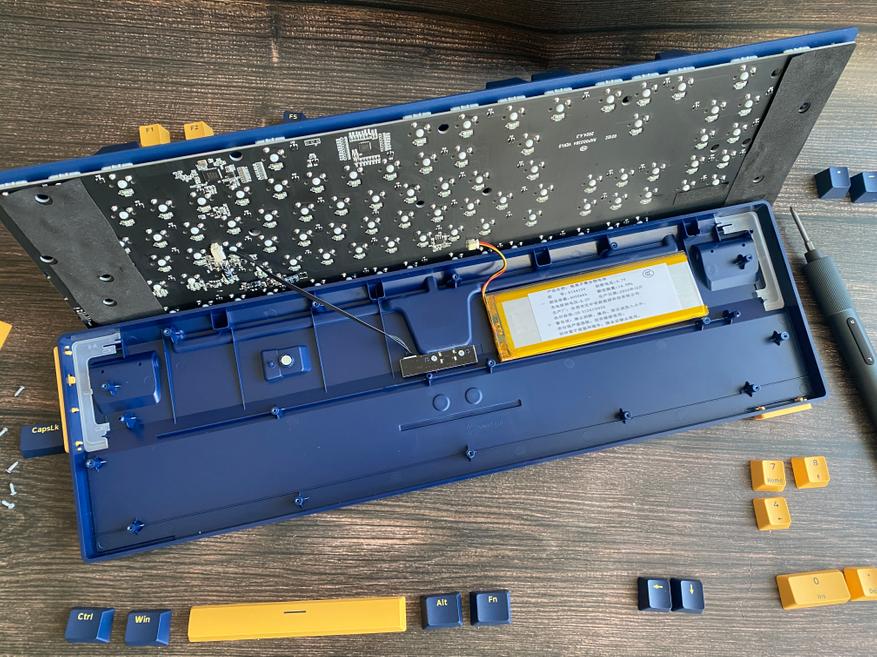 Для того чтобы разобрать клавиатуру, нам необходимо снять верхнюю накладку, снять несколько кейкапов при помощи пуллер и открутить некоторое количество винтов обычной крестовой отверткой. Кейкапы сделаны из PBT-пластика в OEM-профиле. Символы нанесены методом двойного литья, что в свою очередь обеспечивает высокую износостойкость. В клавиатуре установлены свитчи Blue с ресурсом 60 миллионов нажатий. Данная модель клавиатуру не имеет горячей замены свитчей «Hot Swap», но конечно, при желании свитчи можно поменять используя паяльник. Длинные клавиши оснащены стабилизаторами для равномерного нажатия. За бесперебойную работу, в клавиатуре установлен аккумулятор с емкостью 4000 мАч. При выборе радиоканала 2,4 ГГц клавиатура смогла проработать 35 часов, при выборе режима Bluetooth и отключении подсветки, время работы сильно возрастает и достигает больше 100 часов. Конечно данное время работы может меняться в зависимости от выбранного режима подключения и яркости подсветки. На самом деле, порадовало, что клавиатура имеет проводное подключение и пользователь может осуществлять зарядку аккумулятора и продолжать работу по кабелю USB. После полной разборки клавиатуры, можем заметить, что внутри нет шумоизолирующего материала, но если заморочиться, то можно проложить его самостоятельно.