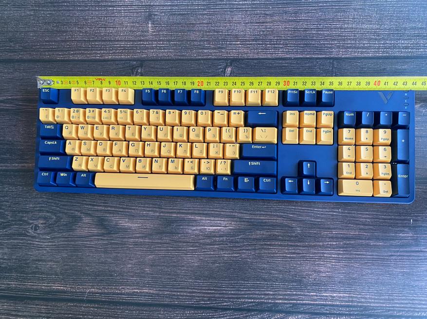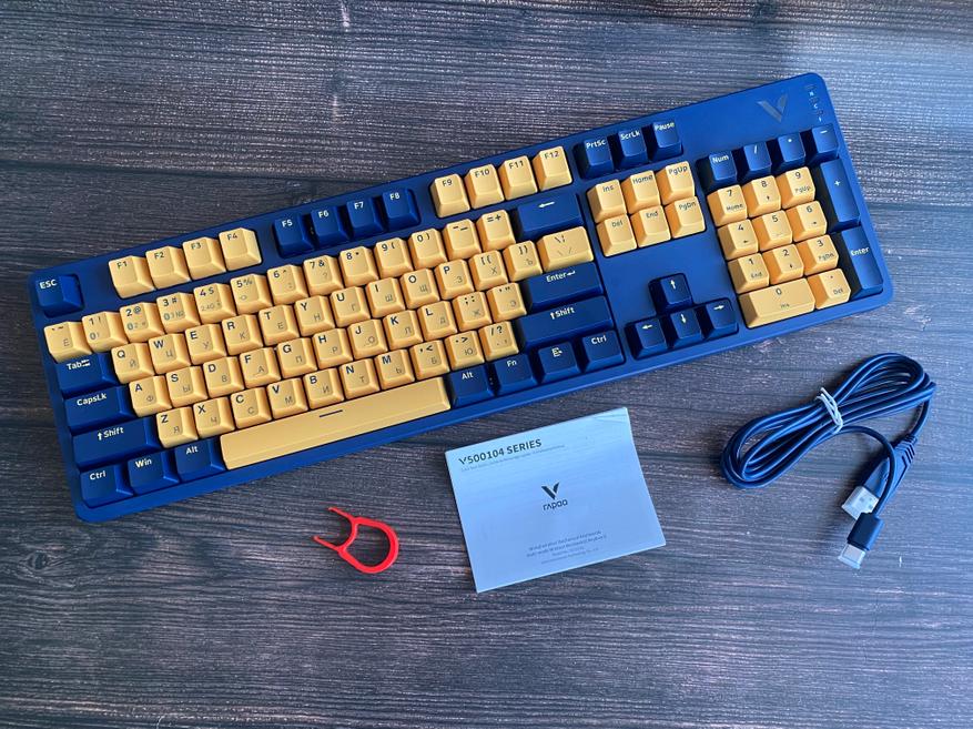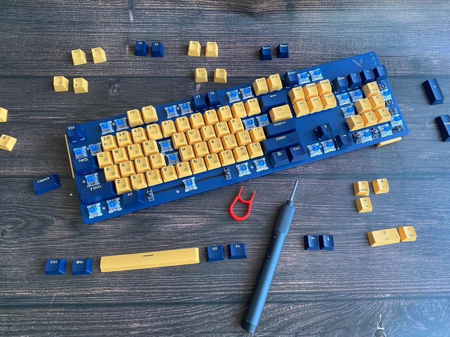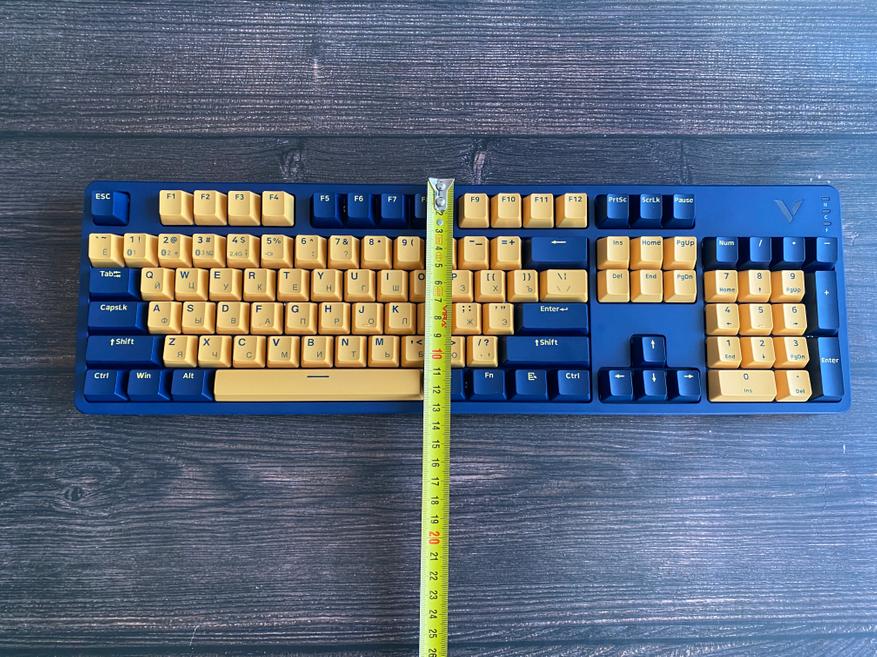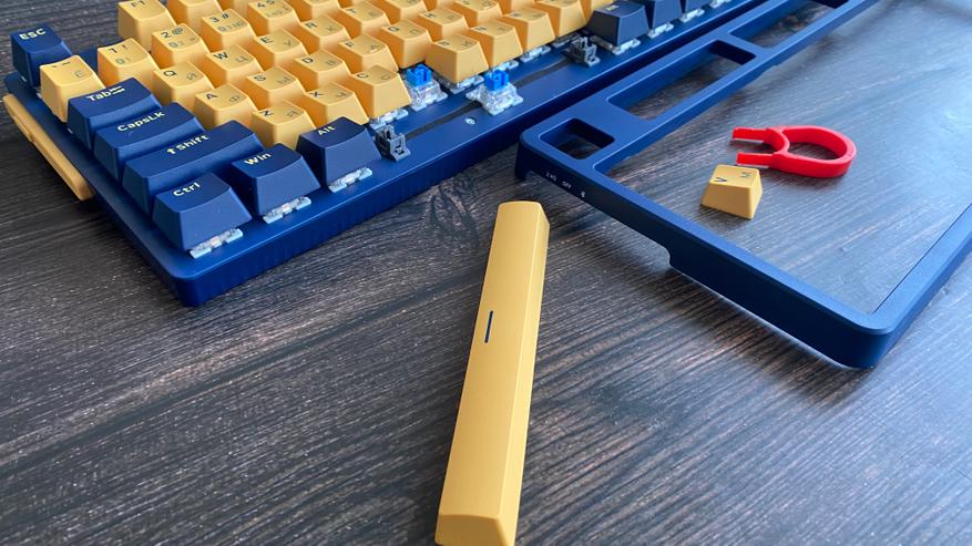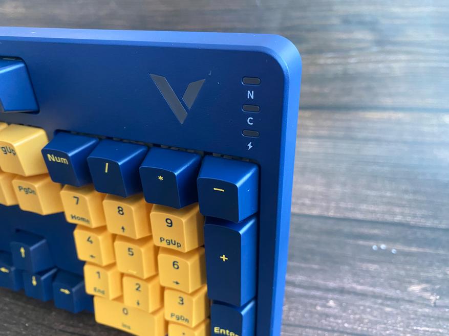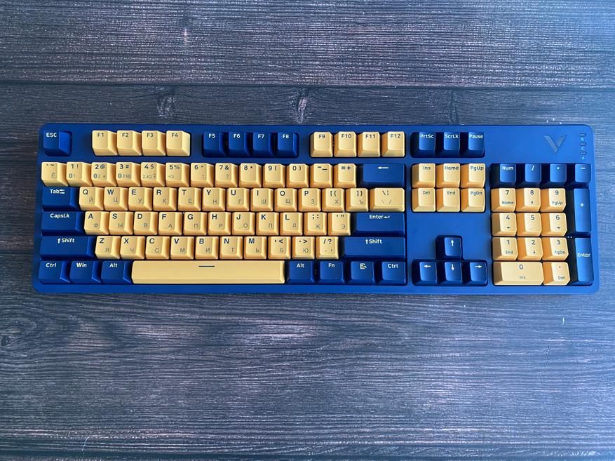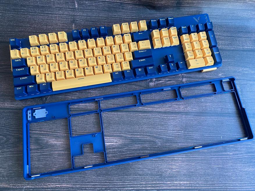 Представленная клавиатура имеет сине-желтый цвет, но производитель предлагает на выбор и другие цвета, такие как: бело-лазурный, бежево-серый, бежево-зеленый, черно-белый. Благодаря большому выбору цветов, каждый пользователь может выбрать клавиатуру под свой сетап и дизайн рабочего места. Клавиатура представлена в полноразмерном виде и имеет 104 клавиши с цифровым блоком. Внешний вид клавиатуры определенно имеет свой лаконичный шарм и намек на геймерское решение, благодаря красочному оформлению. Шрифт вполне стандартный и удобный, переучиваться не прийдется. С правой стороны имеется логотип компании и светодиодные индикаторы выбранного режима и работы клавиатуры. По умолчанию клавиатура имеет высокий профиль, но после снятия верхней панели, пользователь получает новый стиль корпуса «скелетон» с открытыми переключателями. Верхняя панель надежно фиксируется при помощи контурных магнитов и с первого взгляда трудно понять, что она съемная.