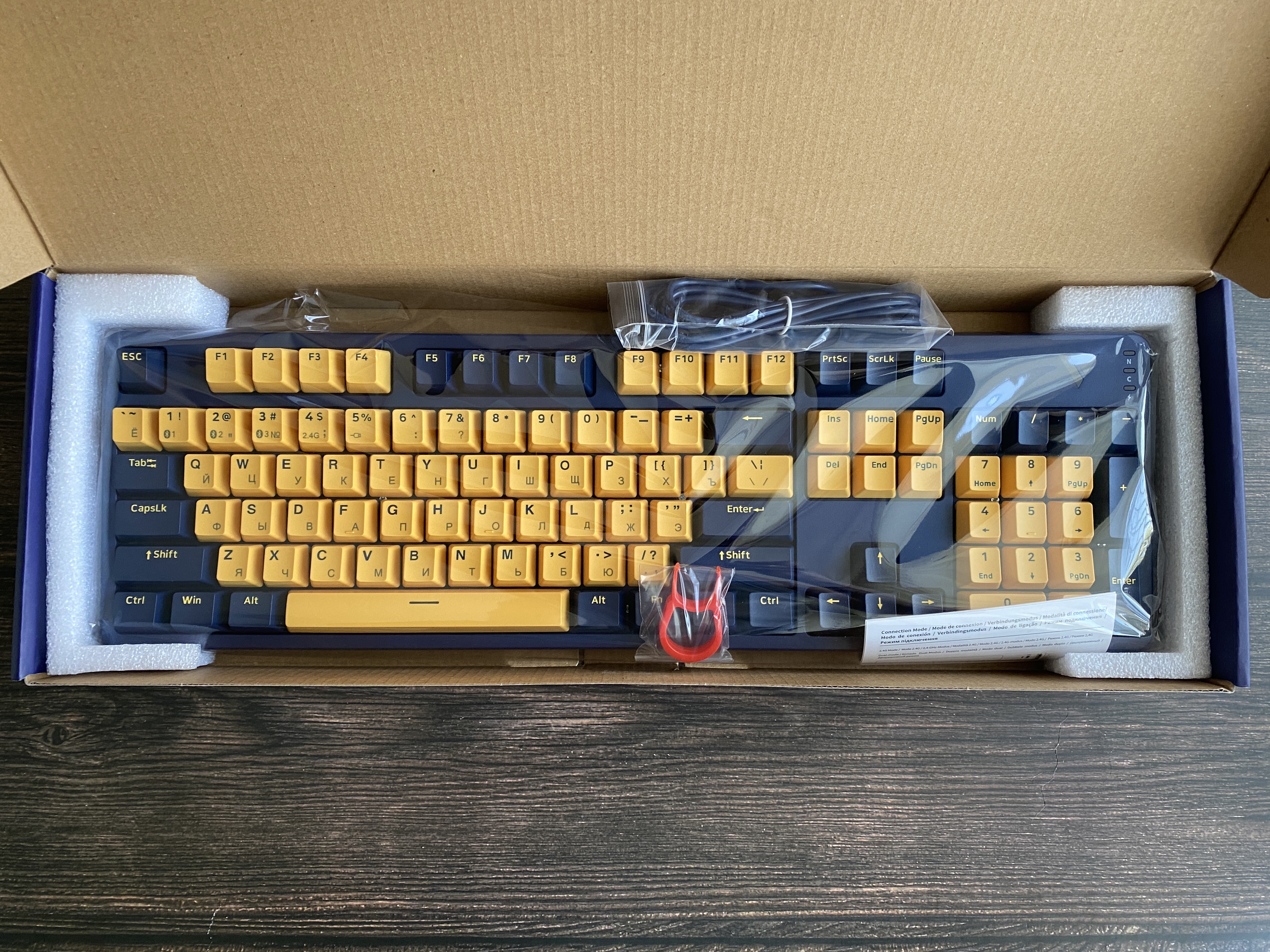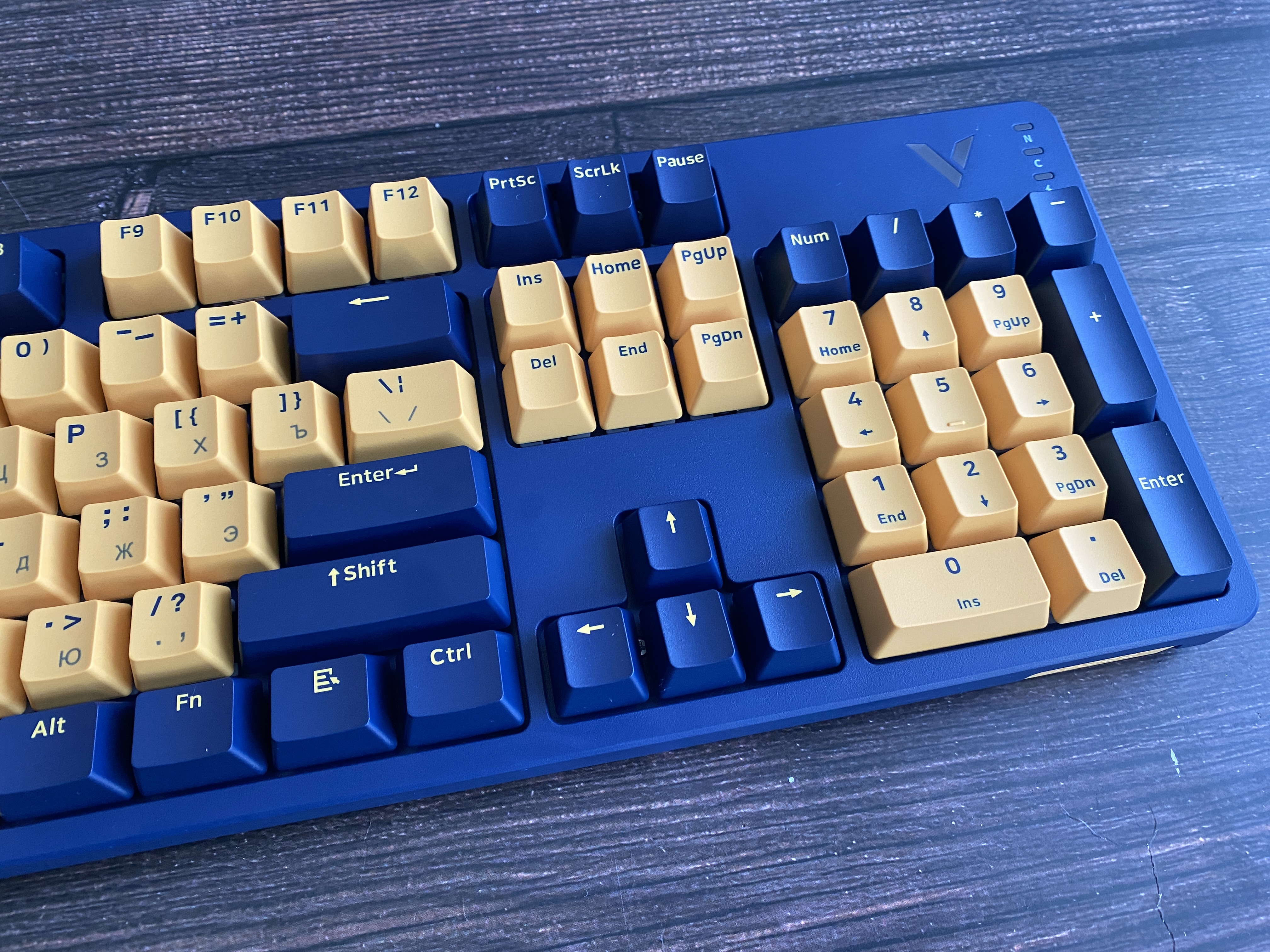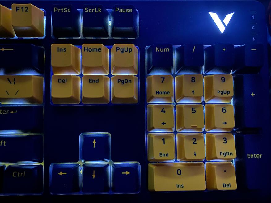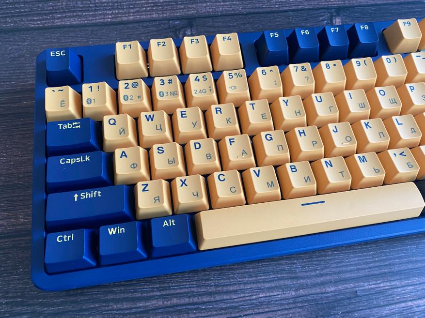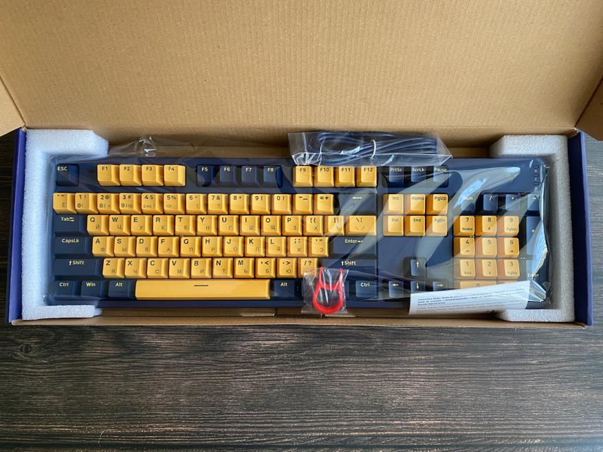 Представленная клавиатура имеет сине-желтый цвет, но производитель предлагает на выбор и другие цвета, такие как: бело-лазурный, бежево-серый, бежево-зеленый, черно-белый. Благодаря большому выбору цветов, каждый пользователь может выбрать клавиатуру под свой сетап и дизайн рабочего места. Клавиатура представлена в полноразмерном виде и имеет 104 клавиши с цифровым блоком. Внешний вид клавиатуры определенно имеет свой лаконичный шарм и намек на геймерское решение, благодаря красочному оформлению. Шрифт вполне стандартный и удобный, переучиваться не прийдется. С правой стороны имеется логотип компании и светодиодные индикаторы выбранного режима и работы клавиатуры. По умолчанию клавиатура имеет высокий профиль, но после снятия верхней панели, пользователь получает новый стиль корпуса «скелетон» с открытыми переключателями. Верхняя панель надежно фиксируется при помощи контурных магнитов и с первого взгляда трудно понять, что она съемная.
