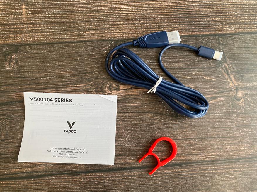Упакована беспроводная клавиатура Rapoo v500 pro в обычную картонную коробку фиолетового цвета без изображения самой модели на лицевой части. На коробке имеется только логотип компании, название модели, а также технические характеристики, которые будут определенно необходимы при выборе клавиатуры для повседневного использования. Открыв коробку мы можем увидеть, что клавиатура зафиксирована с двух сторон при помощи вставок из вспененного материала. Также, для предотвращения мелких потертостей, клавиатура уложена в индивидуальный плотный пакет. Комплектация весьма стандартная и включает в себя только самое необходимое, а именно: Клавиатуру Rapoo v500 pro, кабель USB-A — USB Type-C, инструкцию, пластиковый пуллер для кейкапов.
