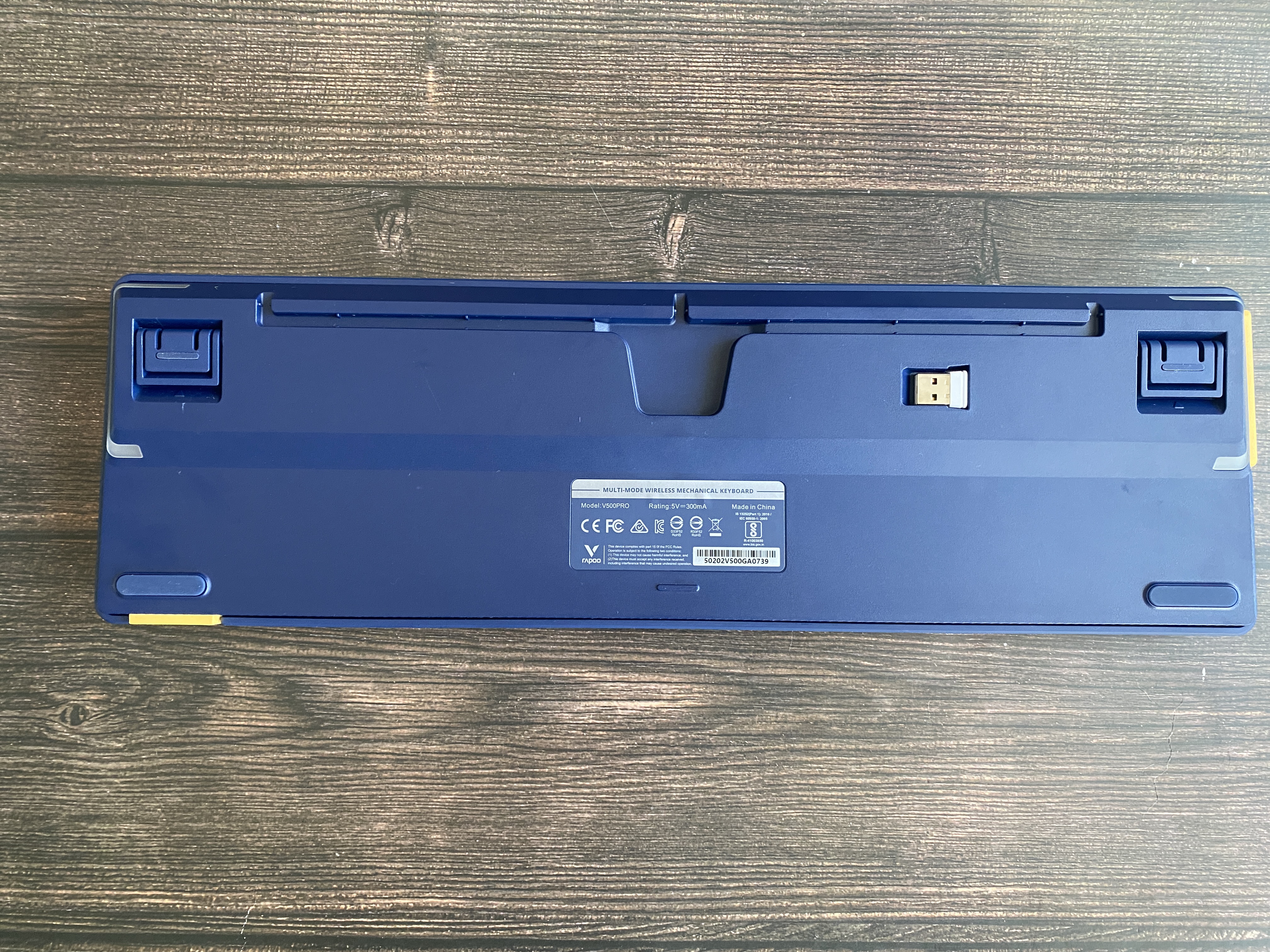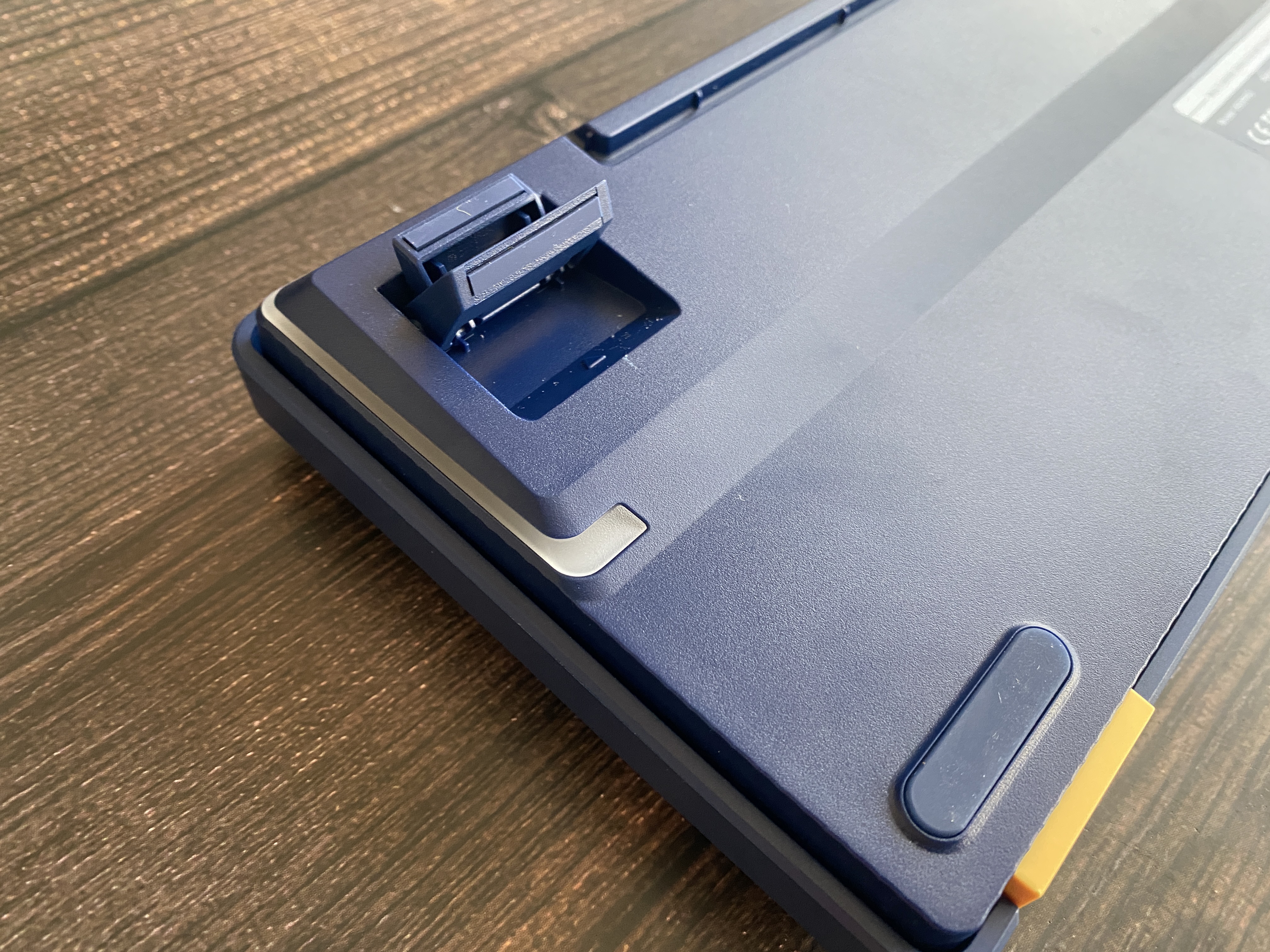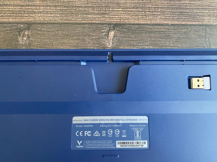 На обратной стороне клавиатуры мы можем увидеть резиновые ножки и откидные ножки с двумя уровнями регулировки на 5 и 10 мм. Также можем заметить выемку для укладки USB кабеля и спрятанный разъем USB Type-C в нише. Также на нижней части имеется ниша с магнитным креплением для беспроводного адаптера. Также хочется отметить, что сборка клавиатуры, на мой взгляд, весьма качественная и все соединительные зазоры ровные и не имеют дефектов.