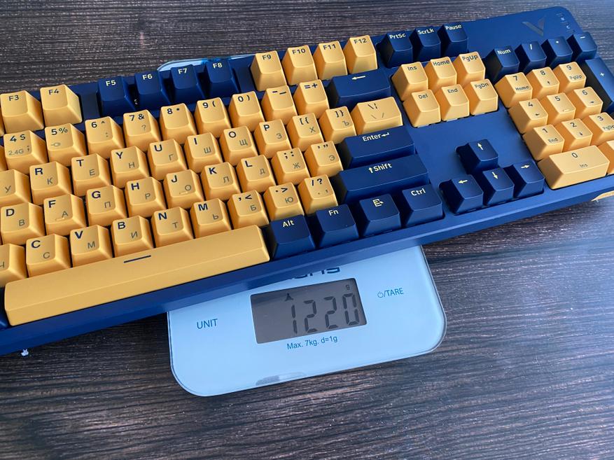 Клавиатура весит 1 кг 220 грамм. Клавиатура имеет следующие размеры 39.4 мм x 44 мм x 13 мм.