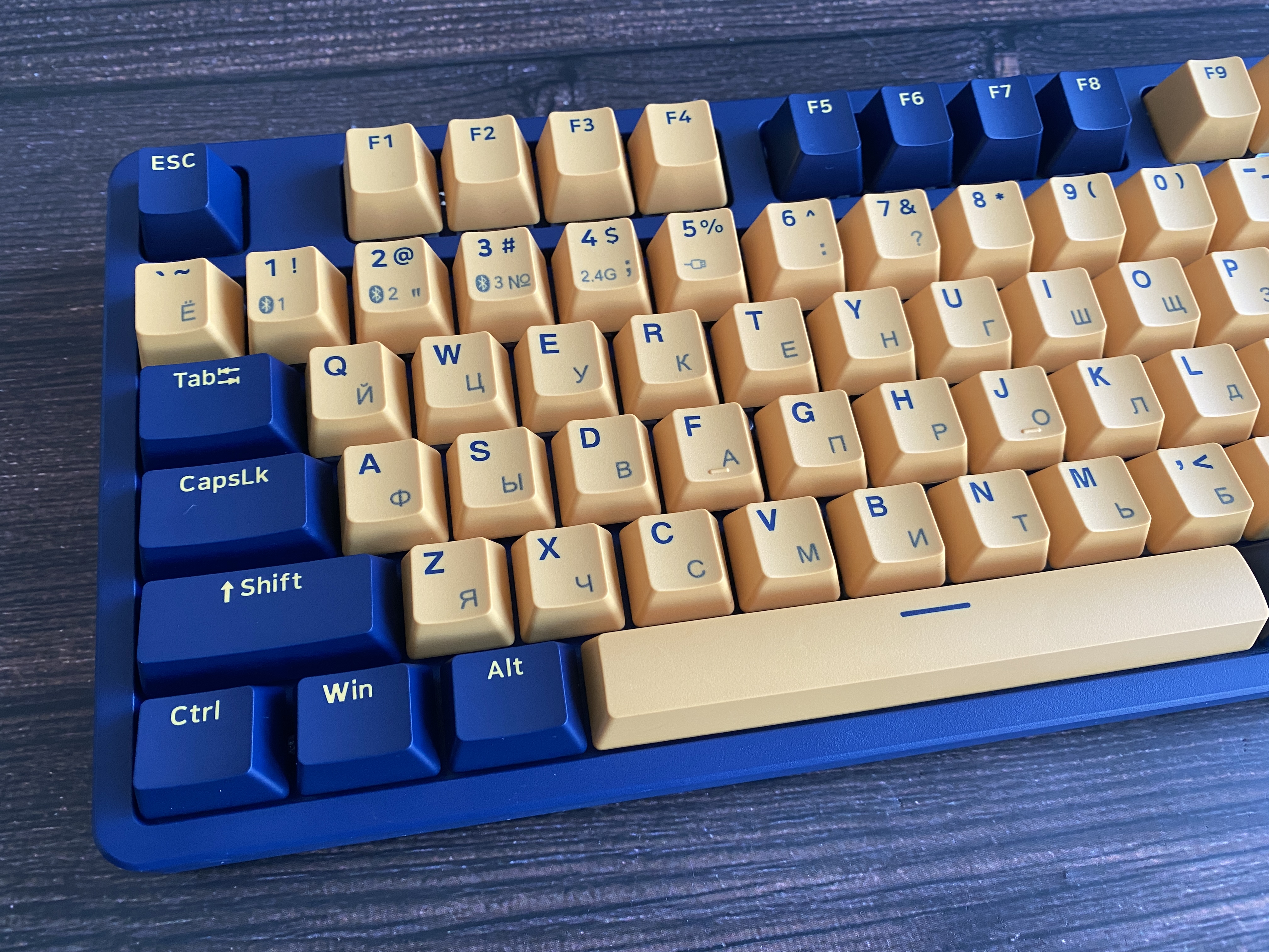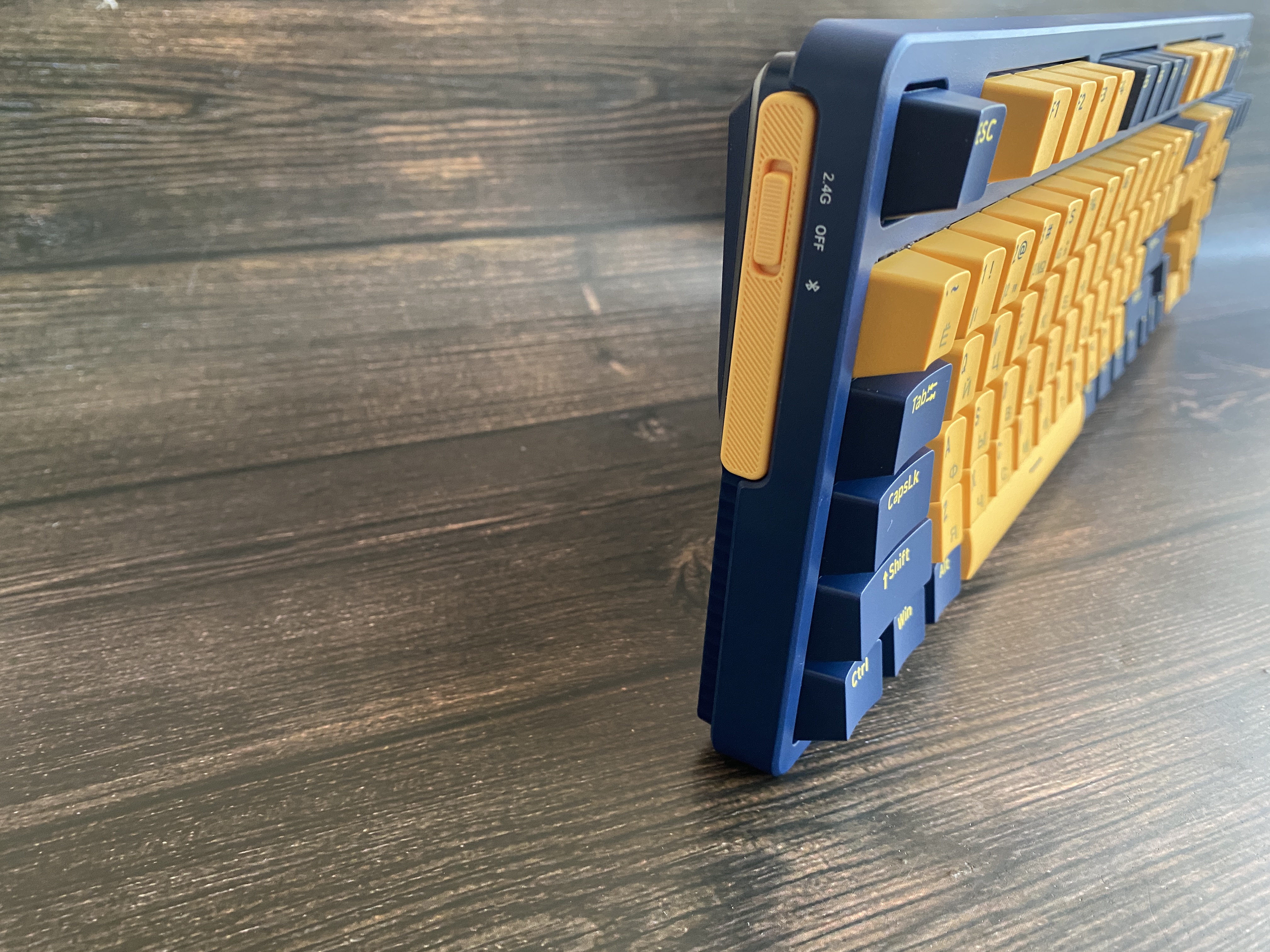 Основание клавиатуры выполнено из алюминия, что определенно добавляет устойчивость к механическим воздействиям. На левой части корпуса клавиатуры имеется переключатель для включения беспроводного соединения Bluetooth 5 версии или радиоканал 2,4 ГГц. Клавиатура имеет беспроводное подключения, но это не значит, что клавиатурой нельзя пользоваться по USB кабелю. Для включения проводного соединения, пользователю необходимо нажать комбинацию клавиш FN+5. Также можем заметить, что на клавишах 1.2.3 имеется обозначение Bluetooth, которое подразумевает переключение между разными устройствами. Комбинация клавиш Fn+4 активирует режим радиоканал 2,4 ГГц с заведомо включенным тумблером на боковой части.