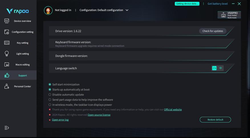 Для того чтобы расширить функционал клавиатуры, рекомендуется скачать и установить программное обеспечение. Интерфейс не имеет русского языка, но продвинутые пользователи без труда смогут разобраться и настроить клавиатуру под свои нужды. В ПО пользователь может настроить режимы подсветки, такие как скорость, яркость, запрограммировать (добавить) макросы, переназначить макросы. Также пользователь может создать и сохранить до 7 профилей под конкретную задачу.