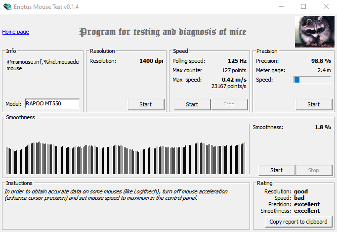 Программа Enotus Mouse Test (я одна называю ее «тест Енота»?) показала хорошие результаты для офисной мышки. Хоть и есть у меня вопрос к DPI, ведь выставлялось максимальное 1600.