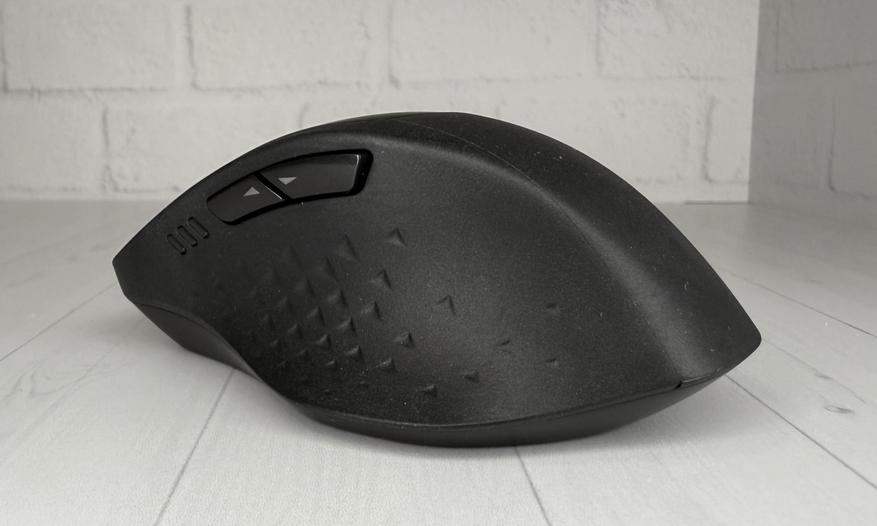 На правом боку мышки пусто. А вот на левом боку, сразу под ЛКМ, можно увидеть 2 кнопки (пролистывание вперед — назад) и индикатор Bluetooth-соединения, состоящий из трех сегментов-палочек.