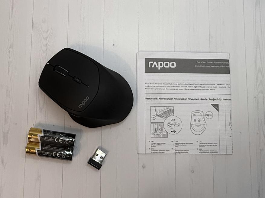 Комплектация простая: мышка RAPOO, USB-ресивер, инструкция, 2 батарейки АА (бренд Nanfu).