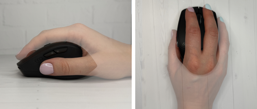Габариты устройства: 103 х 69 х 43 мм. Что касается удобства — для моей небольшой руки мышка подошла идеально, эргономика устройства на высоте: удобны были все виды хватов. Возможно только, что обладателям крупных рук будет некомфортно.