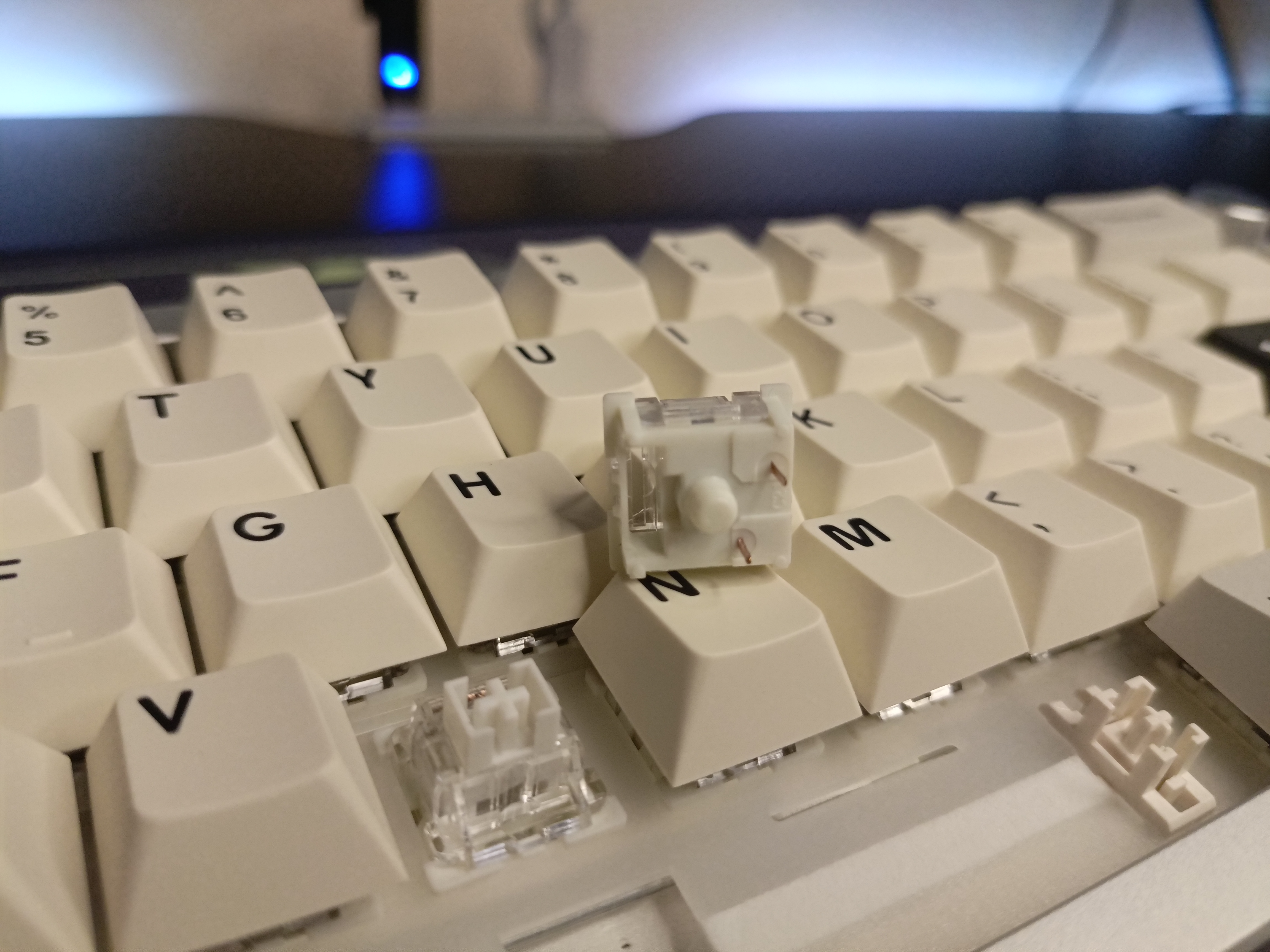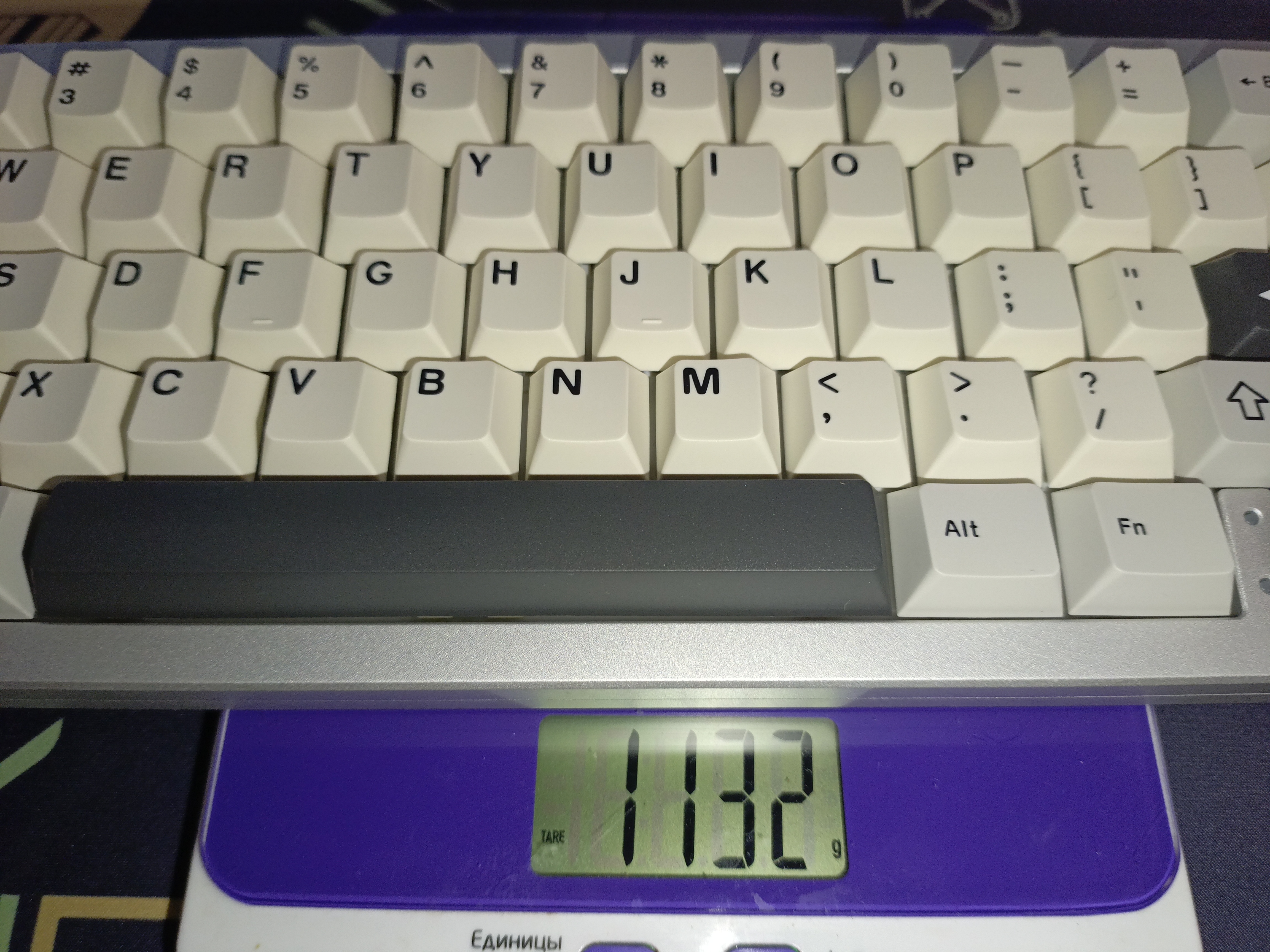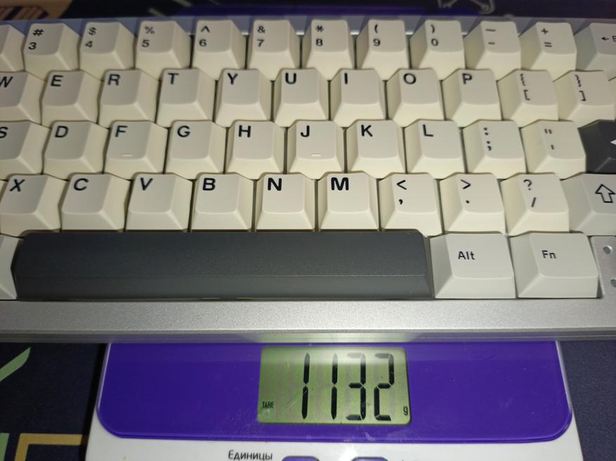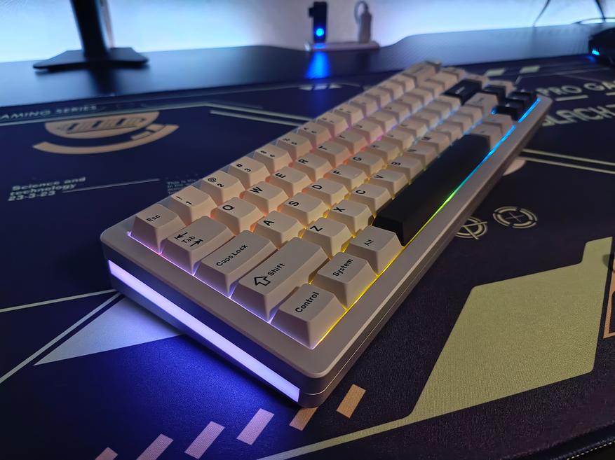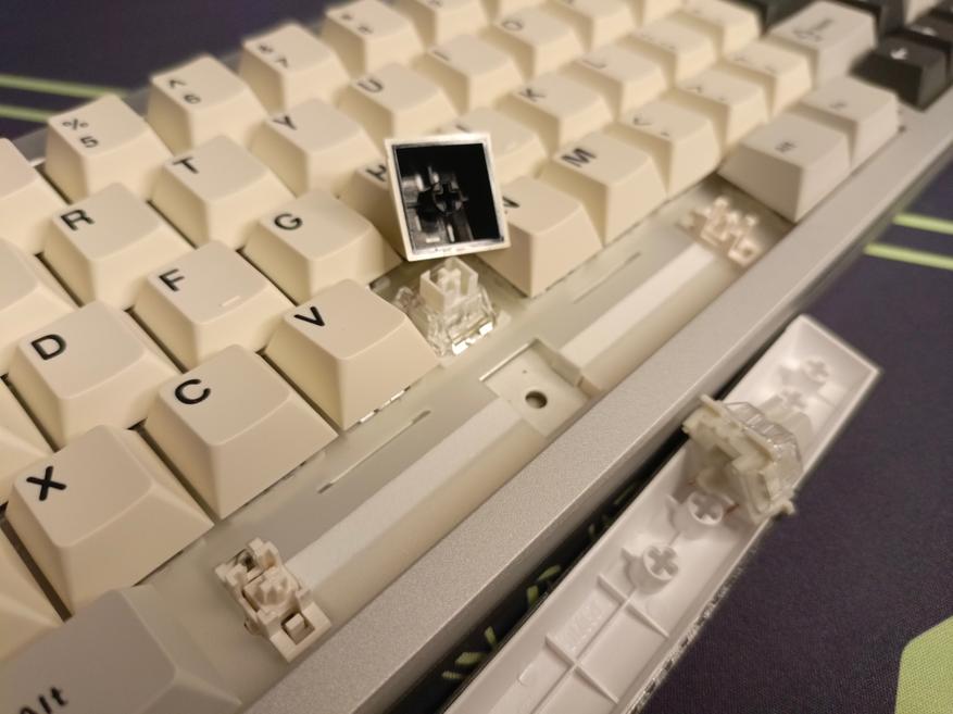 Клавиши изготовлены по технологии PBT Cherry — двойное литьё. Свитчи установлены Milk Switch. Скелет клавиатуры изготовлен по технологии Gasket Mounted. Толщина пластика на всех клавишах 1.4 мм, а сами по себе они квадратные с размером 18х18 миллиметров. У клавиши пробел по бокам установлены стабилизаторы, которые обеспечивают равномерное нажатие. Длина клавиши пробел — 118 мм.