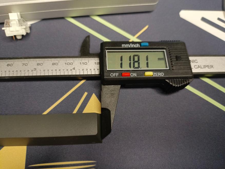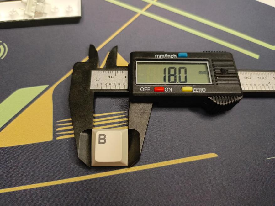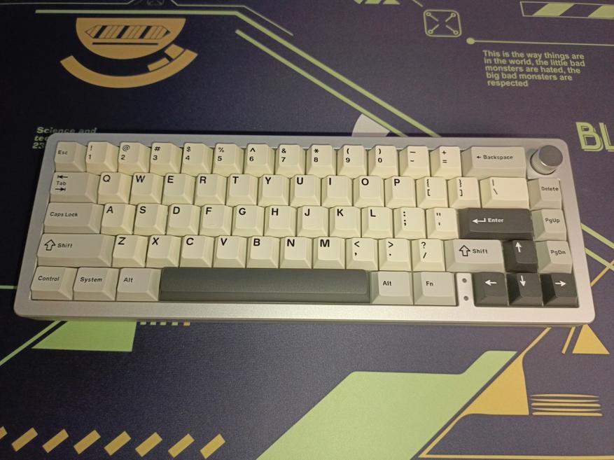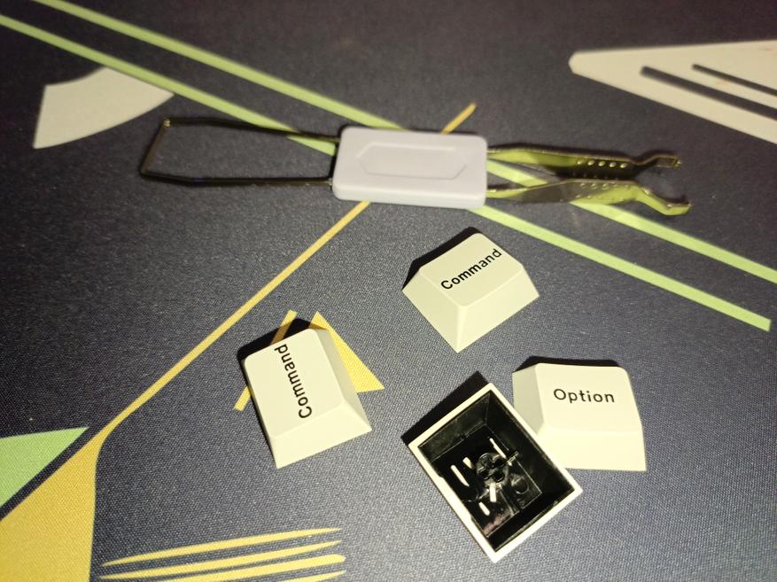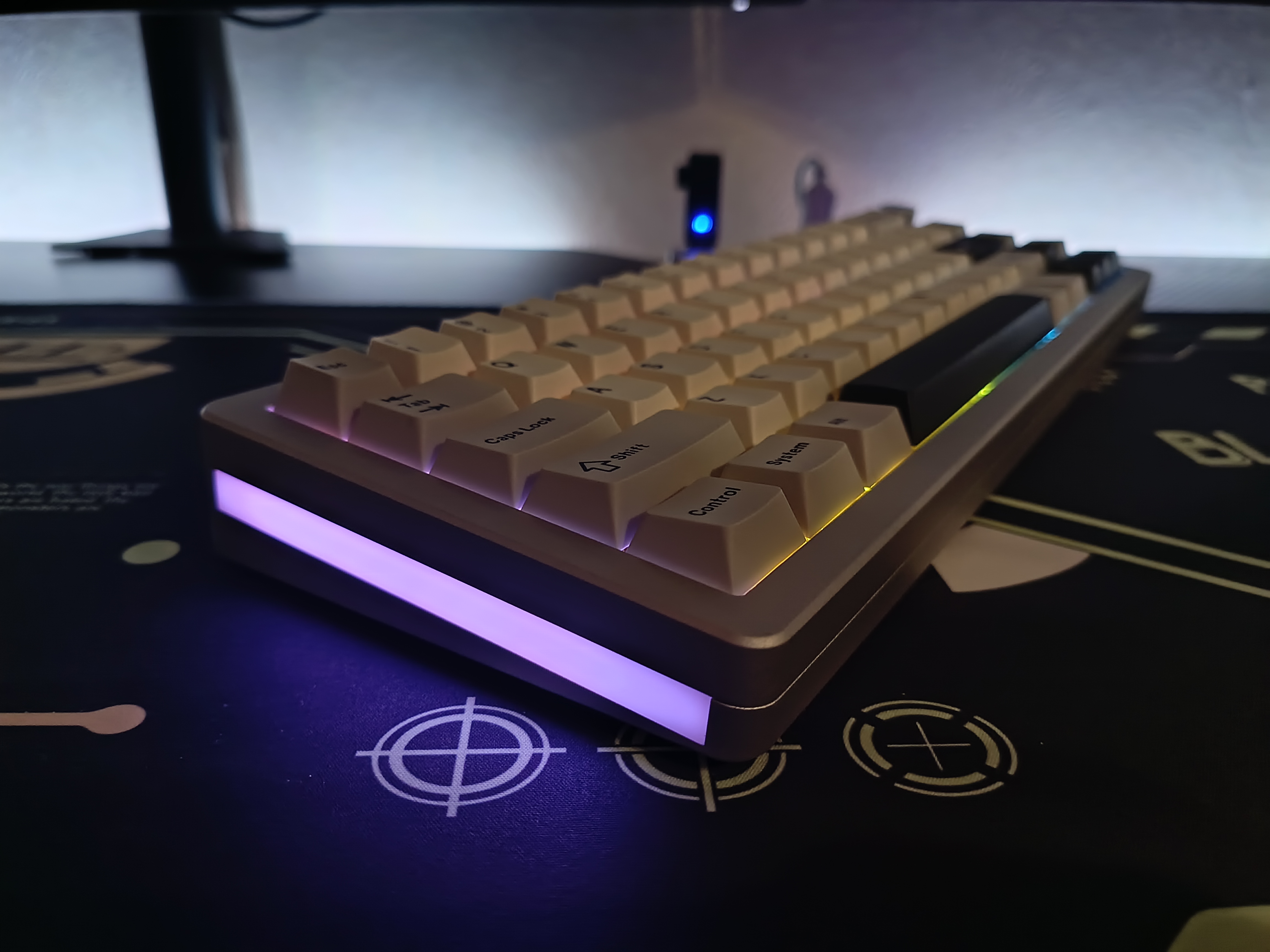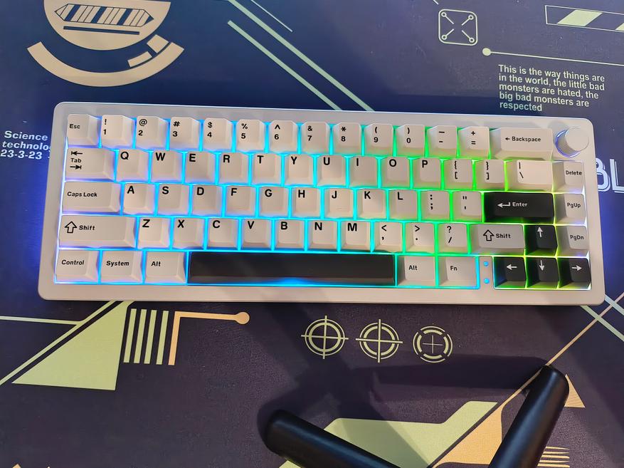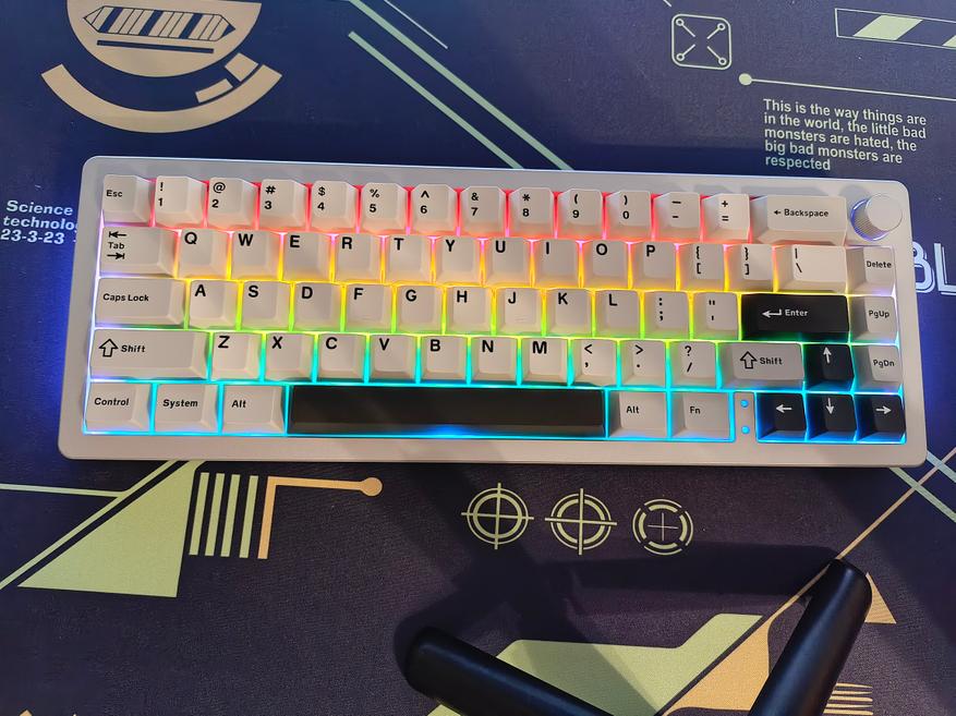 Клавиши изготовлены по технологии PBT Cherry — двойное литьё. Свитчи установлены Milk Switch. Скелет клавиатуры изготовлен по технологии Gasket Mounted. Толщина пластика на всех клавишах 1.4 мм, а сами по себе они квадратные с размером 18х18 миллиметров. У клавиши пробел по бокам установлены стабилизаторы, которые обеспечивают равномерное нажатие. Длина клавиши пробел — 118 мм.