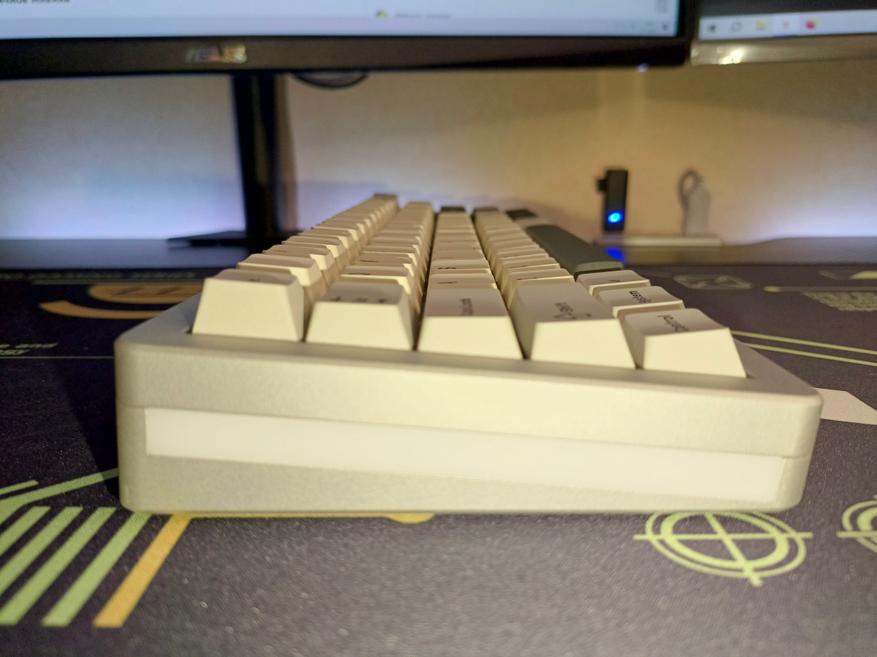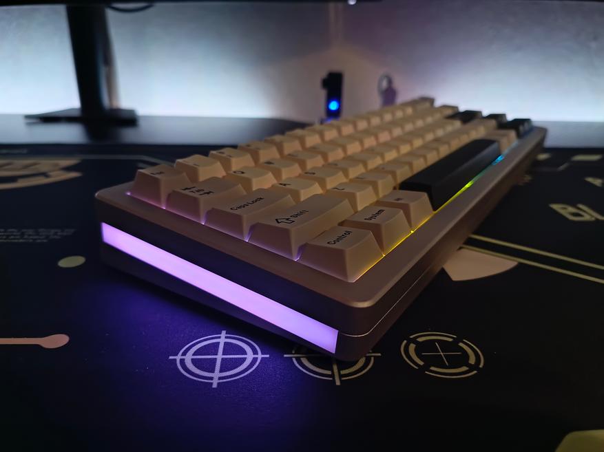 Основная часть клавиатуры сделан из алюминия поэтому она довольно тяжелая для своих размеров. Клавиатура весит 1132 грамма, а ее размеры следующие: 322*113*42 мм. На выбор есть ещё два цвета корпуса: черный и розовый. Регулировки наклона в этой модели нет. В правом углу установлен энкодер, который работает в двух режимах: изменение яркости подсветки или регулировка громкости. Переключение осуществляется путем нажатия на энкодер в течение пару секунд.
