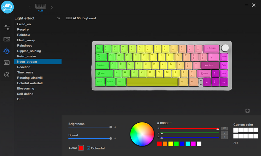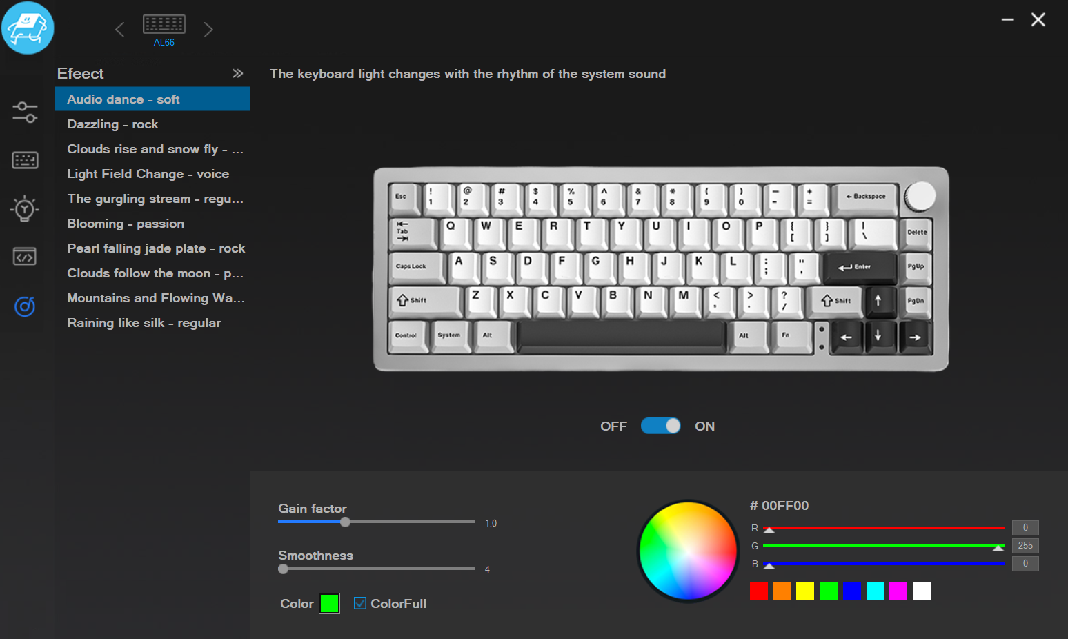 Yunzii AL66 оснащена RGB-подсветкой, которая позволяет использовать различные цвета и режимы свечения. Это делает клавиатуру привлекательной и функциональной в темное время суток или при плохом освещении. Кроме того, можно настроить яркость подсветки и скорость ее изменения с помощью программного обеспечения, которое идет в комплекте с клавиатурой. Также можно переключать режимы и изменять яркость с помощью комбинации клавиш. ПО скачивается с официального сайта производителя.